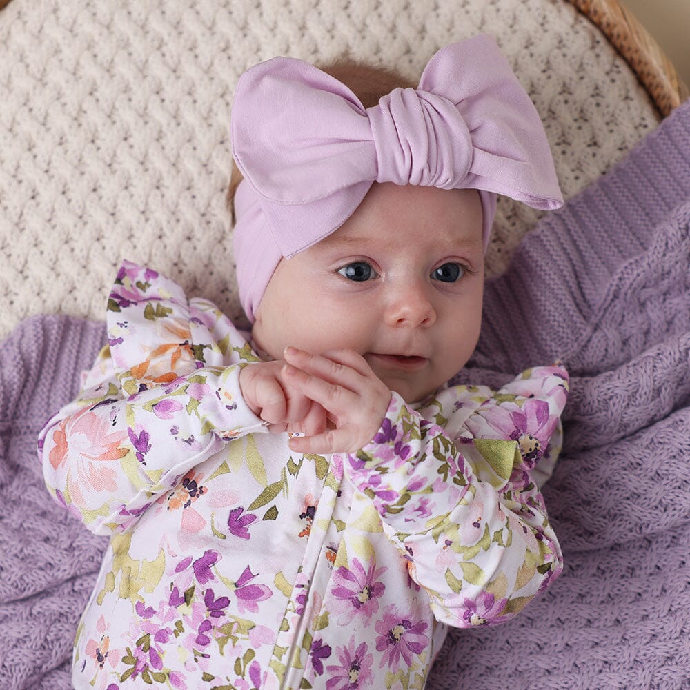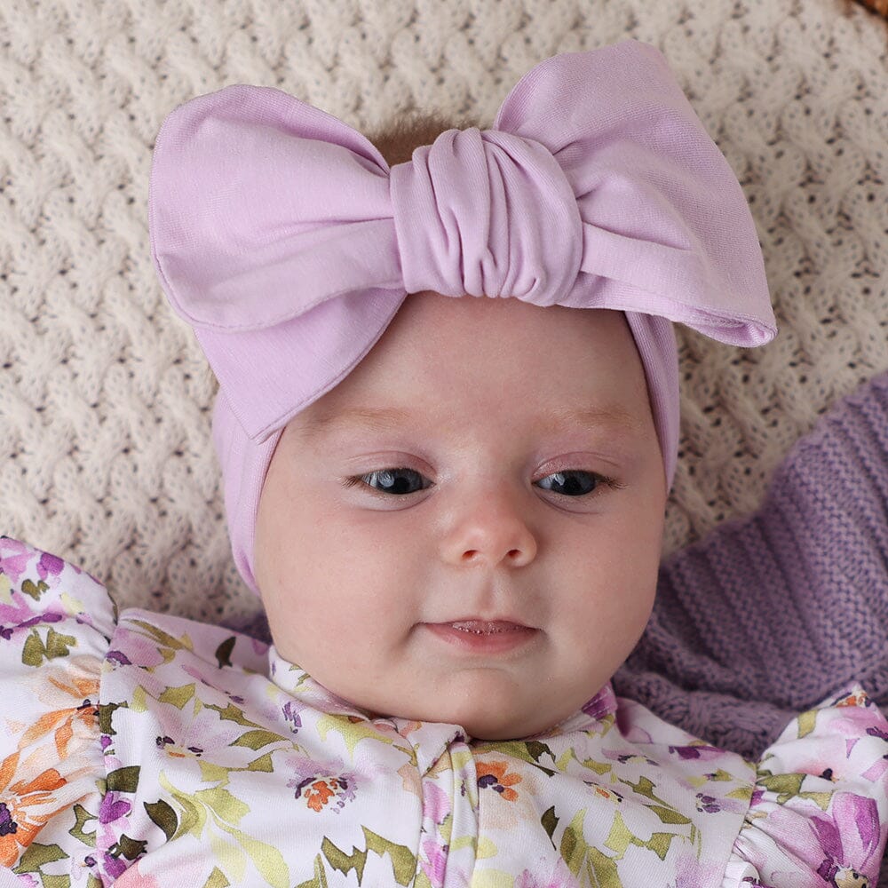 Our Lilac oversized bow is made from our signature certified organic cotton jersey - soft and stretchy. It arrives pre-tied and will stretch to fit over baby's head, but can be un-tied and re-tied to your preference.