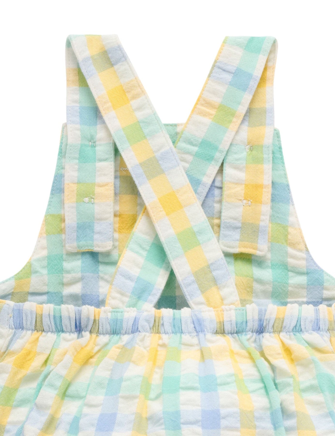 Summer days are here in our Check Overall. Featuring an all over check pattern, adjustable cross over straps and snap clips at the leg for easy dressing. Made from a lightweight 100% Organic Cotton seersucker for a soft and breathable style.