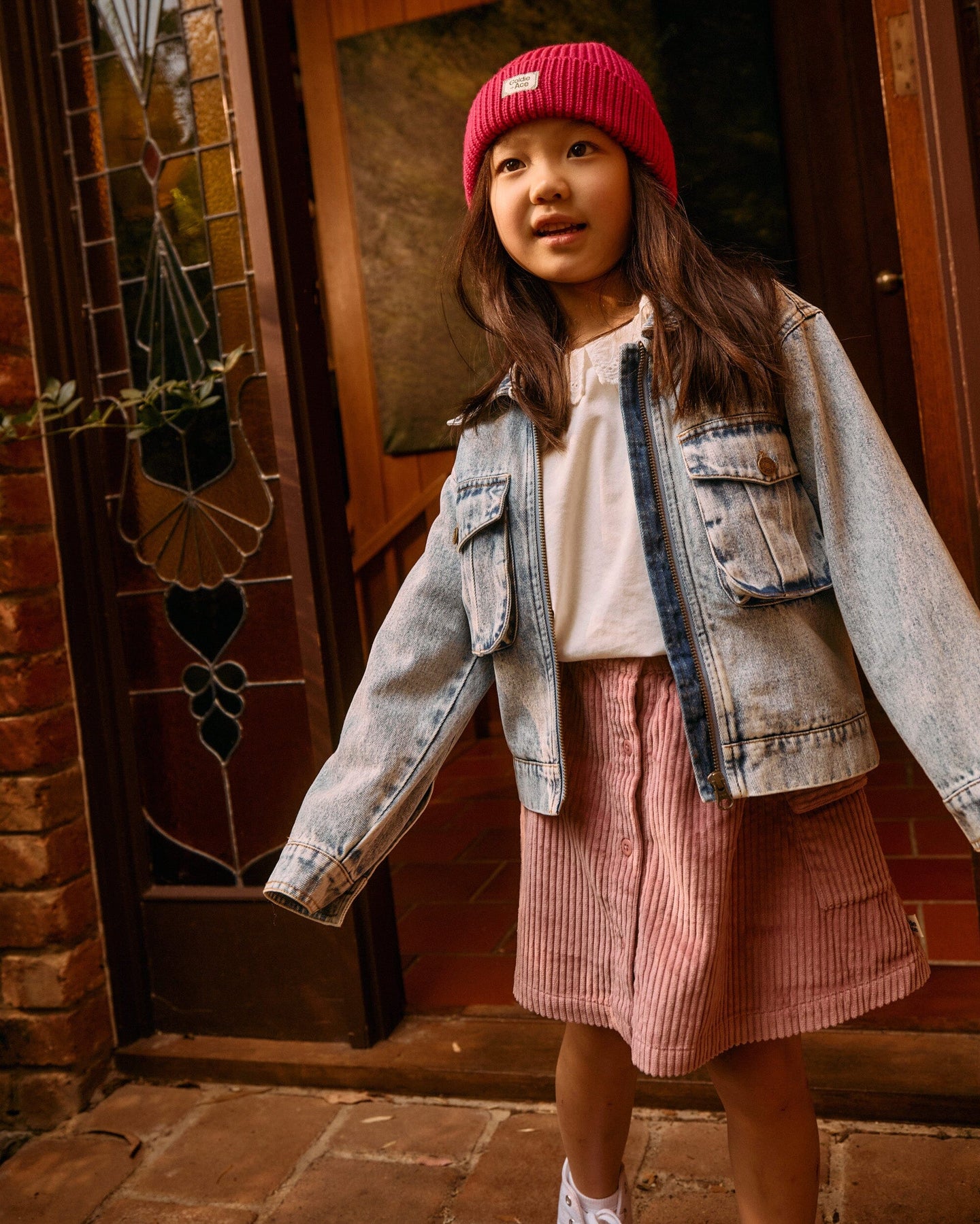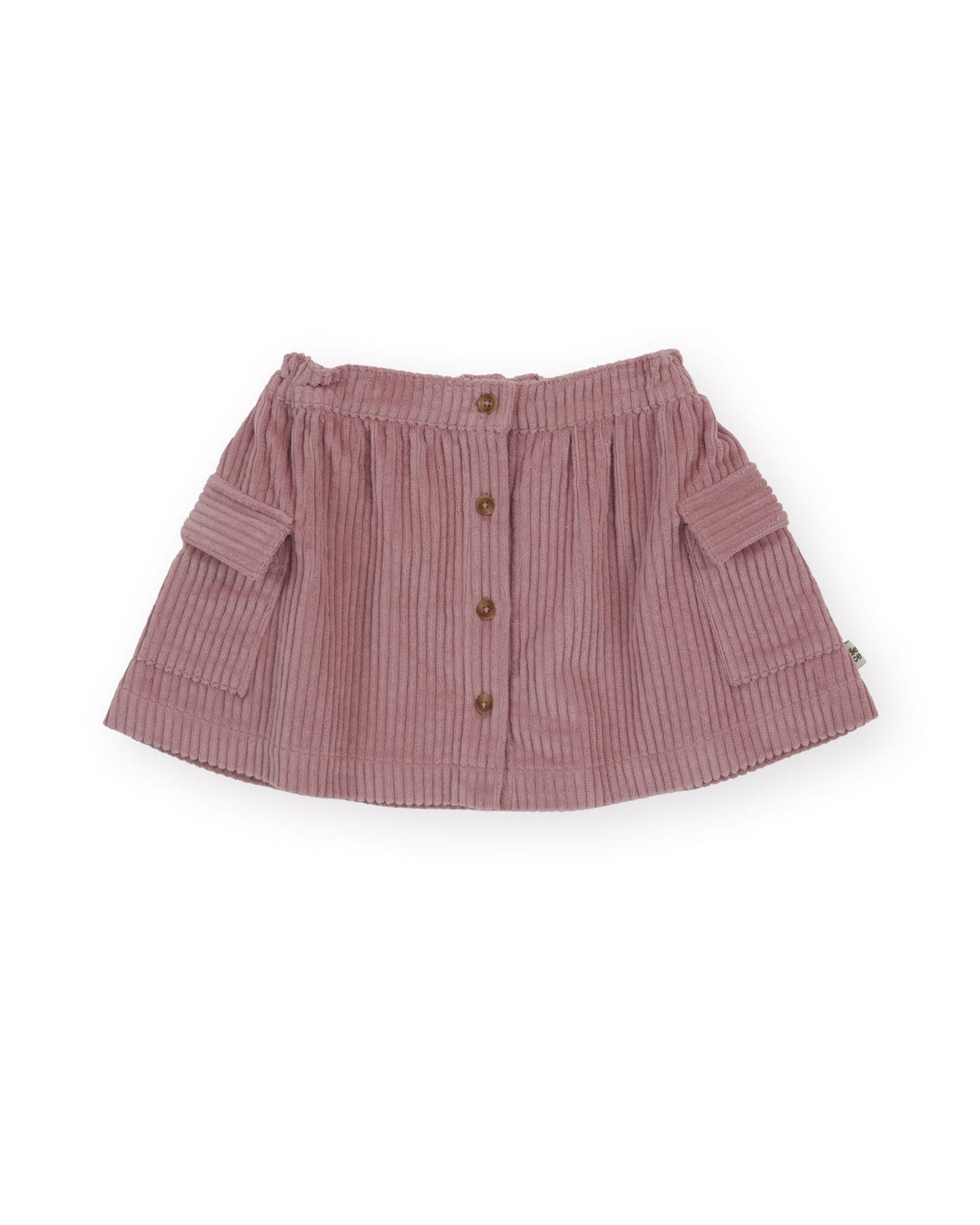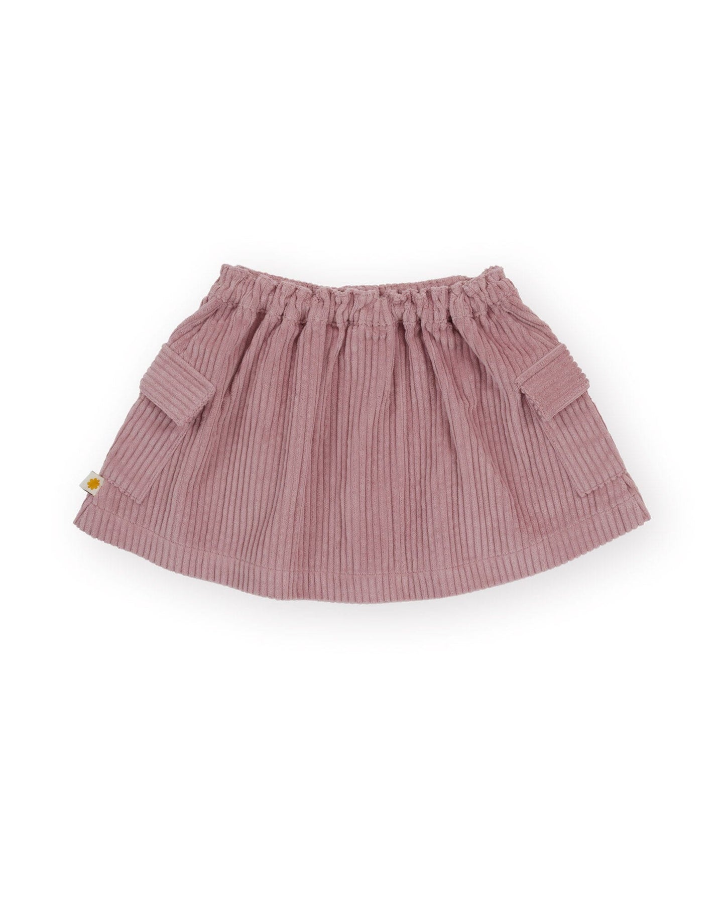 A-line skirt in dusty pink features a snap front opening and an elasticated back waist for easy wear. Crafted from heavy weight corduroy, this piece is designed in Australia by Goldie + Ace.