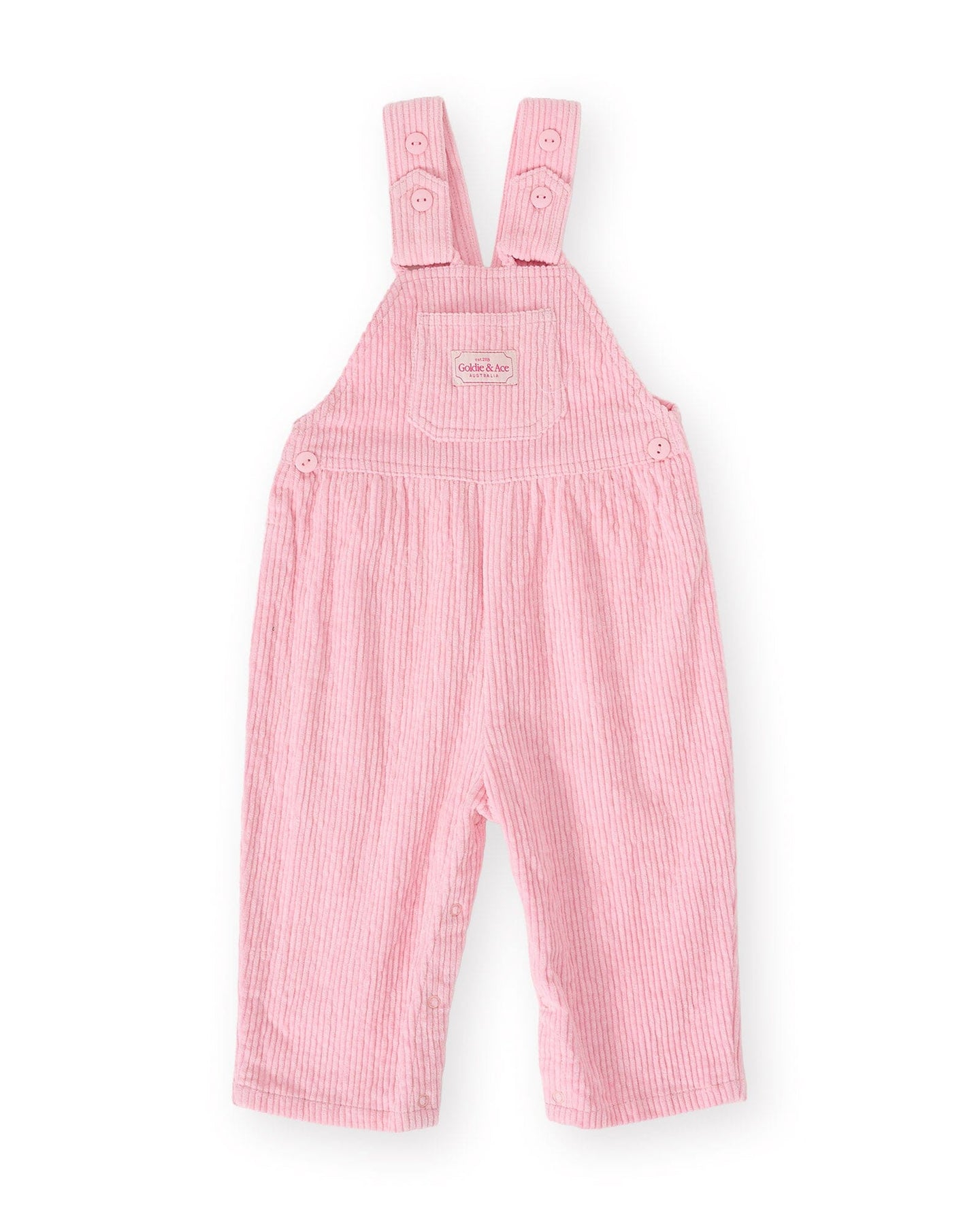 Soft and durable, these pink overalls from Goldie + Ace feature adjustable button shoulder straps for a comfortable fit. The heavy-weight corduroy offers a gentle touch, while leg snaps up to size 2Y ensure easy changes.