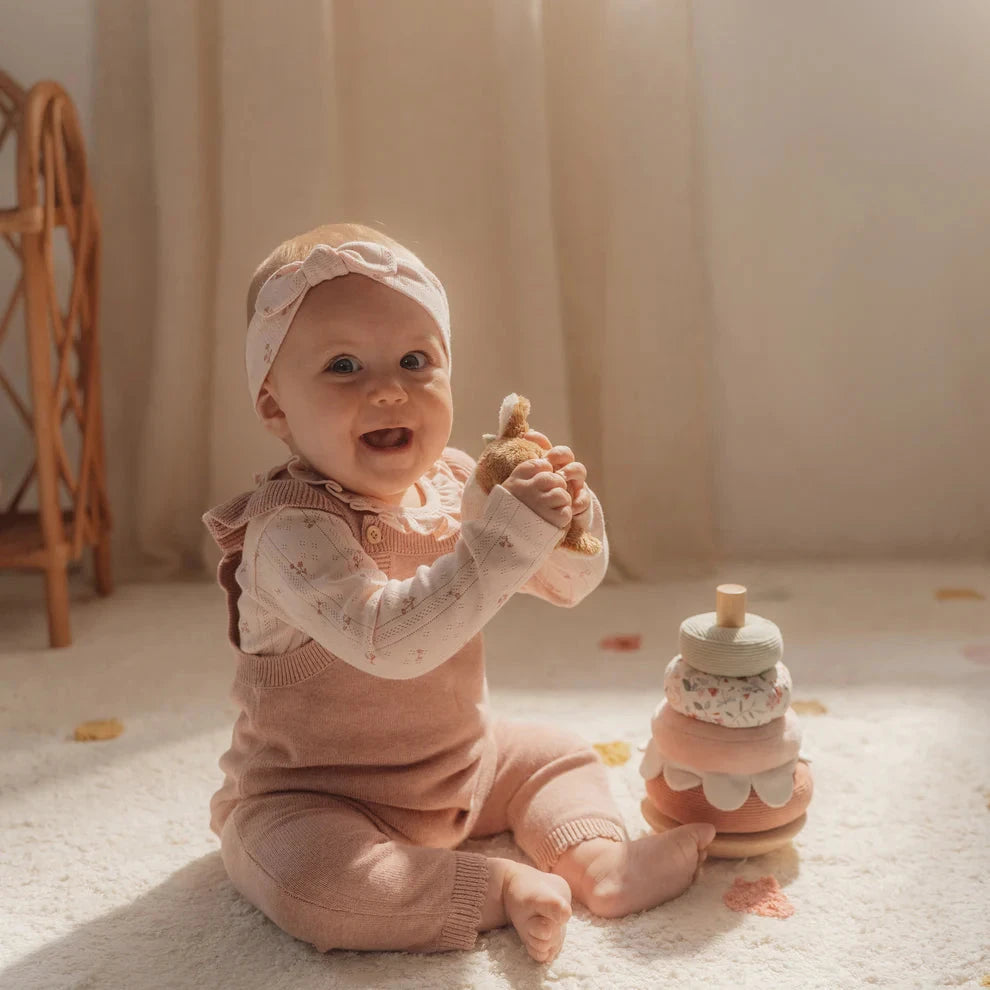 Stack the rings and enjoy the gentle wobble! This charming plush rocking ring stacker adds an extra layer of fun to classic stacking play. As the wooden base rocks back and forth, little ones are encouraged to focus, balance, and keep trying. Each of the four rings features a unique Fairy Garden–inspired design, and once the stack is complete, the deer on top spins and “dances” to celebrate the achievement. A delightful way to support hand-eye coordination while turning playtime into a joyful challenge.