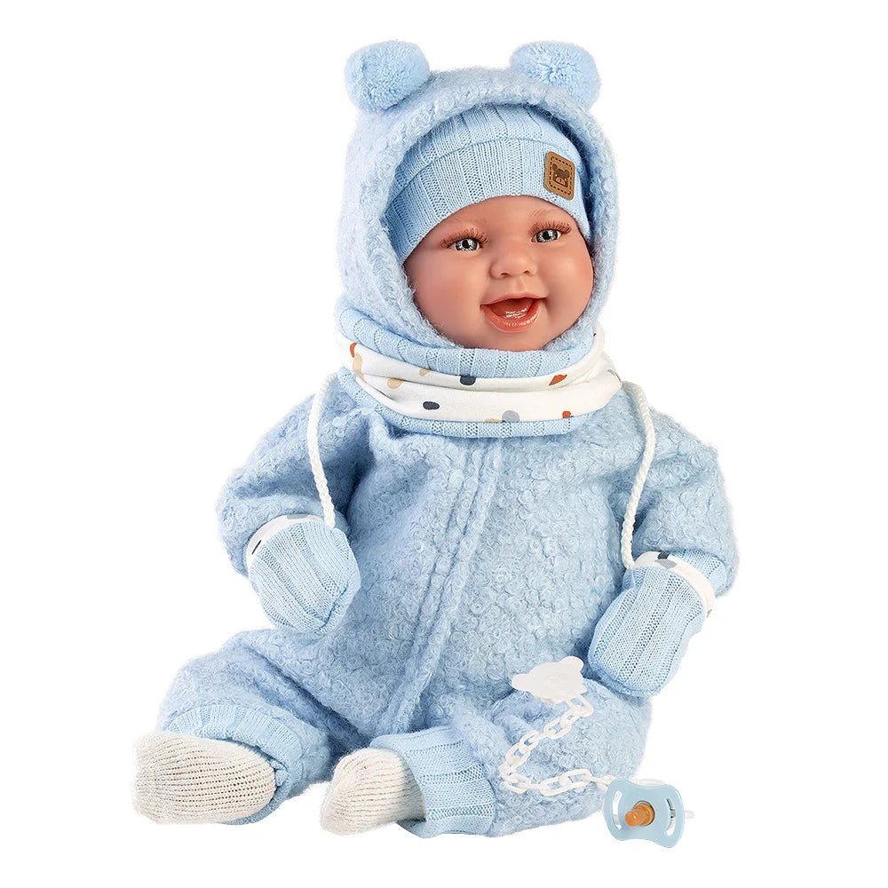 Meet Talo, a joyful baby dressed snugly in a cozy blue jumpsuit that perfectly matches his hat, gloves, and scarf. Soft to the touch with a cuddly fabric body, Talo is full of life and ready to brighten any child’s day.
