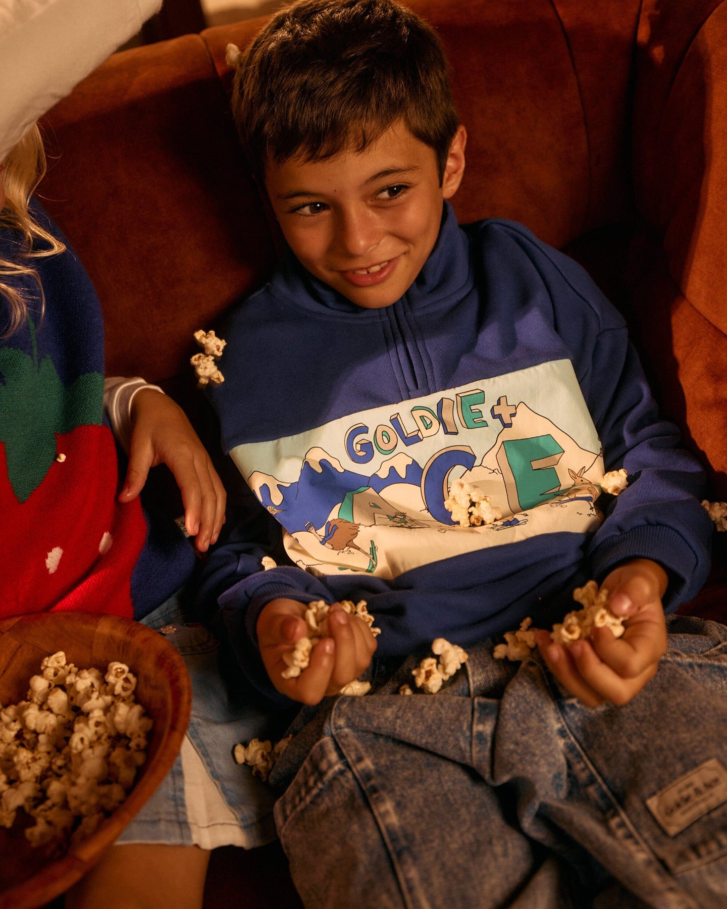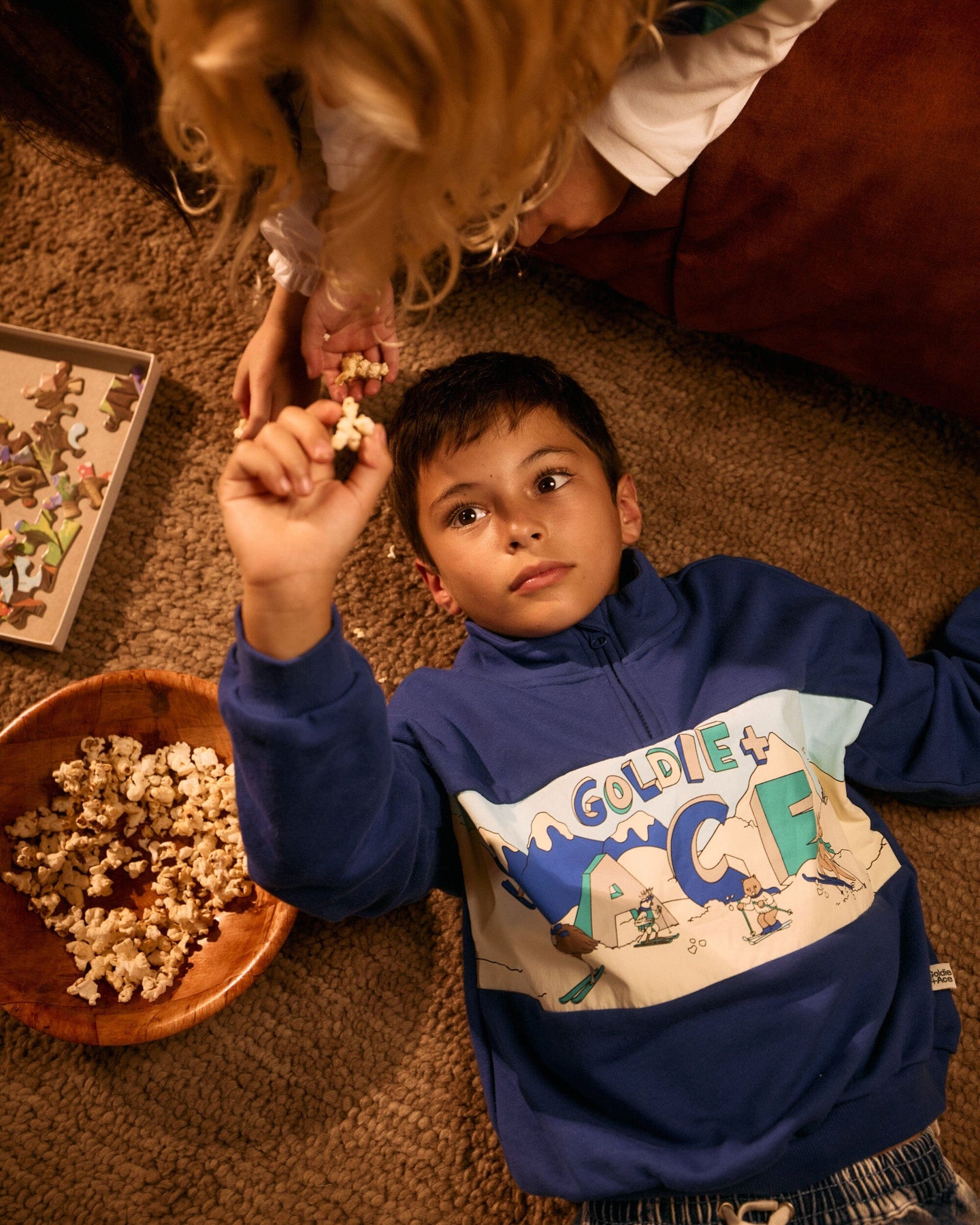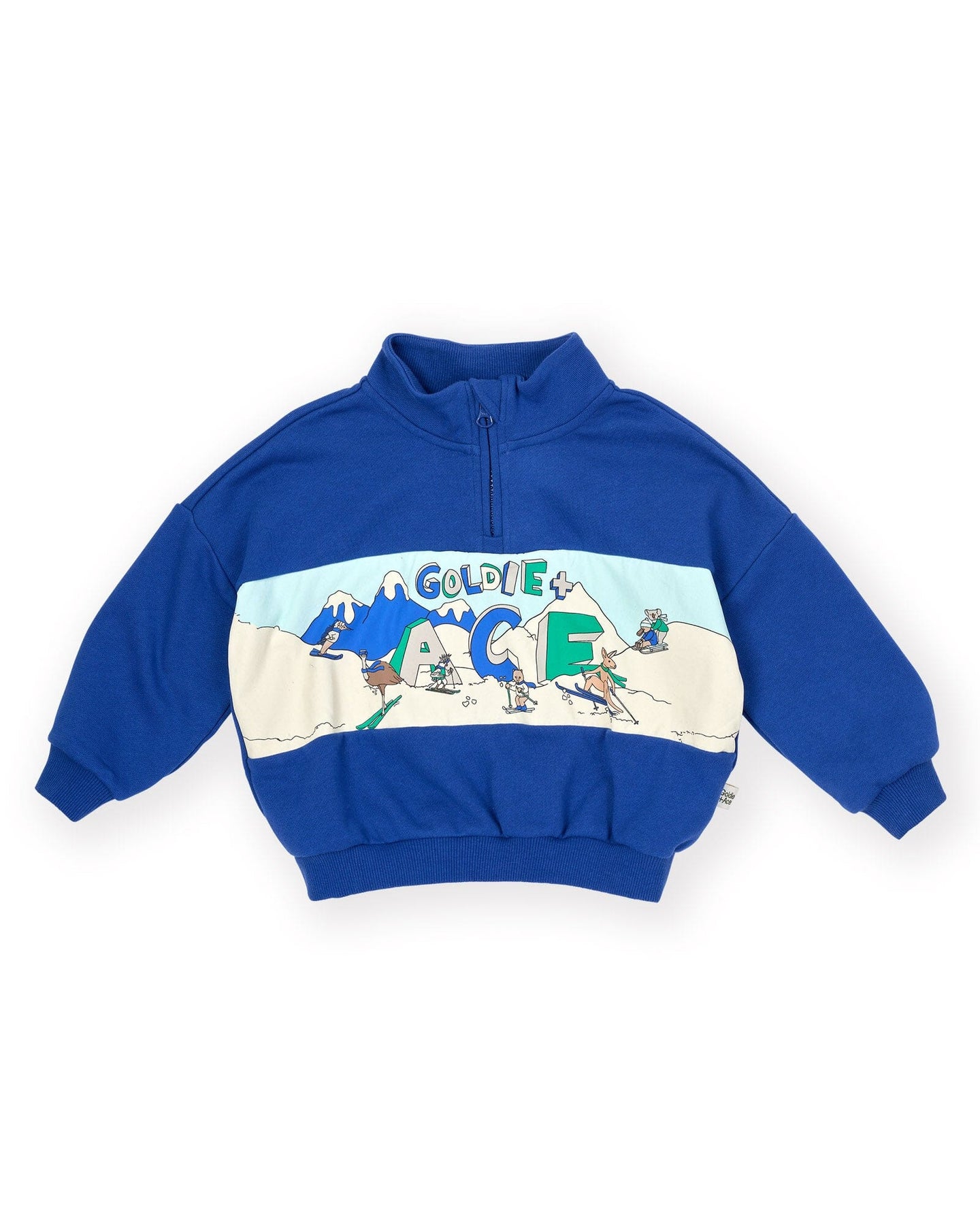 Keep your little one cozy in this cobalt blue quarter zip sweater from Goldie + Ace. Featuring a mid-weight loop back terry fabric and an inserted woven graphic panel, it's designed for comfort and style.