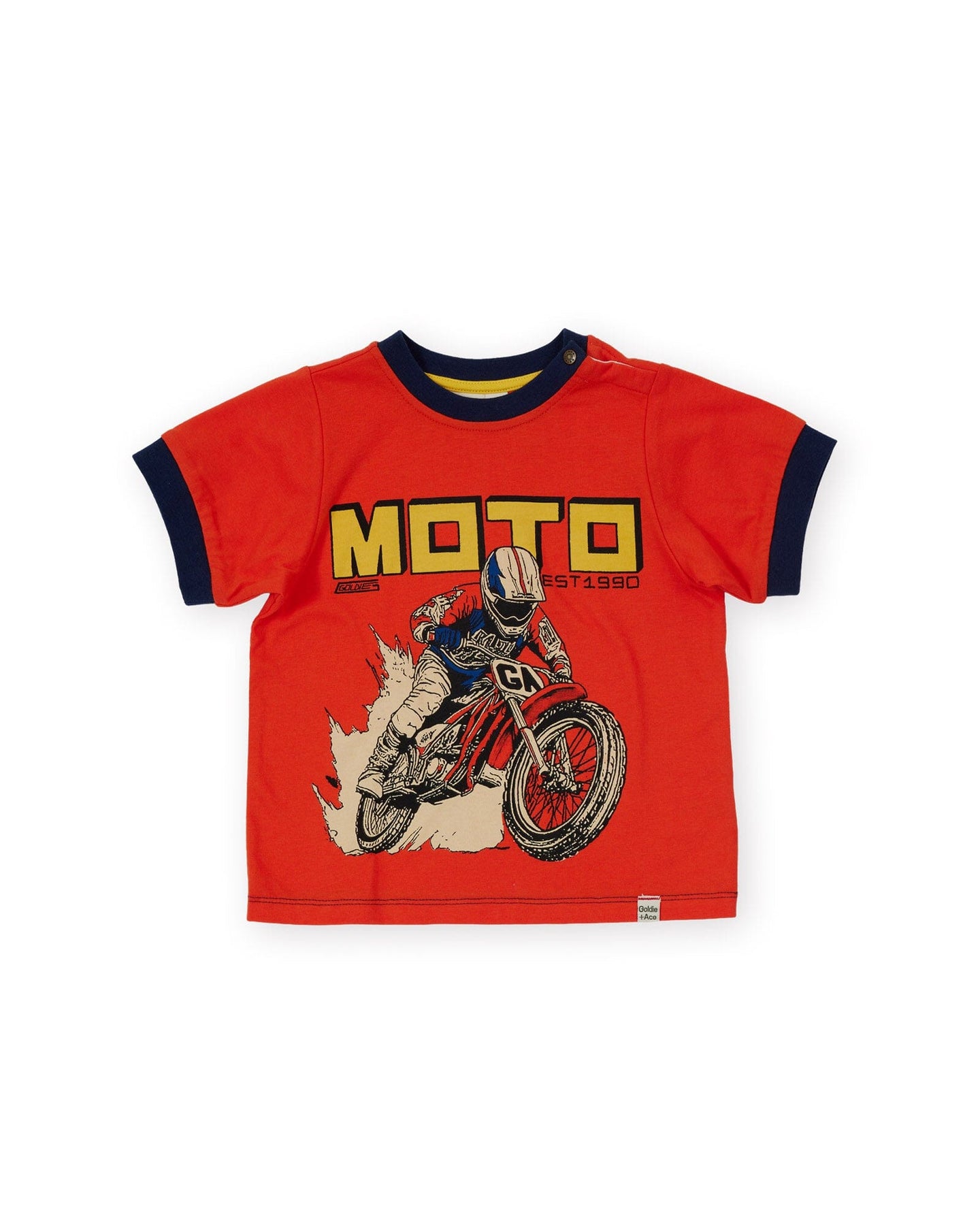 Rev up their wardrobe with this red Moto Ringer T-Shirt from Goldie + Ace.