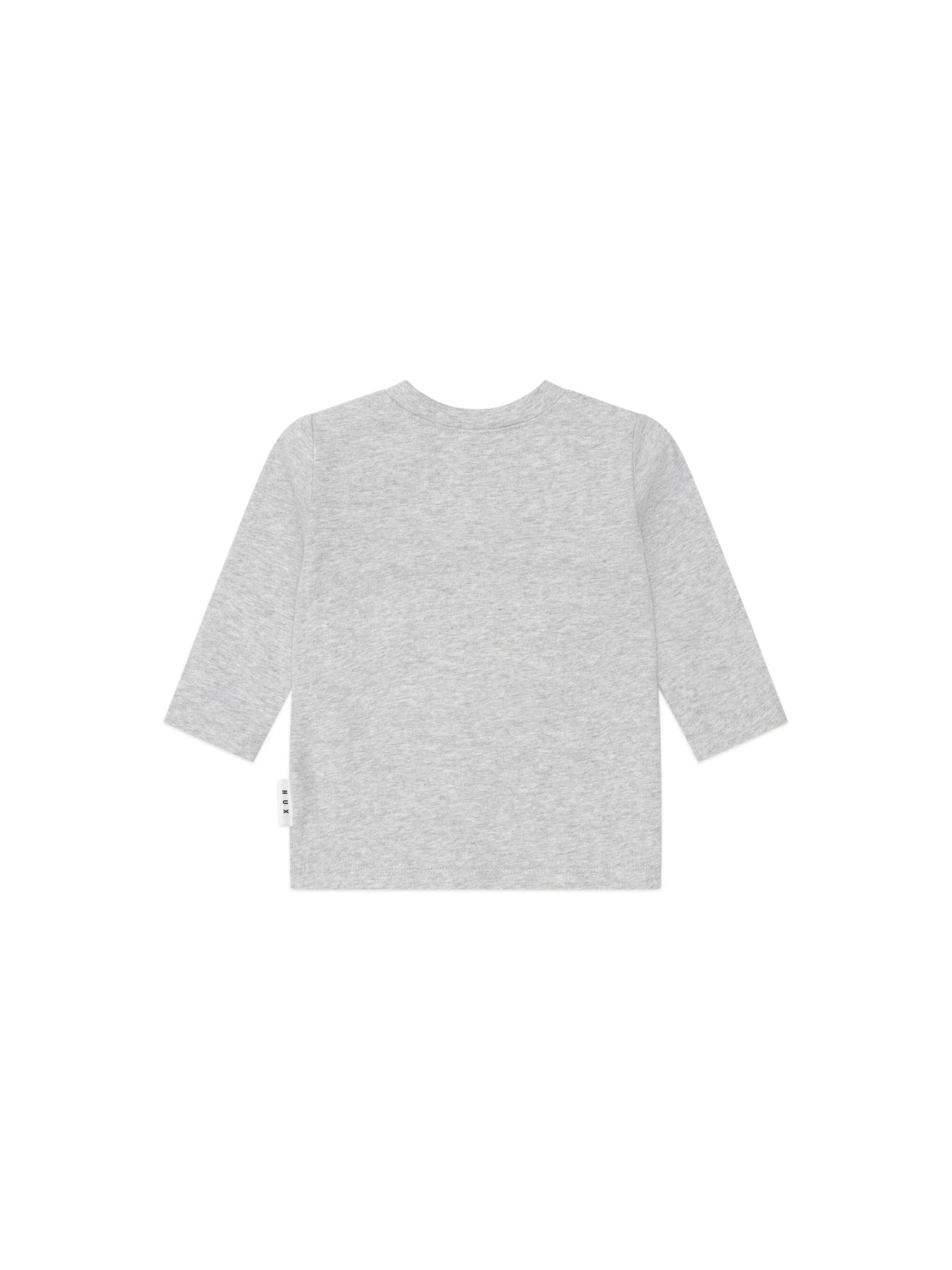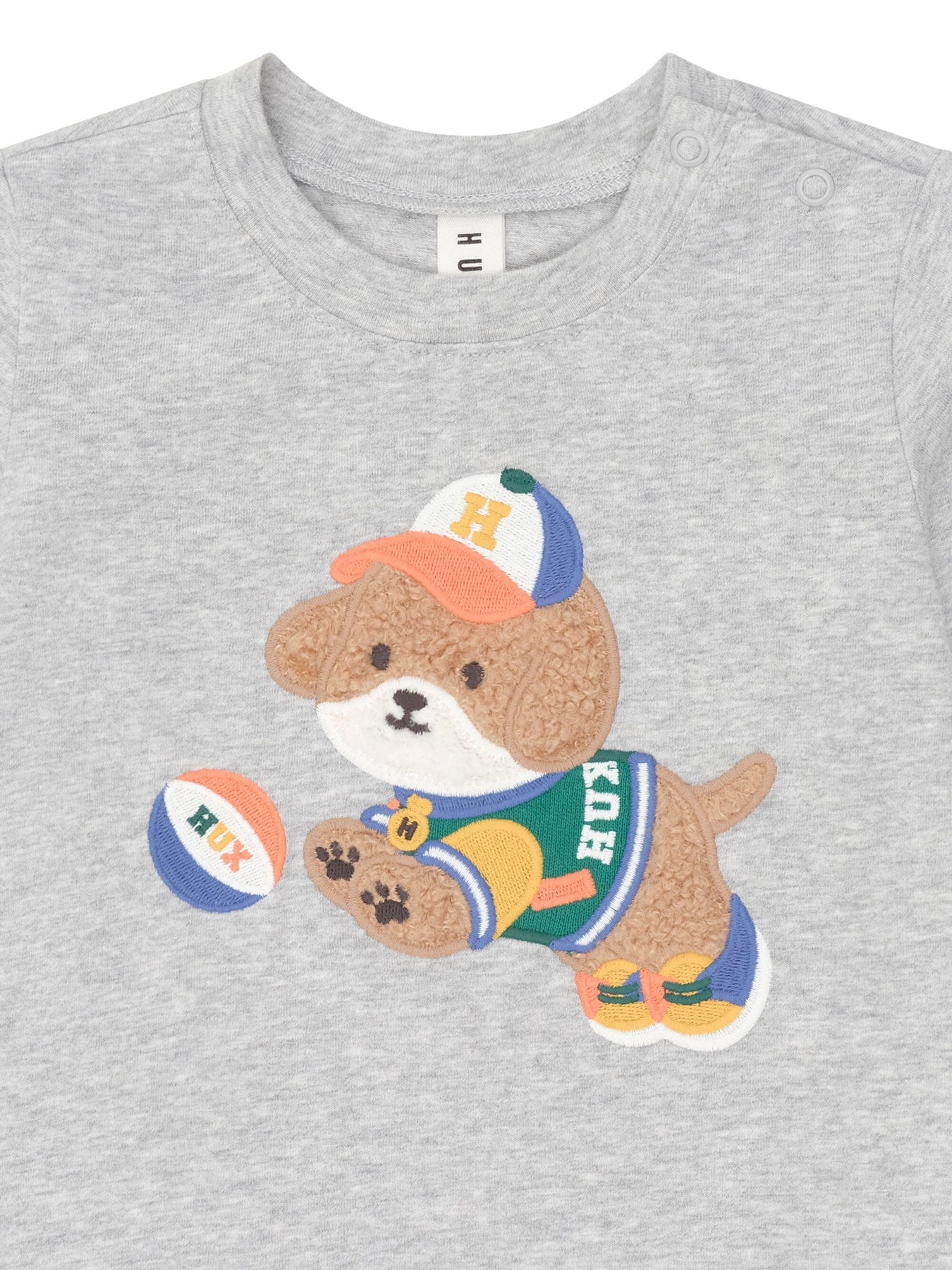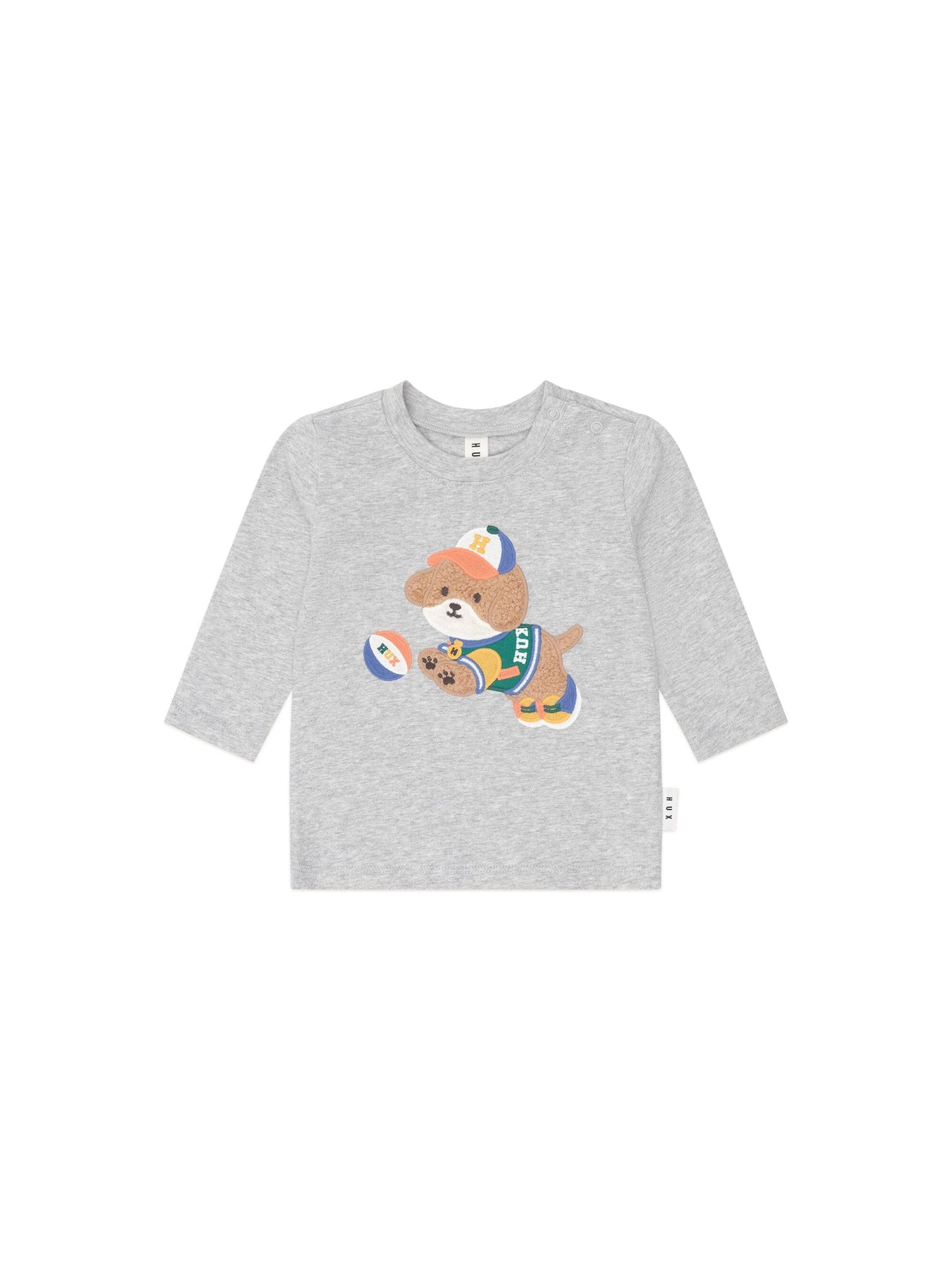 A long-sleeved round neck top in classic grey Marle. Made from cloud-like organic cotton, it features tummy-sized basketball doggy embroidery. Baby sizes include stainless steel shoulder snaps for even easier dressing.