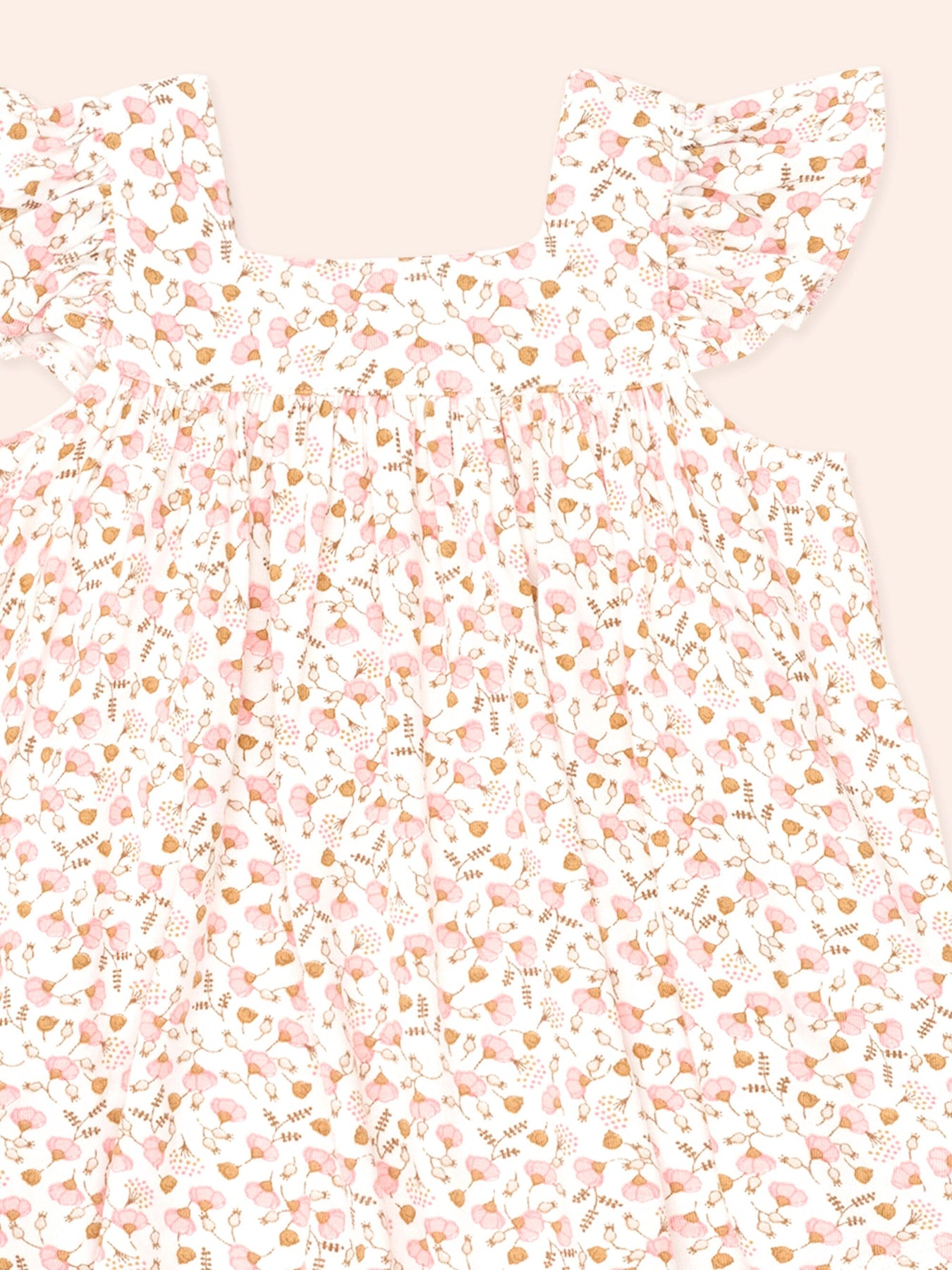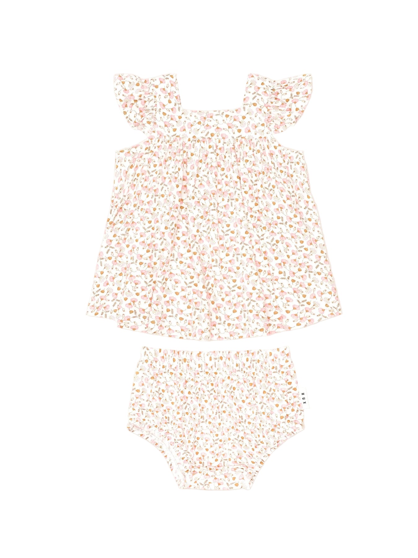 This marshmallow-soft two-piece bloomer set is their new staple. Features an all over custom hearts and bows print, frill sleeves, and stretchy bottoms for easy nappy changes. Just add squishy legs.