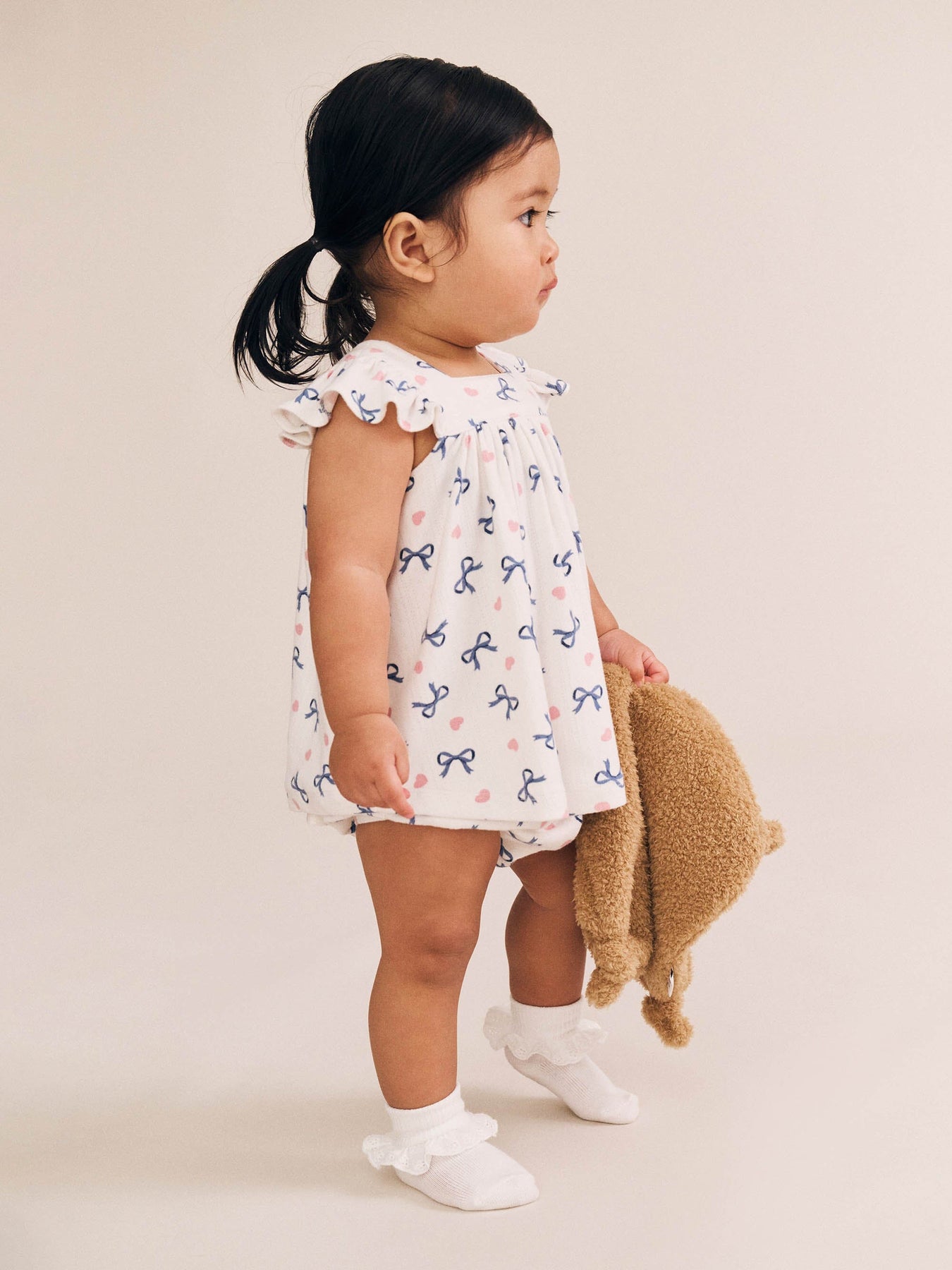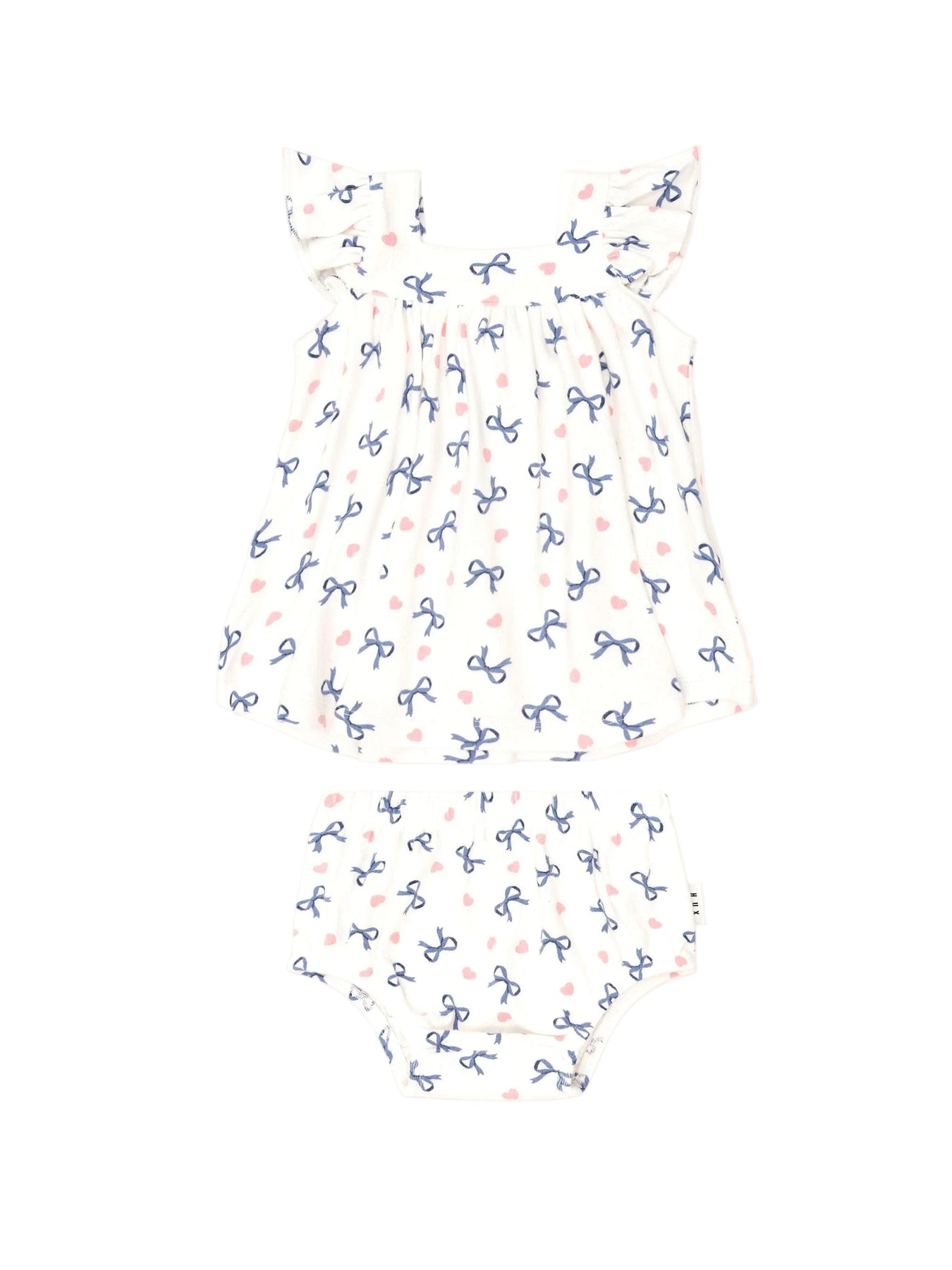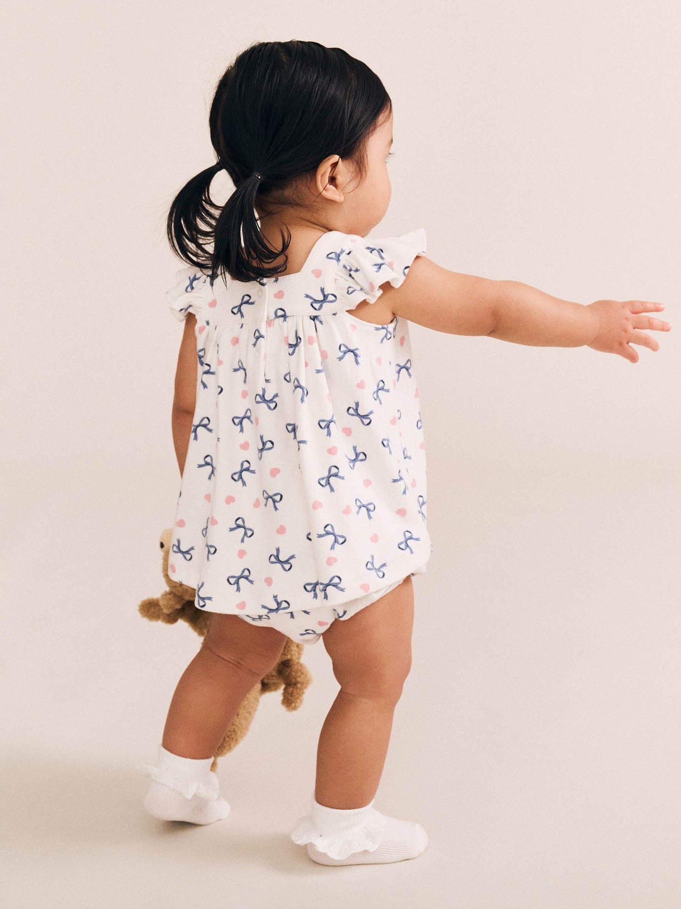 This marshmallow-soft two-piece bloomer set is their new staple. Features an all over custom hearts and bows print, frill sleeves, and stretchy bottoms for easy nappy changes. Just add squishy legs.