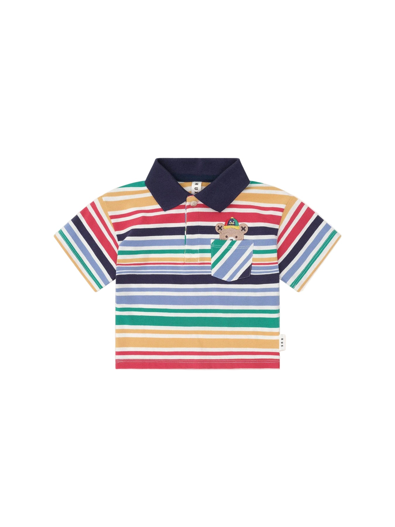 This short-sleeved polo in vintage stripes features a sporty, rugby-style collar and three buttons at the neck. Made from cloud-like organic cotton, it has a peeping Huxbear pocket detail and can be dressed up or down, depending on the day.