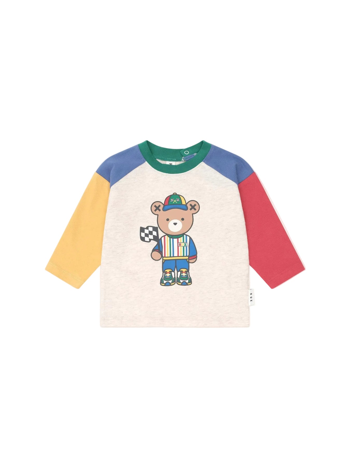 A long-sleeved round neck top in off white Marle colour blocking. Made from cloud-like organic cotton, it features tummy-sized motorsport Huxbear embroidery in the softest furry fabric. Baby sizes include stainless steel shoulder snaps for even easier dressing.
