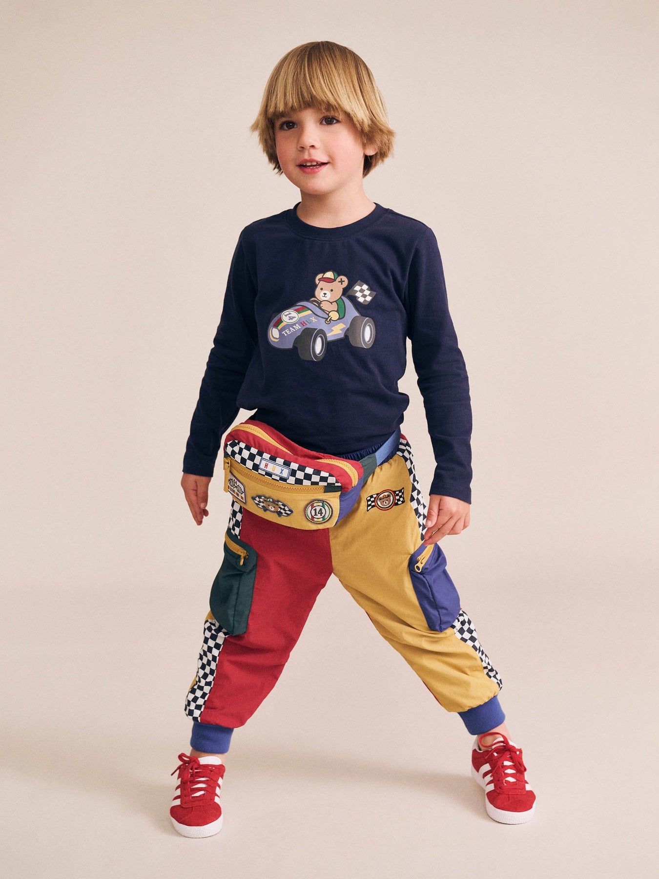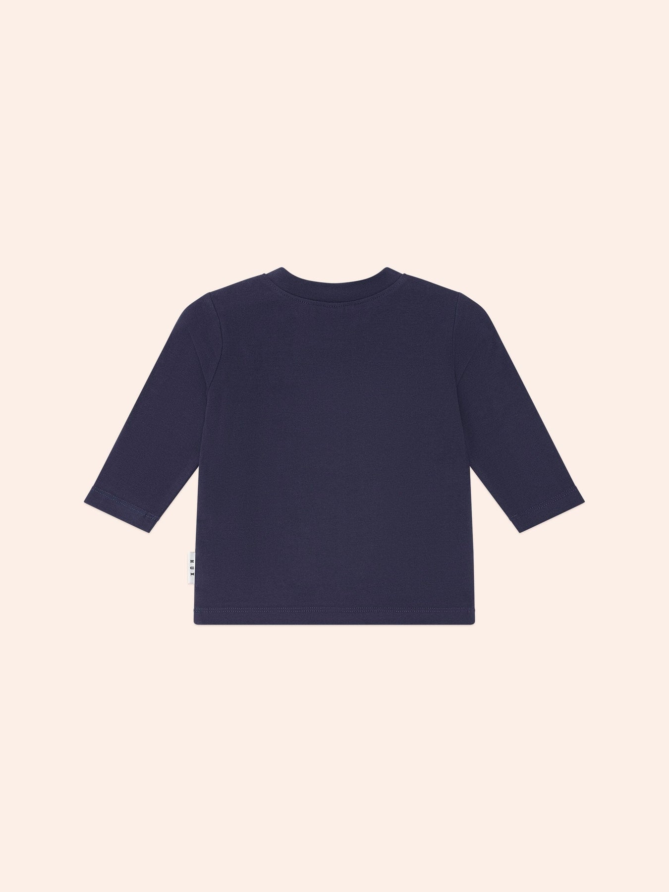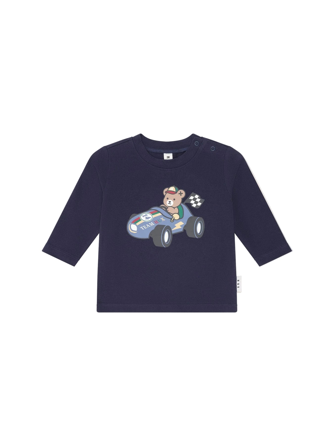A long-sleeved round neck top in classic navy. Made from cloud-like organic cotton, it features tummy-sized Huxbear racecar embroidery. Baby sizes include stainless steel shoulder snaps for even easier dressing.