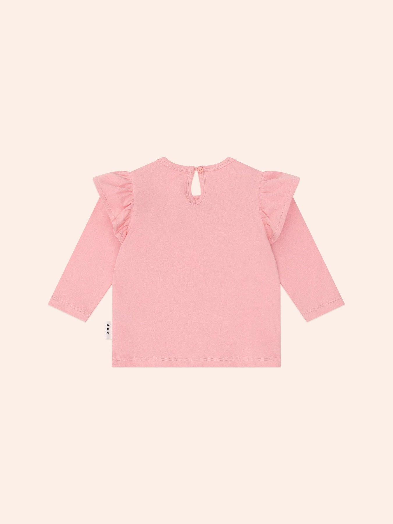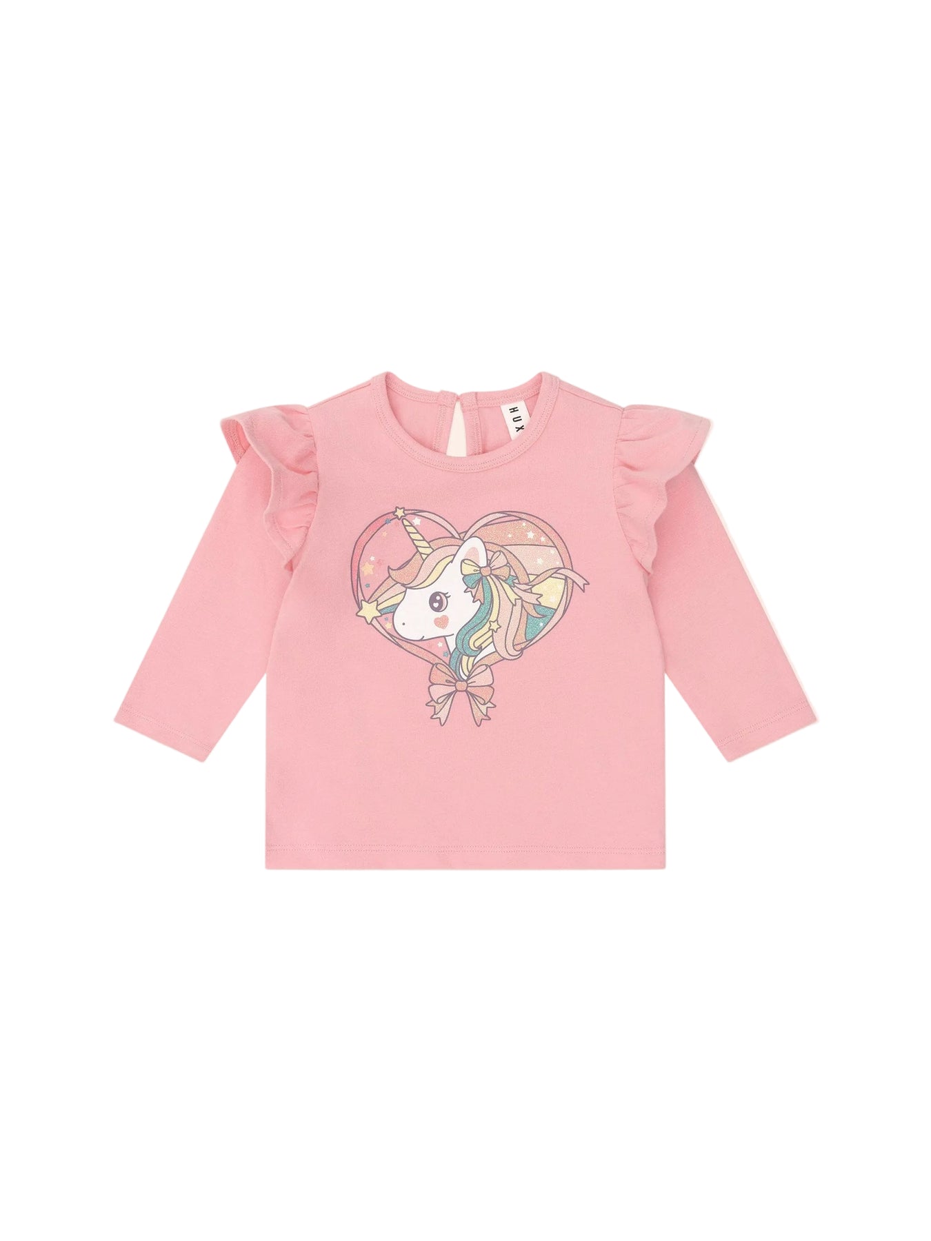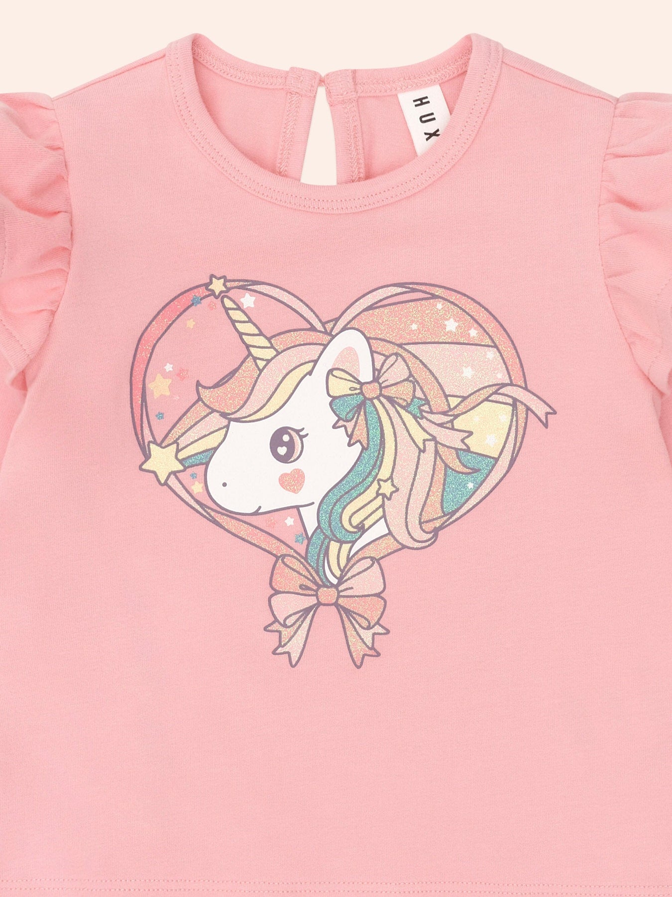 The perfect frill sleeve top, but with a sparkly twist. Made from buttery-soft organic cotton in a soft pink hue with a keyhole closure at the neck and features a sparkly unicorn embroidered on the tummy.