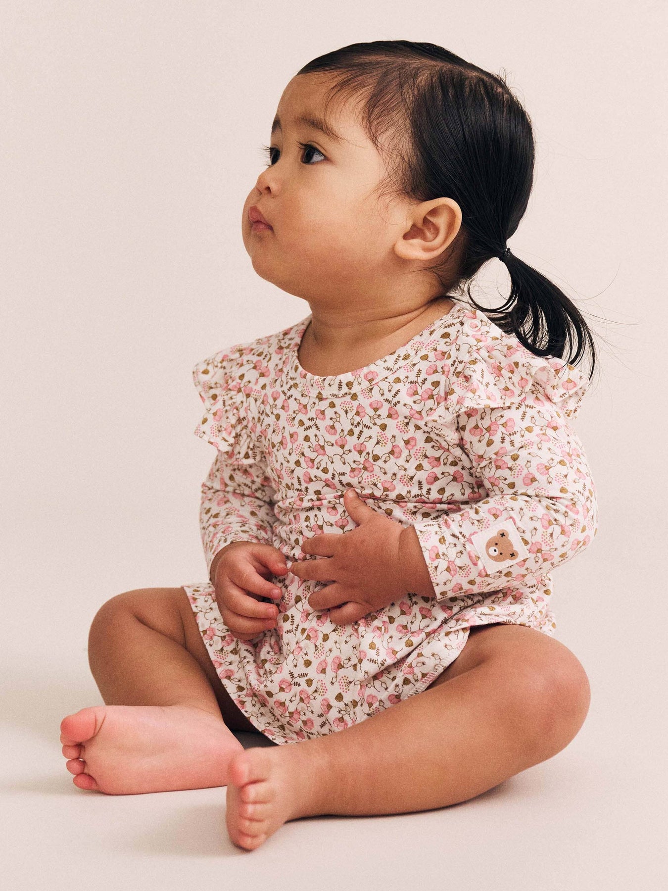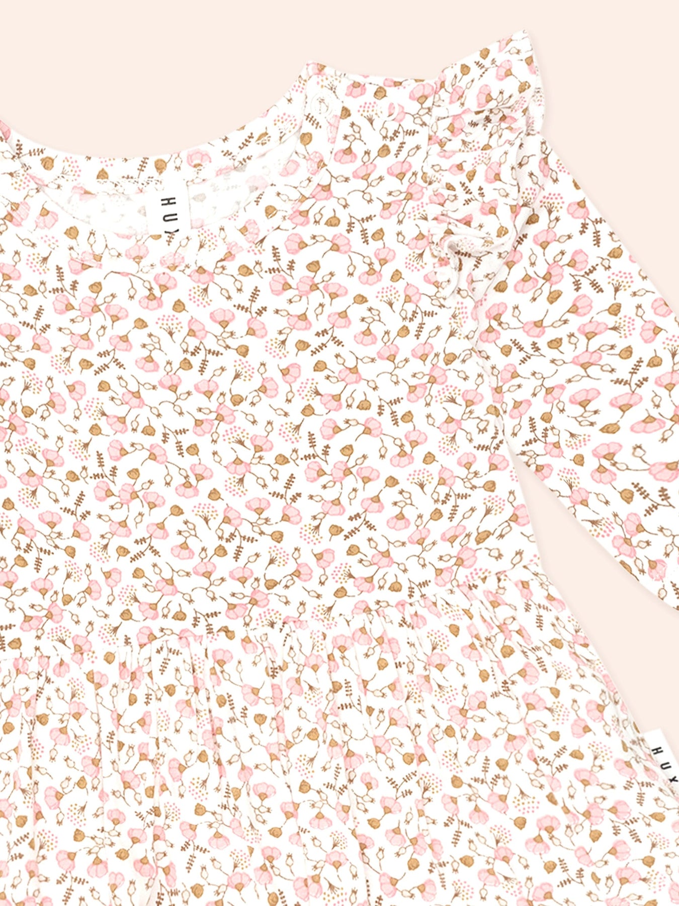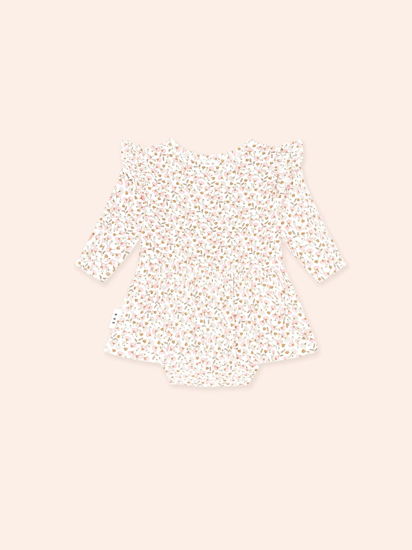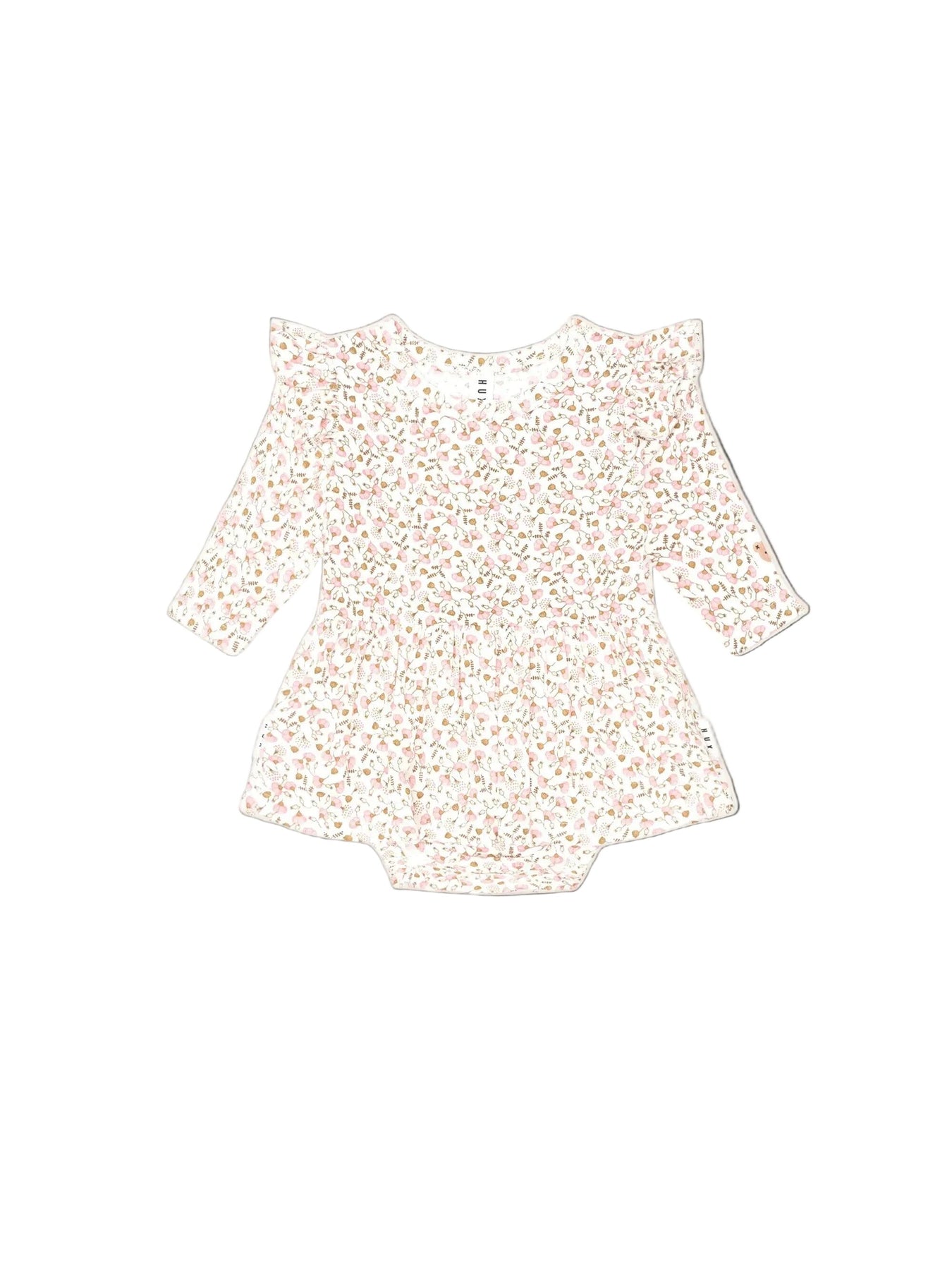 This marshmallow-soft long sleeved dress is their new staple. Features an all over custom hearts and bows print, full skirt, frilled shoulders detailing, and snap buttons for easy nappy changes. Just add squishy legs.
