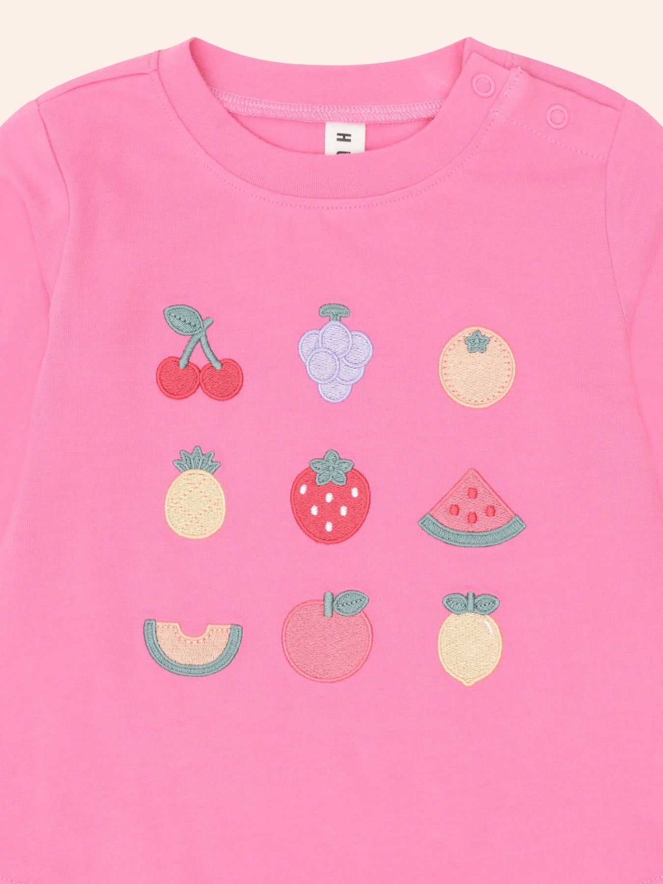 The perfect everyday top, but with a sweet fruity twist. This long sleeve t-shirt is made from buttery-soft organic cotton and features a fruit salad embroidery on the tummy. Baby sizes feature stainless steel shoulder snaps for quick changes.