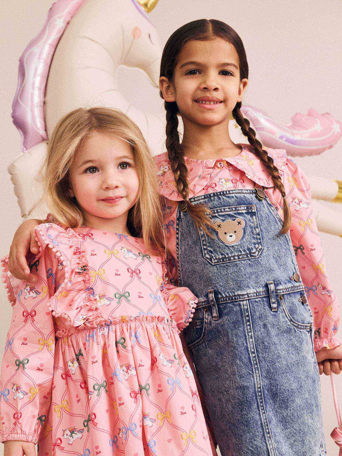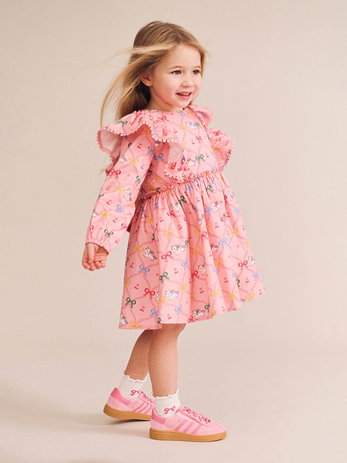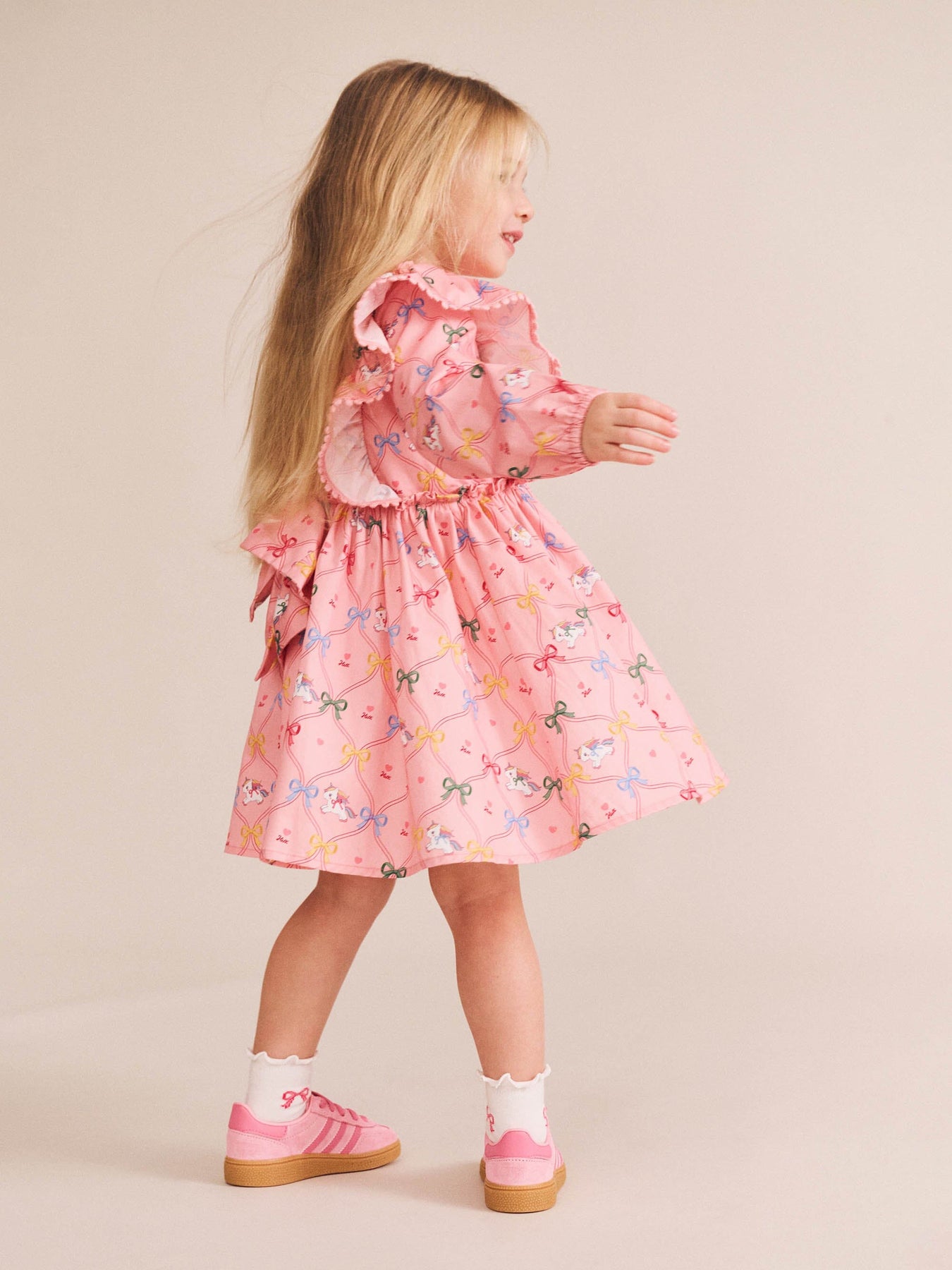 The sweetest classic vintage style frill dress. Made from soft 100% organic cotton, it features pretty frilly on the sleeves, a bow at the back, an all-over unicorn patternl, a full, tiered skirt and exaggerated puff sleeves.