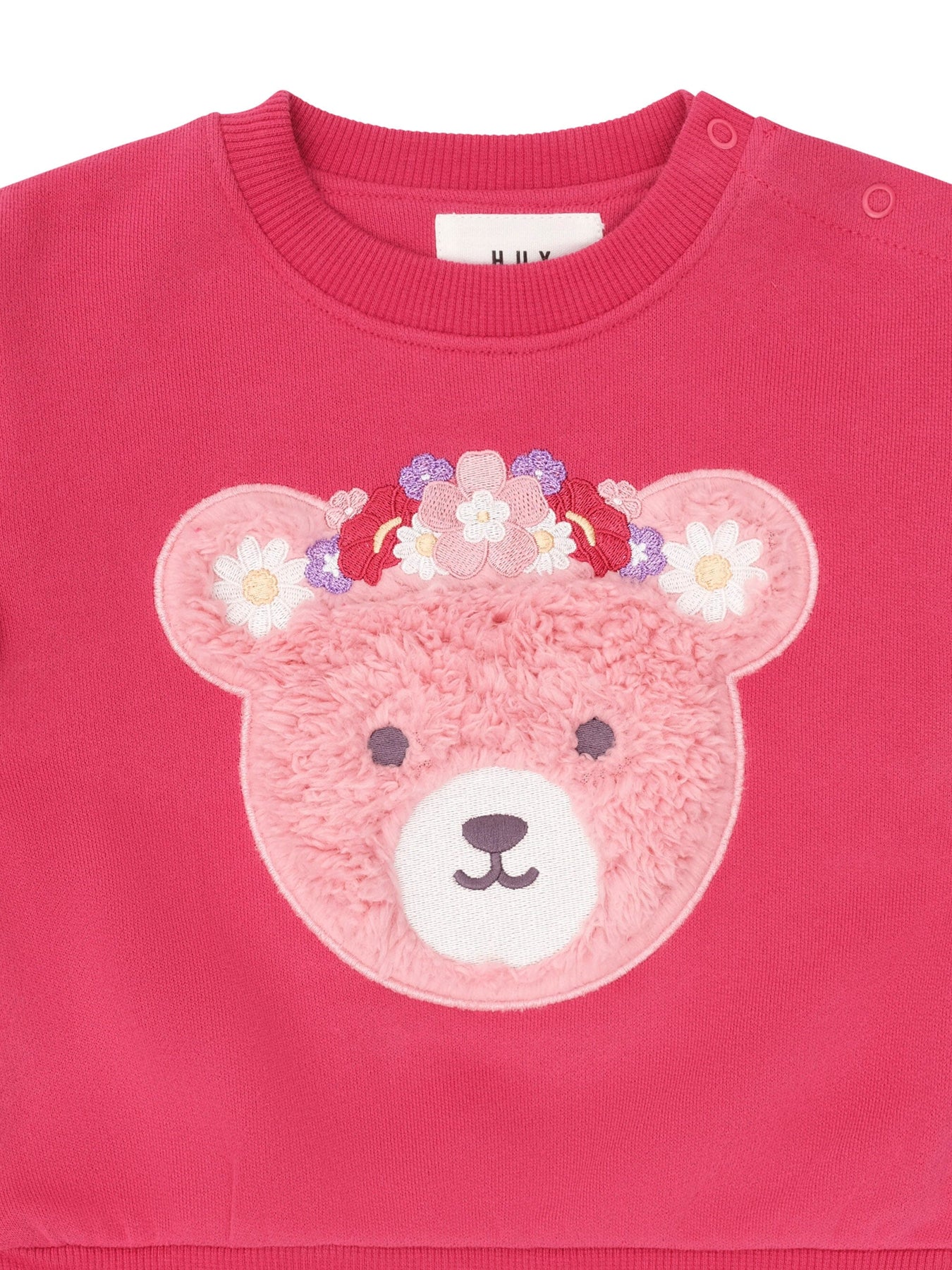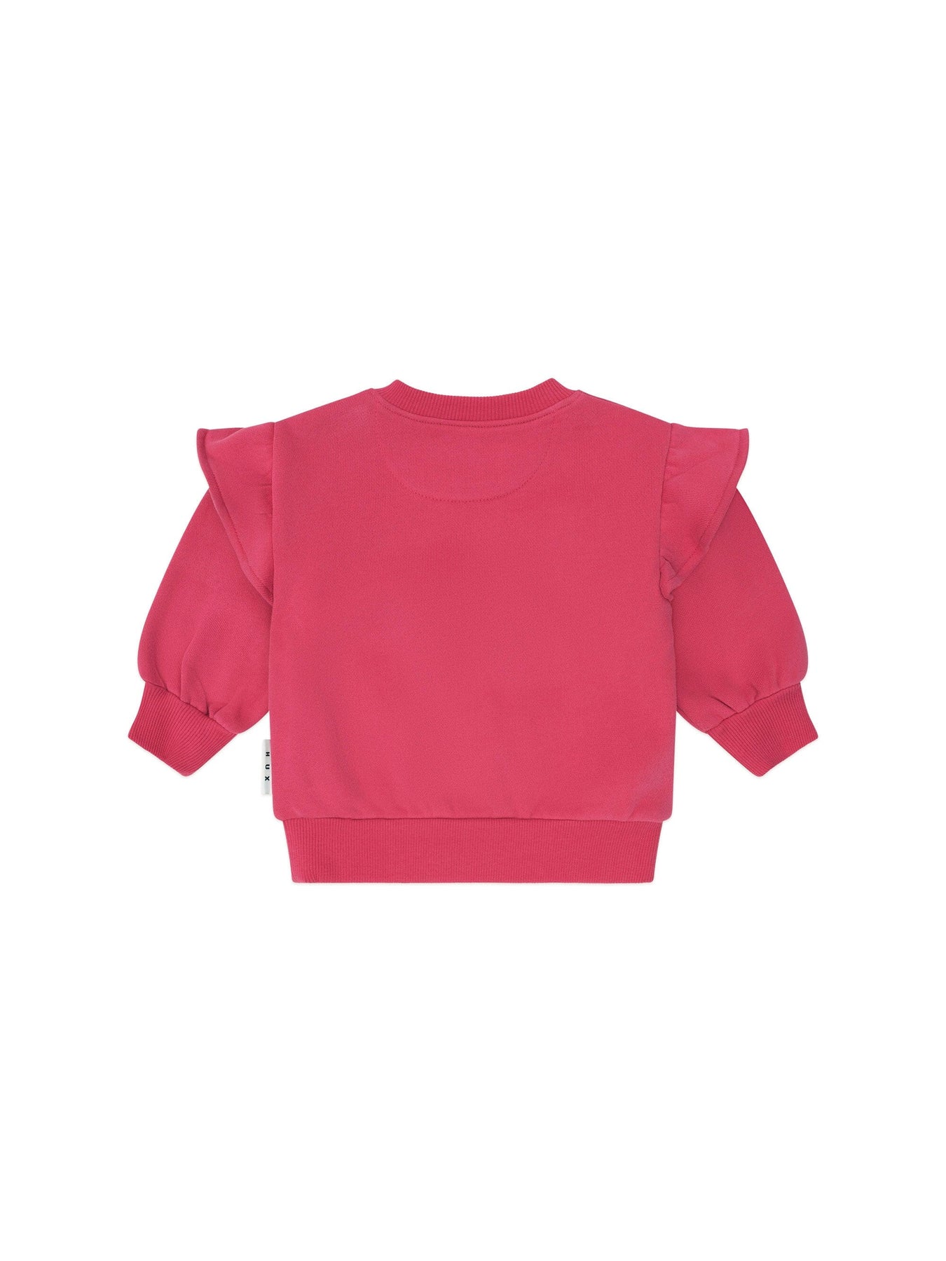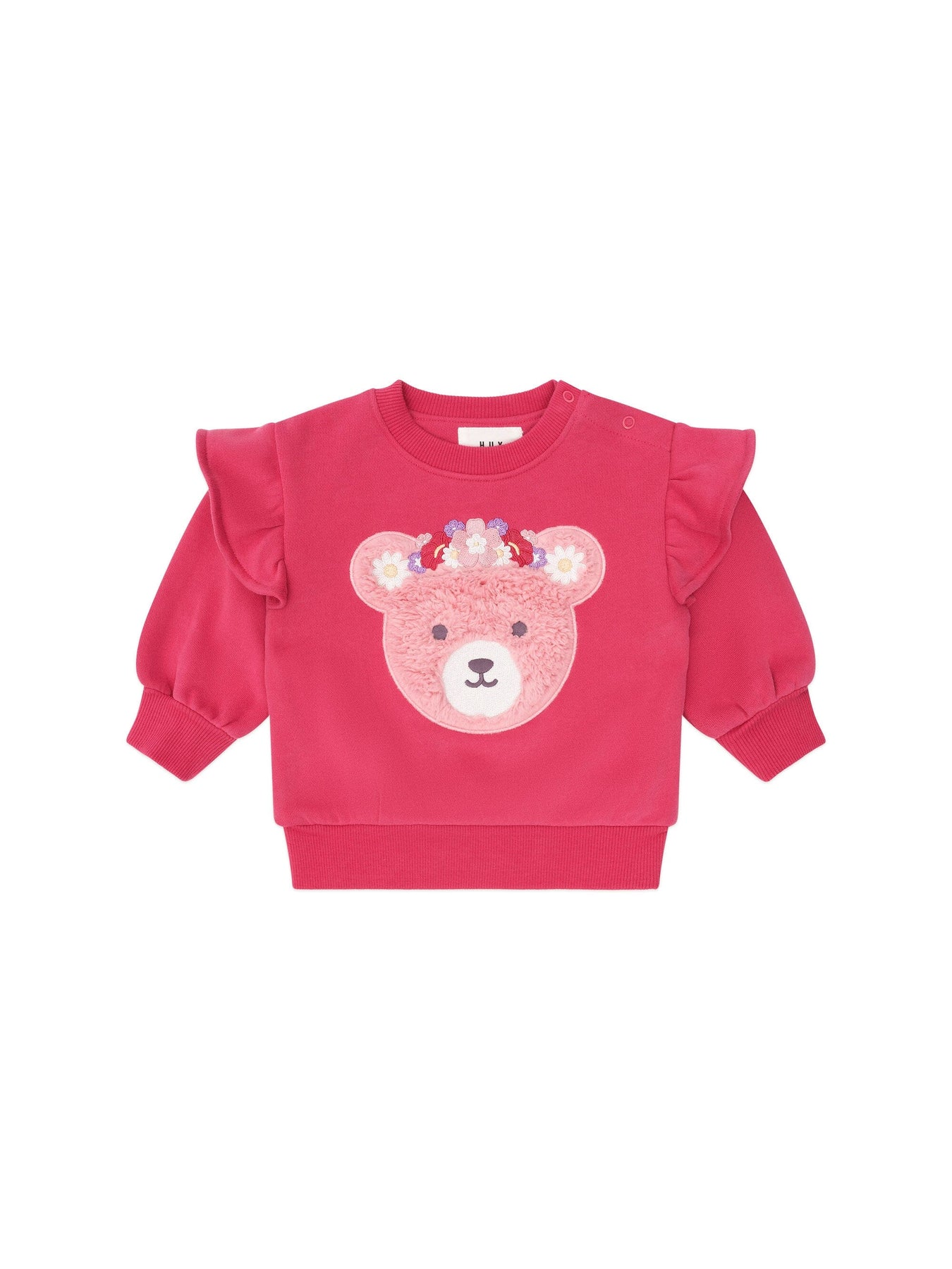 A warm and cosy fluffy fleece sweatshirt, with sweet shoulder frills. It’s made from the dreamiest organic cotton that feels like a big hug from your bestie. It features a flower crown Huxette embroidered on the tummy. Baby sizes include stainless steel back snaps for easy dressing.