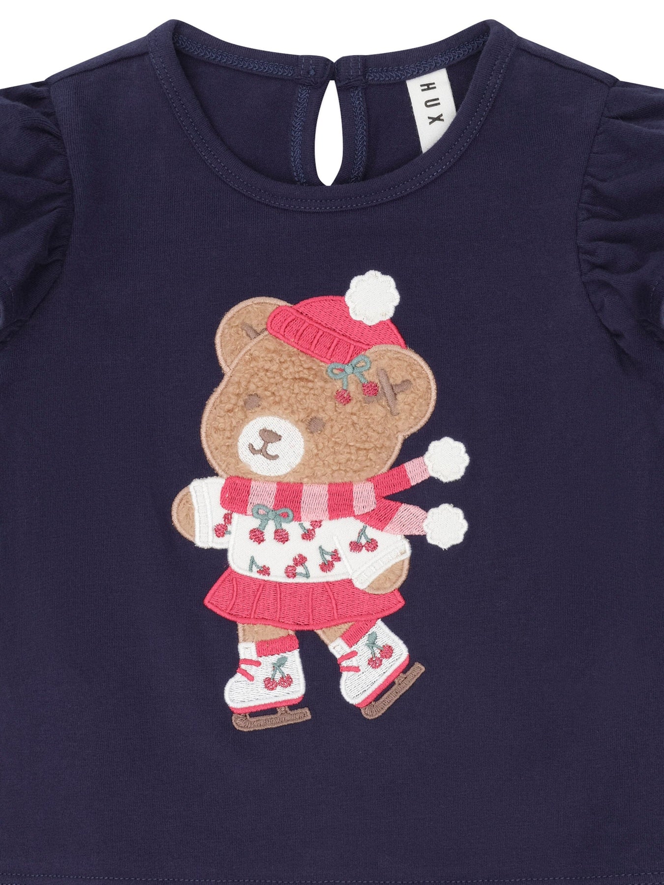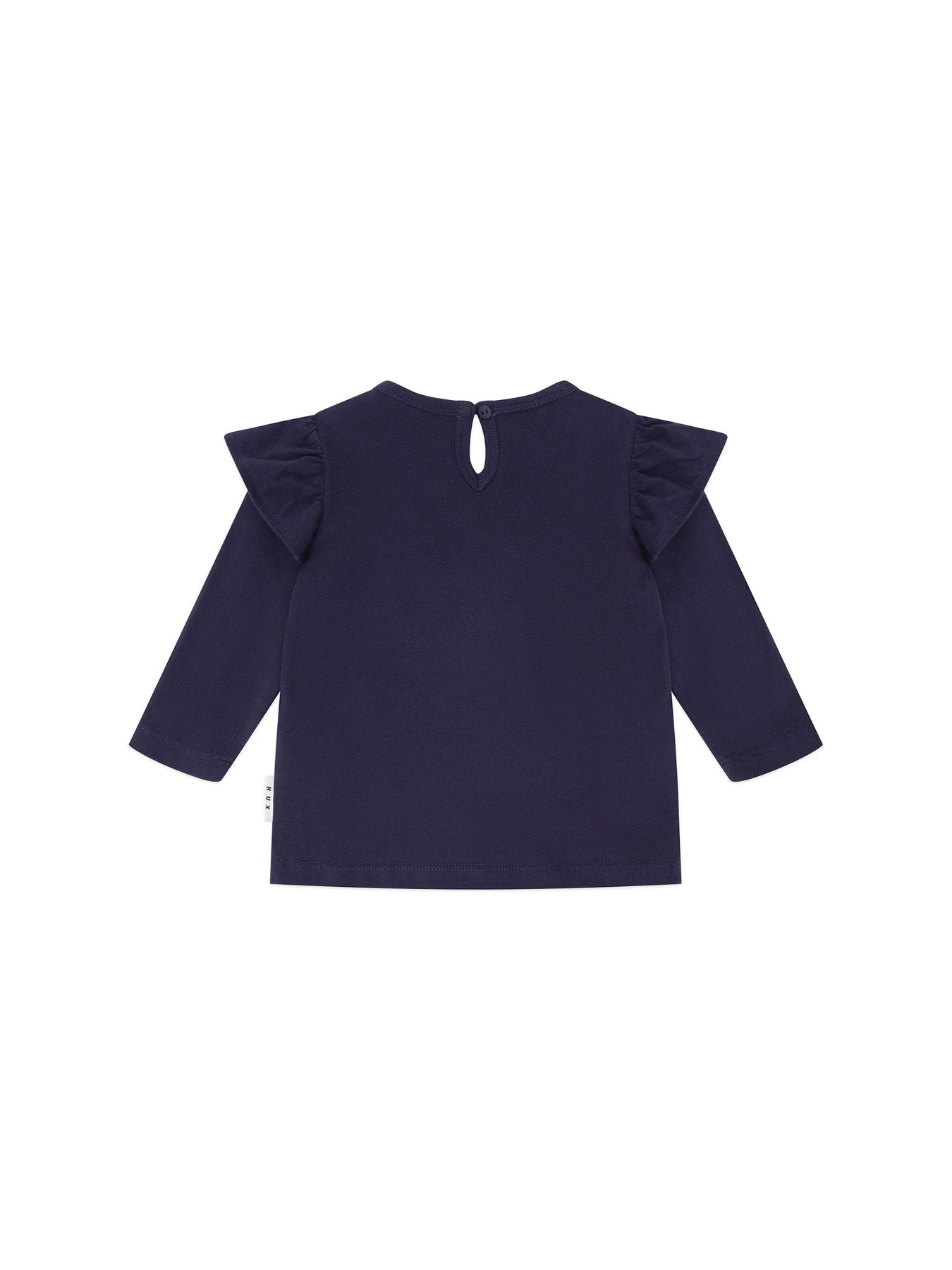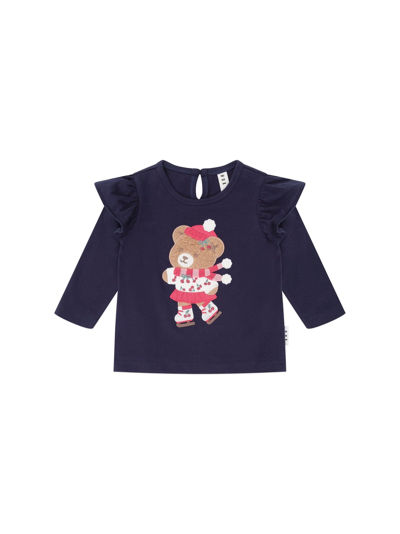 The perfect frill sleeve top, but with an icy twist. Made from buttery-soft organic cotton. It features a keyhole close at the neck and ice skater Huxette embroidered on the tummy.