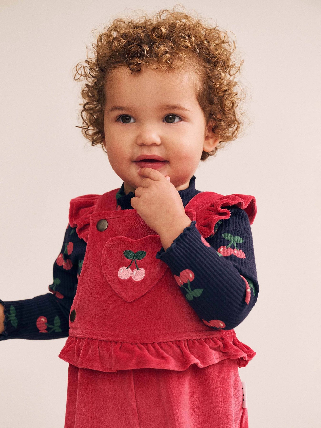 It doesn’t get much cuter than this cherry red overall. Designed with a 90s cut in super soft velour, it features adjustable frilly straps, frilly waistband, cherry embroidery, and a practical front pocket perfect for stashing snacks.