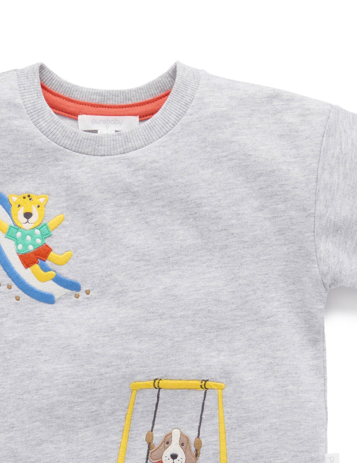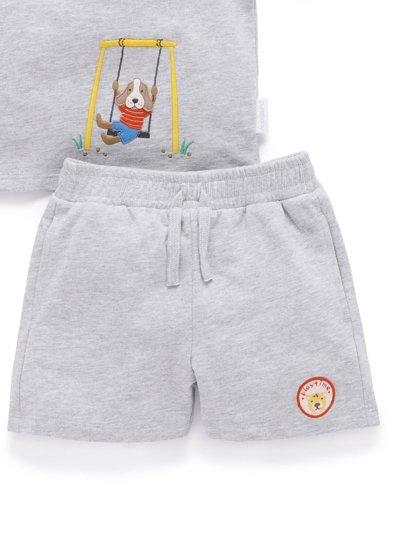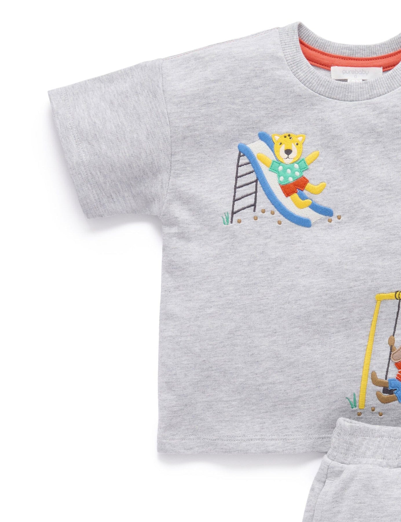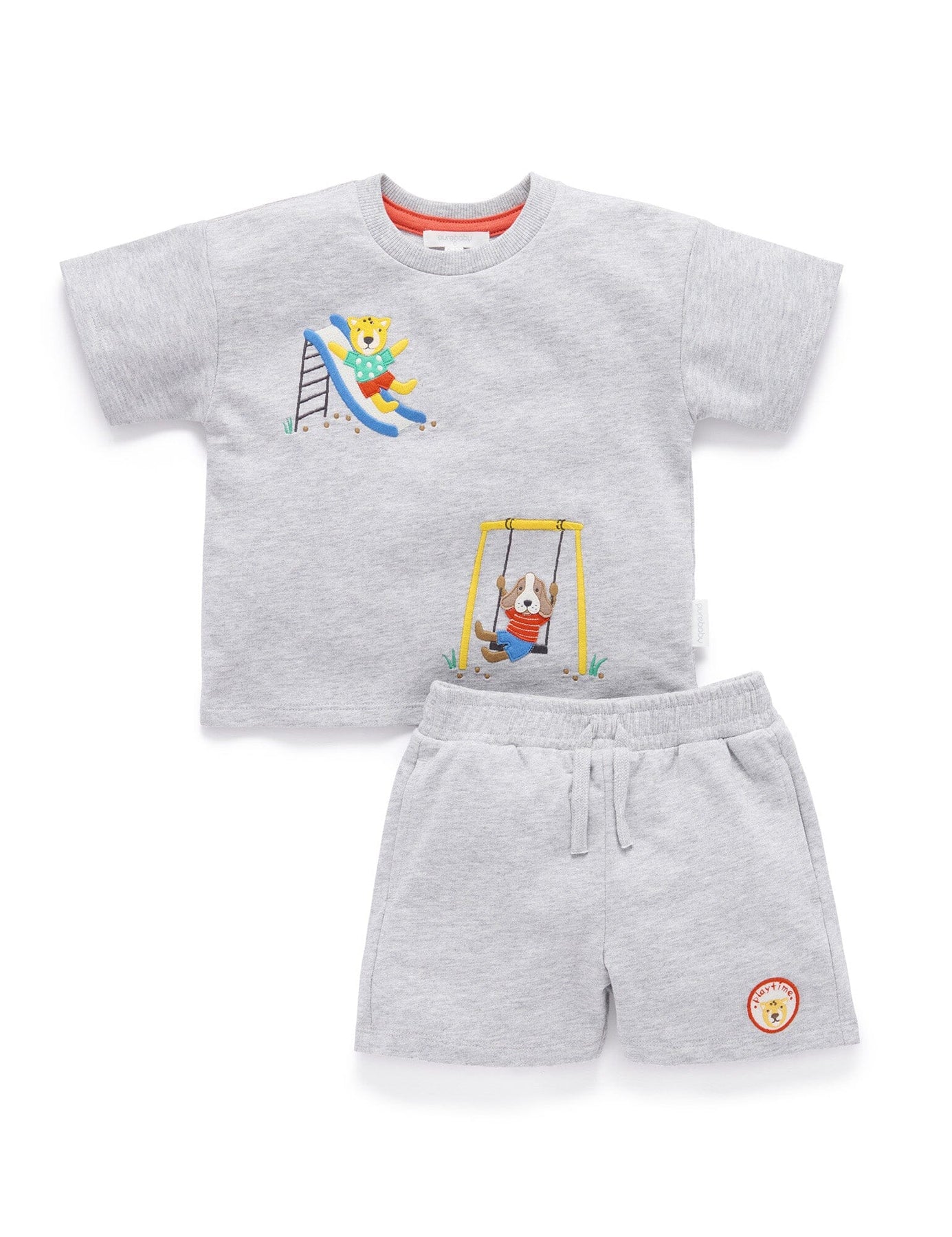 Our practical two piece Playground Track Set makes a perfect comfy, everyday outfit. Featuring a track tee in a relaxed fit, with a fun play time applique, and matching shorts. Made from soft, easy care 100% Organic Cotton unbrushed fleece, this is a roomy outfit that is comfy for play.