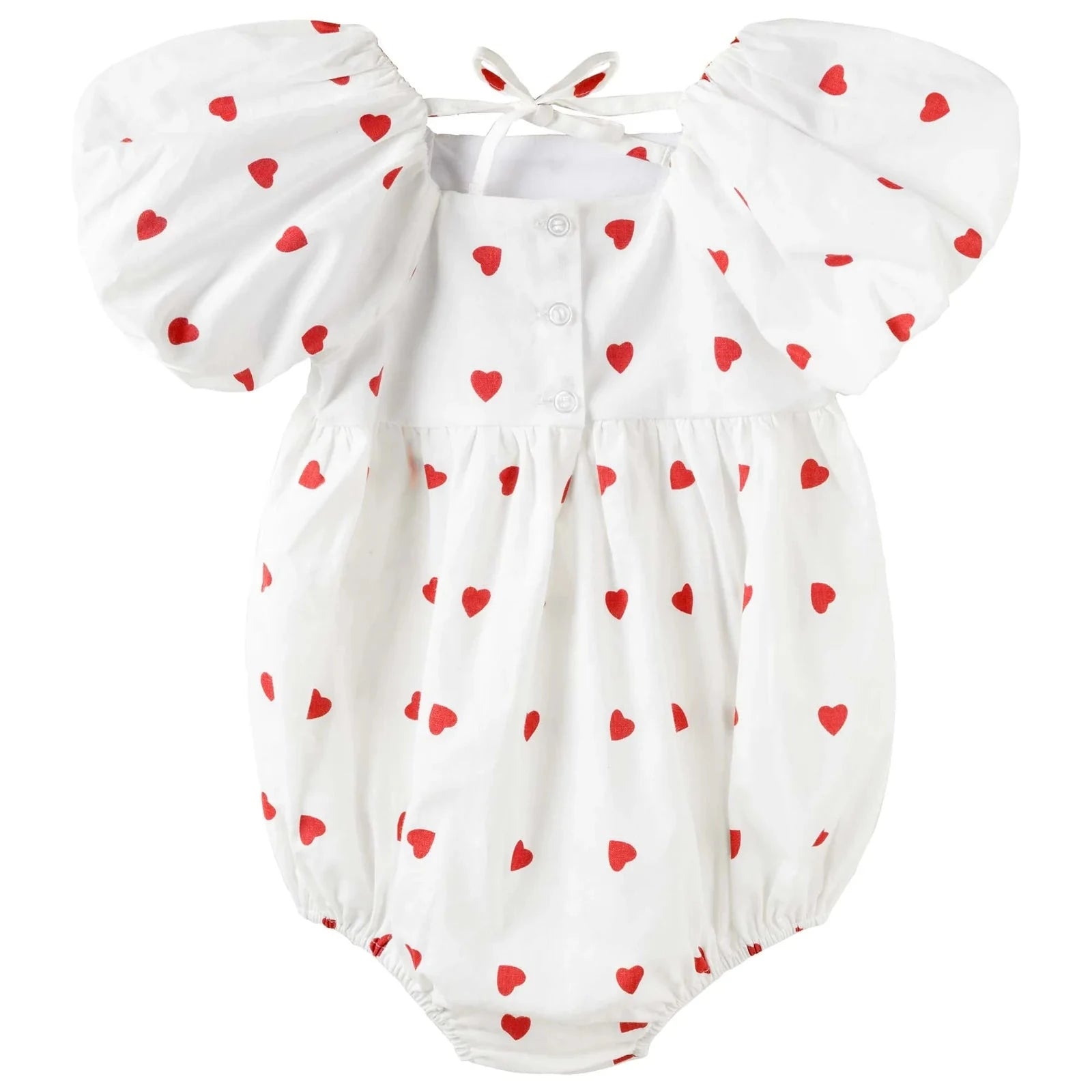 We are IN LOVE with the Love Hearts Puff Sleeve Romper, featuring puff sleeves, gathering at the waist, snap closures at the gusset and cute tie feature and button opening at the back.