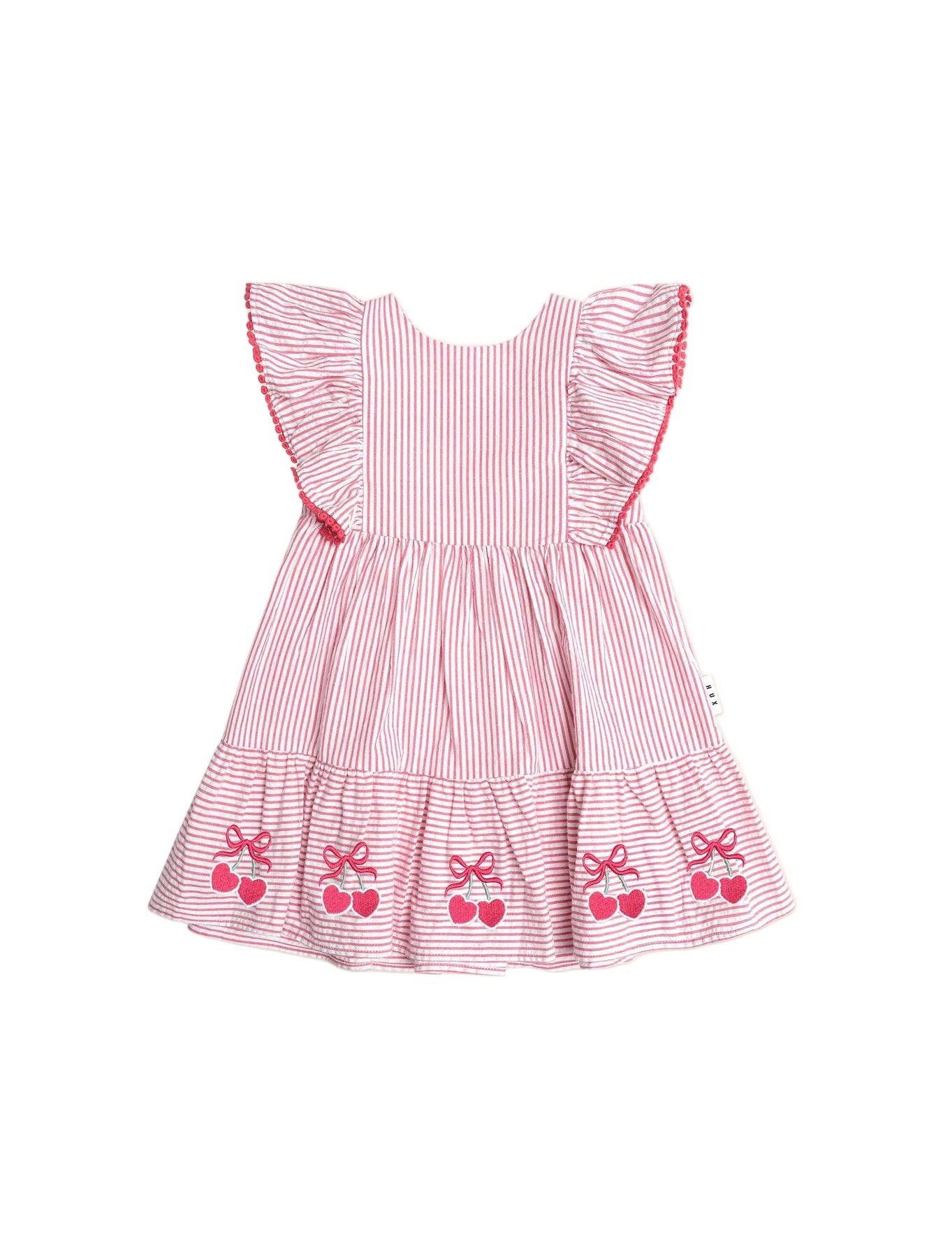 Event dressing, made easy. Made from 100% cotton, this dress features oversized frill sleeves and a full, tiered skirt just waiting to be twirled. Light, breezy and in our super sweet cherry stripe, this piece features detailed cherry embroideries along the front hemline.