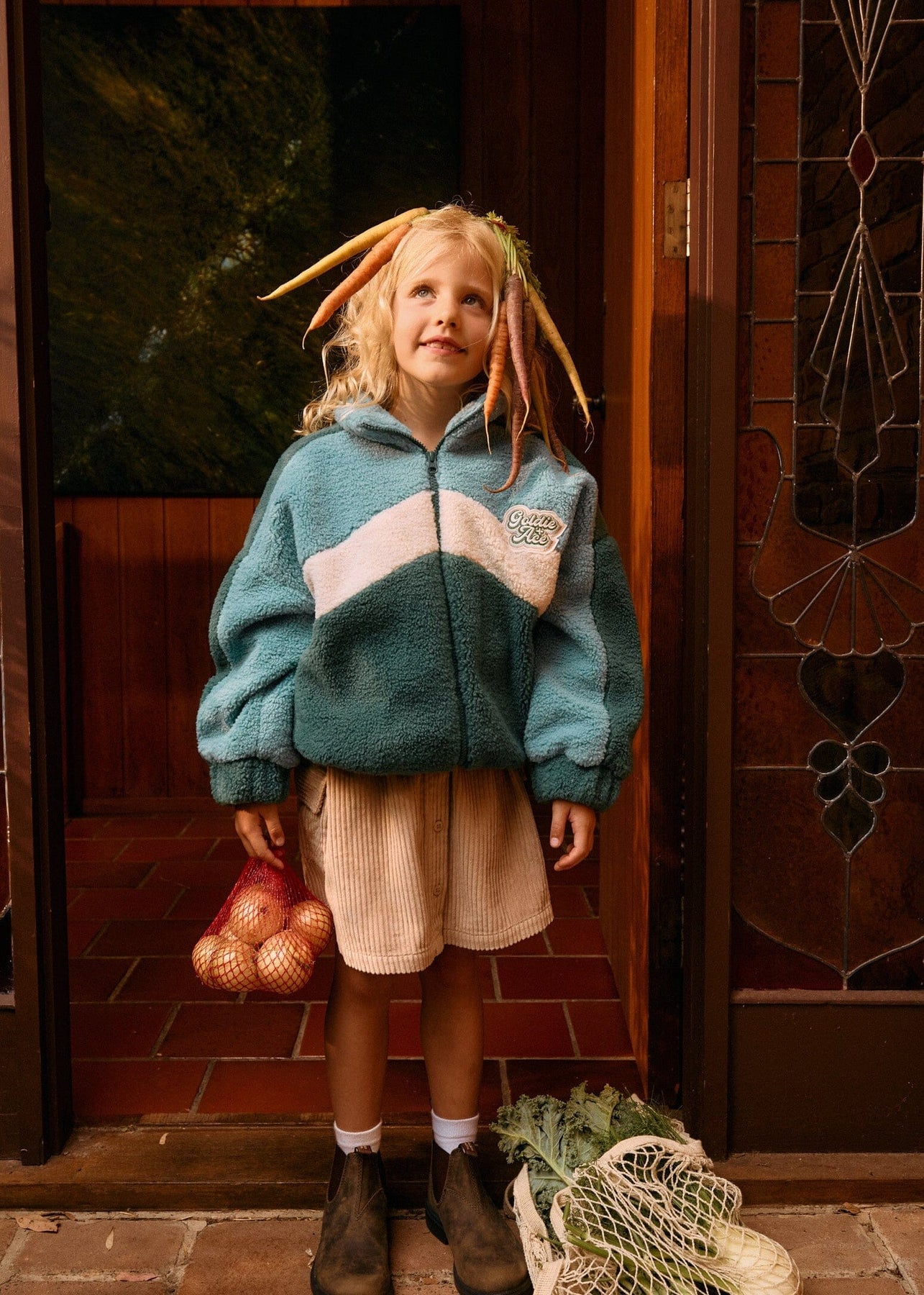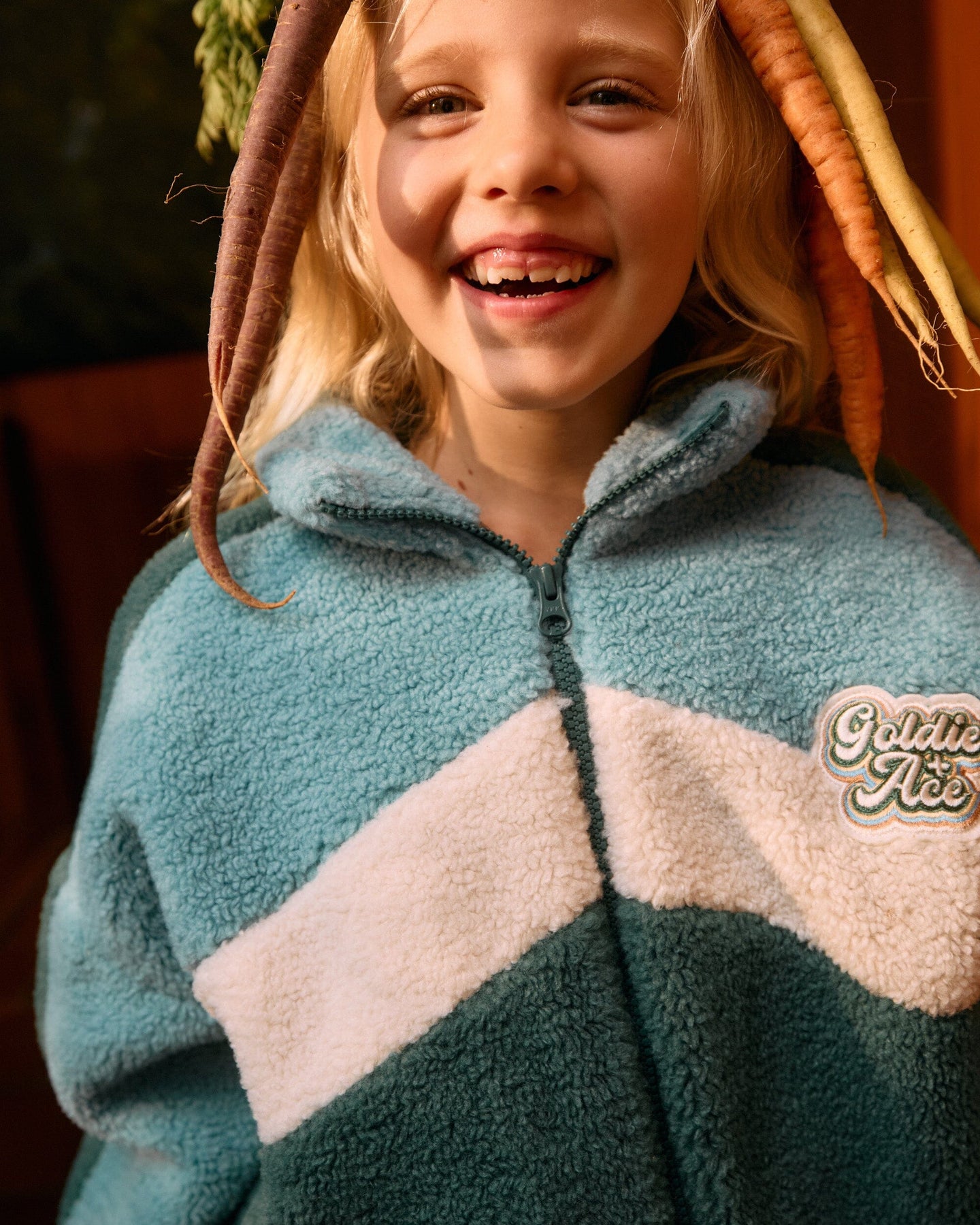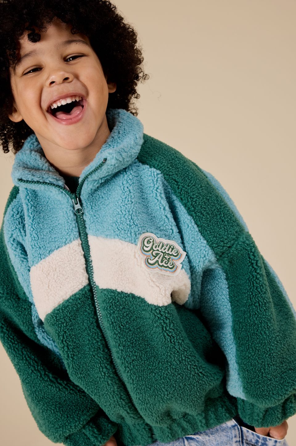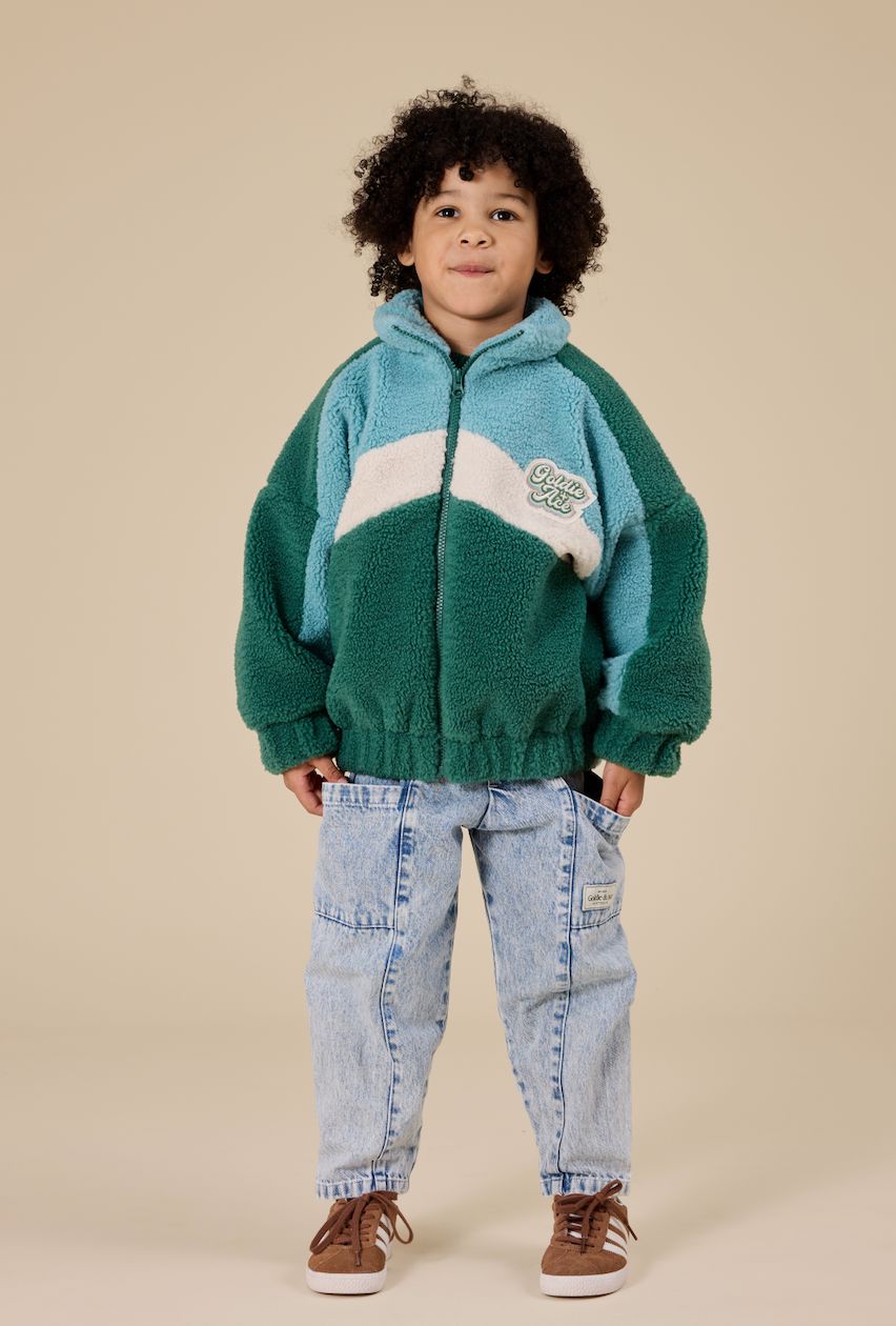 Keep your little one cozy with this Frankie Sherpa Jacket in teal, cream, and dark jade.