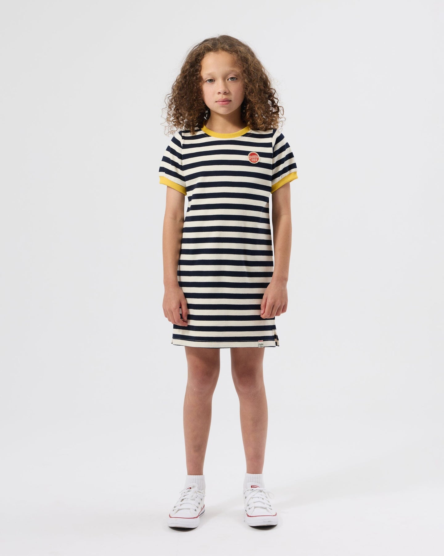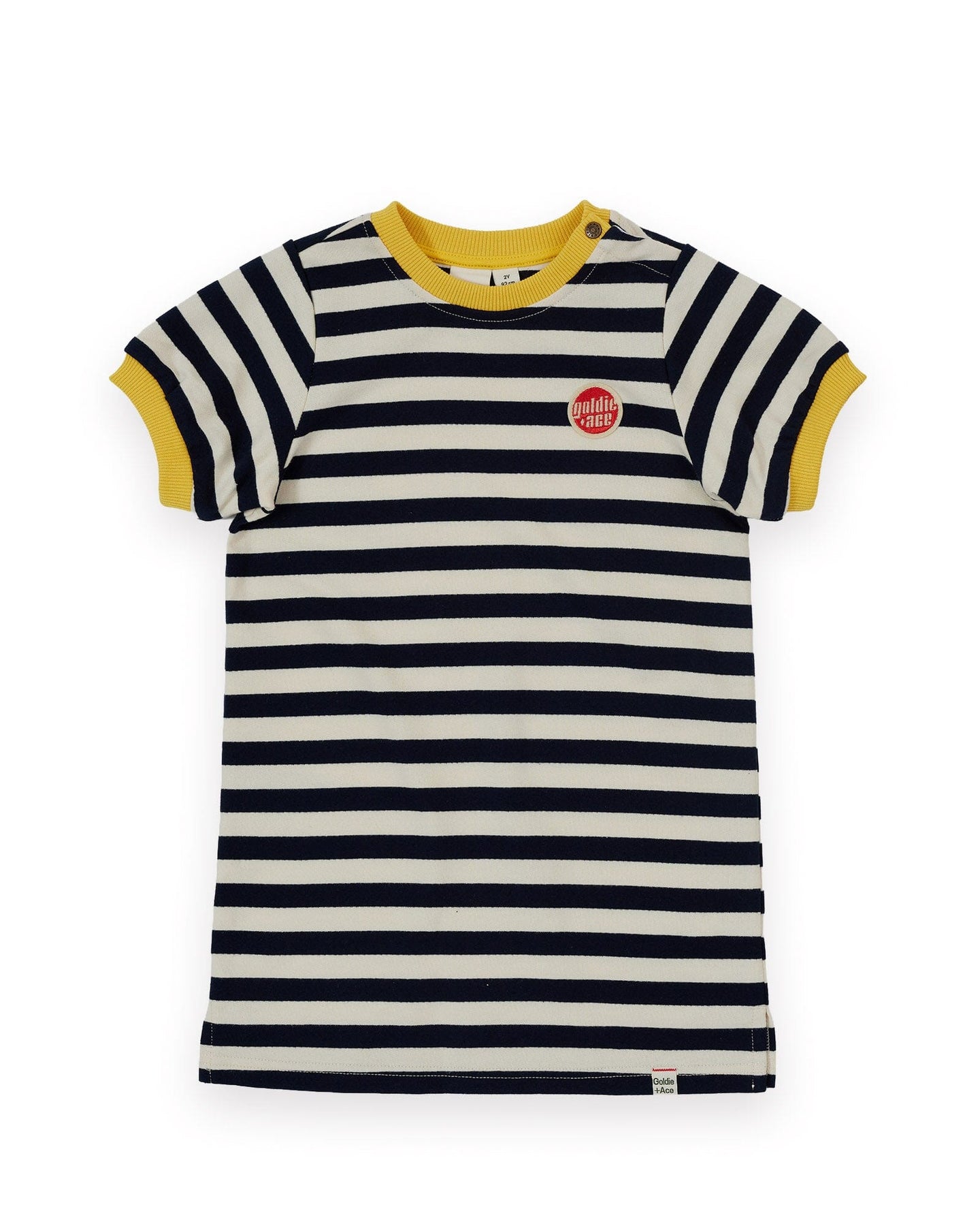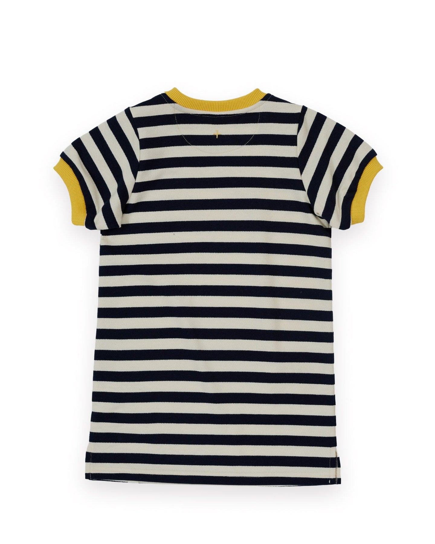 Crafted from loop back terry cotton, this navy and antique white stripe ringer t-shirt dress features soft rib trims at the neck and cuffs.