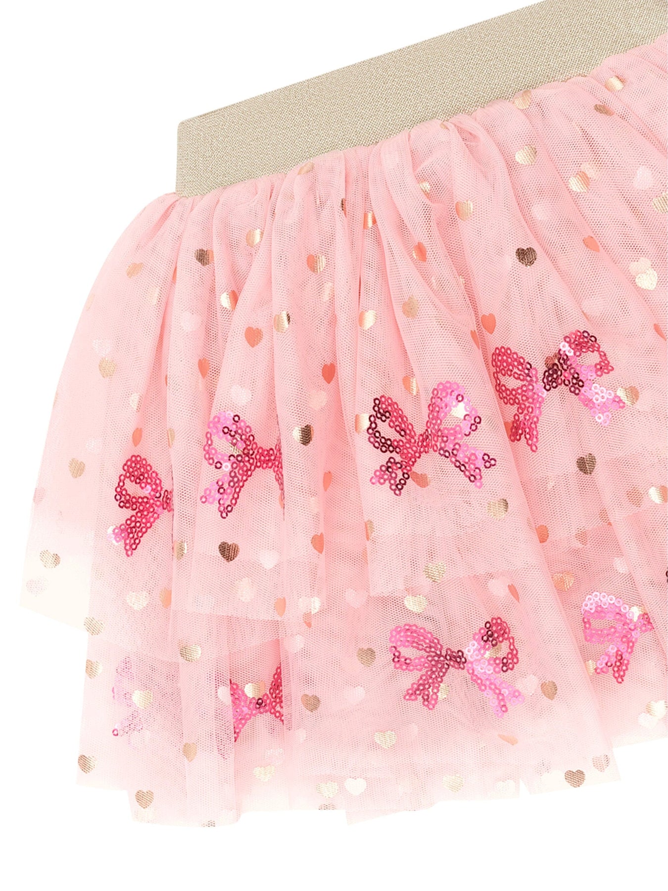 Other party skirts can’t compare. Your little girl will twirl to her heart’s content in this full bodied, layered tulle skirt in pretty pink. It features an all over sequin sequin bow design and gold lurex waistband, made from soft yet stretchy elastic.