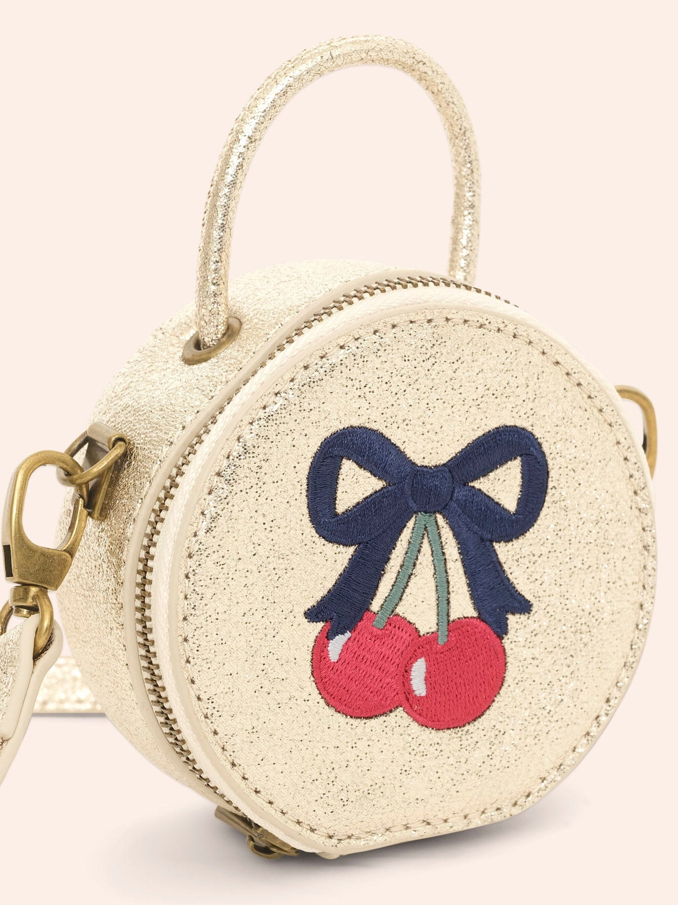 The best handbag to stash snacks, pebbles or any other playground treasures. Features a cherry bow embroidery design and includes "Hux Bucks" play money inside.