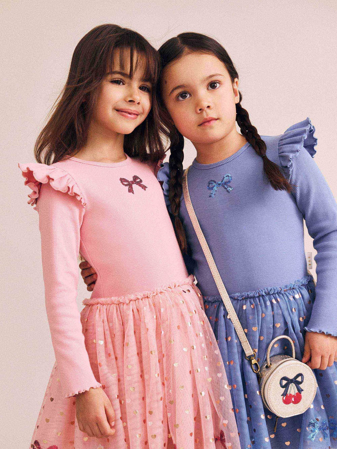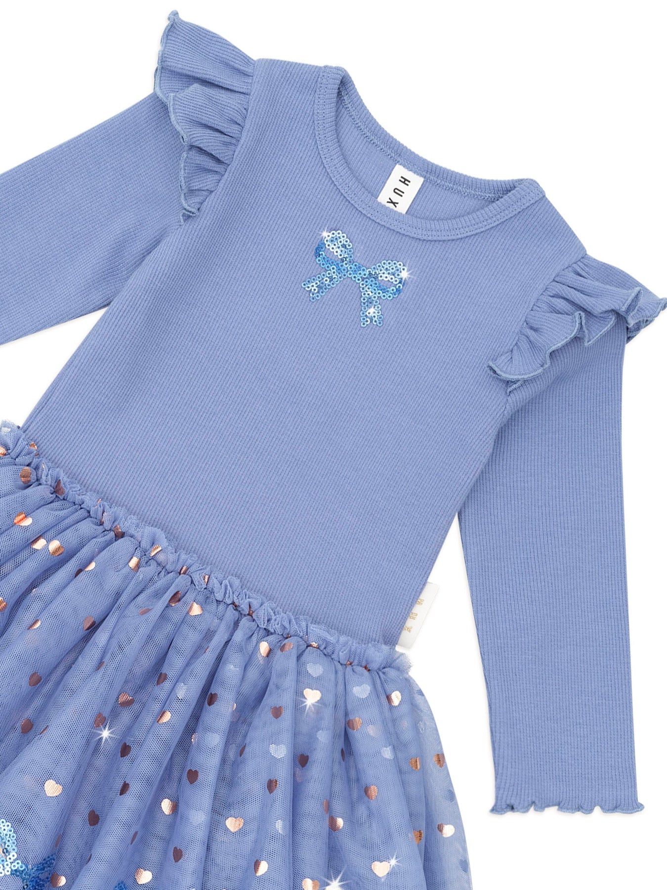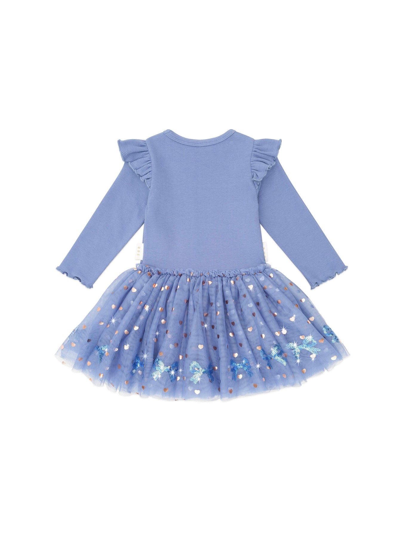 Other party dresses can’t compare. Your little girl will twirl to her heart’s content in this full bodied ballet dress. This long sleeve dress features sweet shoulder frills, a tulle skirt, custom sequin bow embroidery and lettuce edge sleeves.