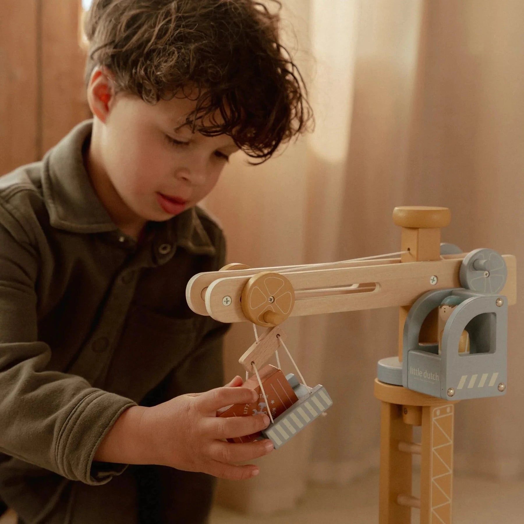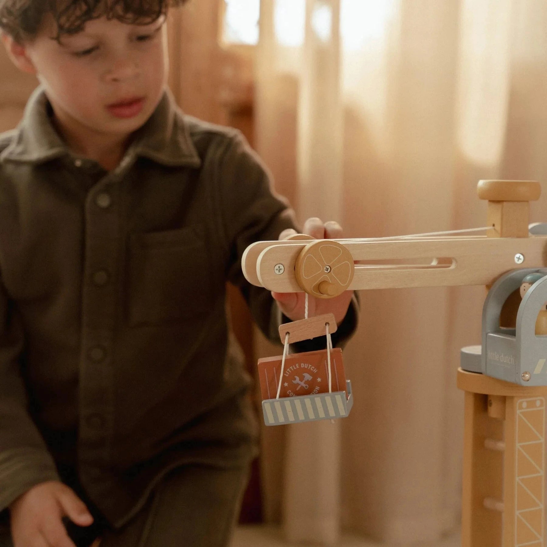 Build and move! This wooden crane lifts loads up and safely lowers them. Includes construction materials, vehicles, construction workers, and traffic signs. Perfect for little builders and easy to combine with other items from the vehicles collection!