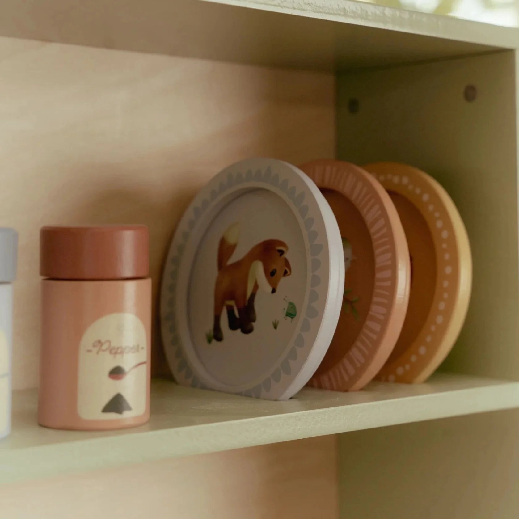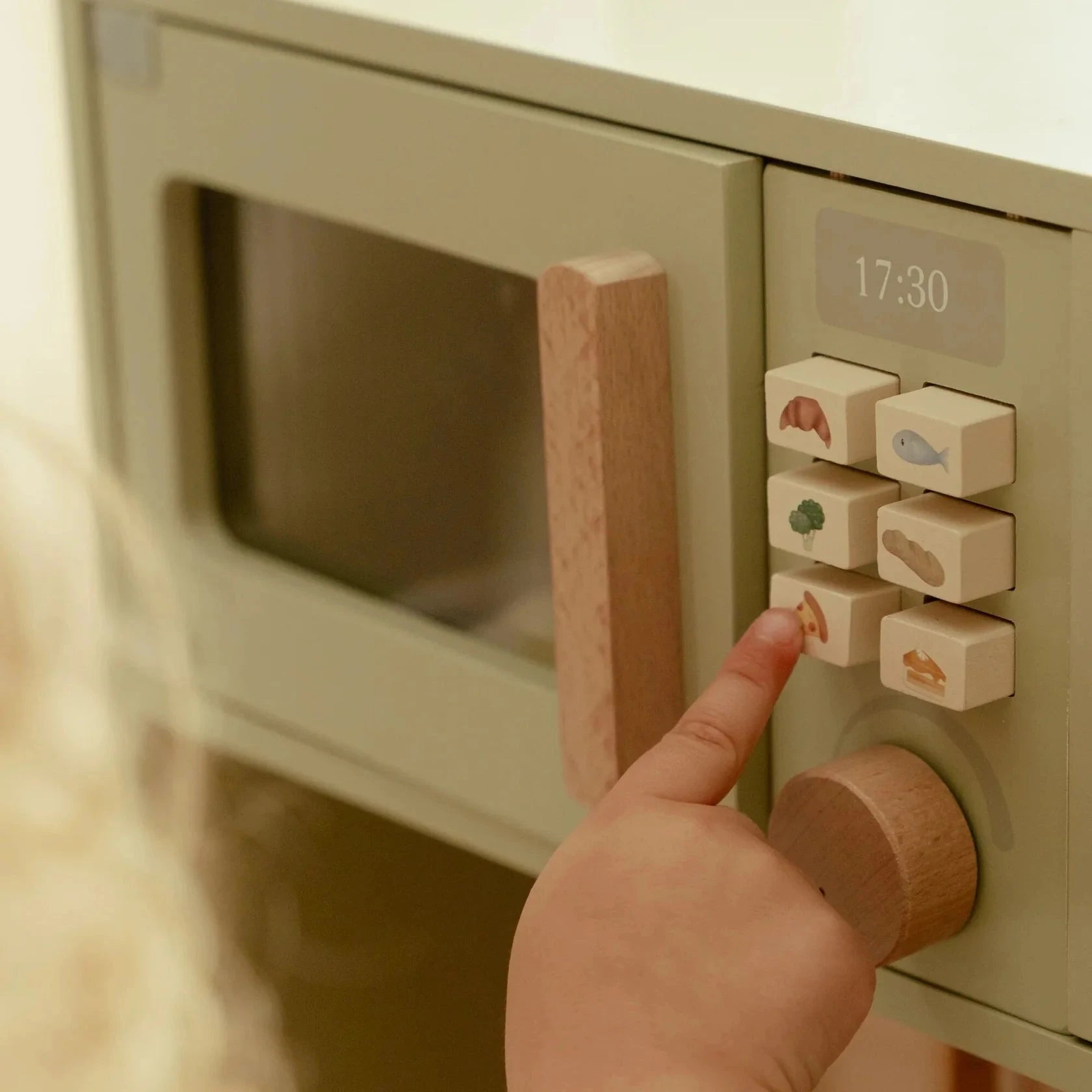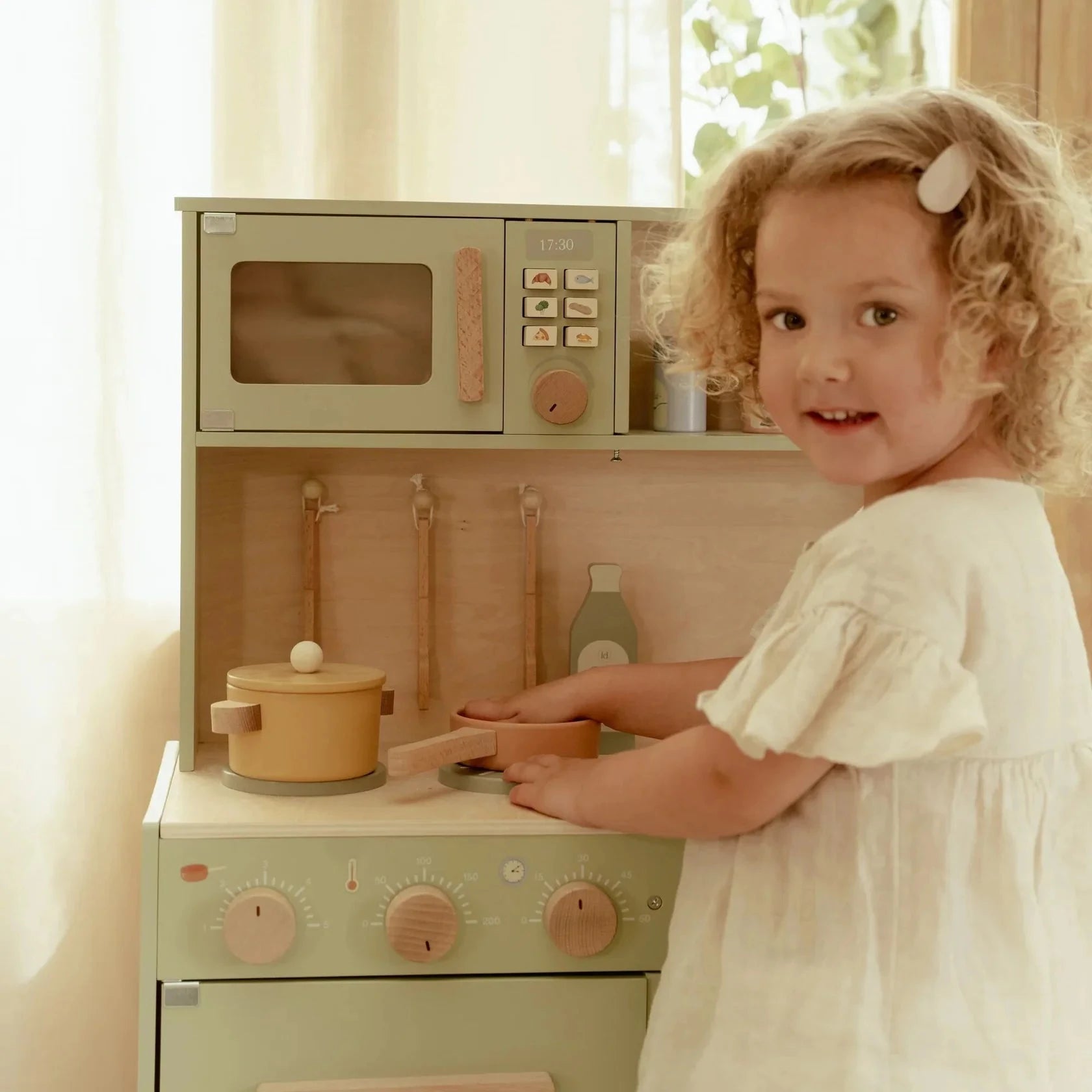 Little chefs can get to work in this beautiful mint-colored wooden play kitchen! Bake a delicious cake in the oven, cook fresh vegetables on the stove, or fry an egg in the pan. The kitchen comes fully equipped with two pans, cooking utensils, three plates, and a sink to wash hands. Also included: a bottle of olive oil, a salt and pepper set, and a cupboard to neatly store groceries. The microwave has real knobs with illustrations for extra play fun. What ’s cooking today?