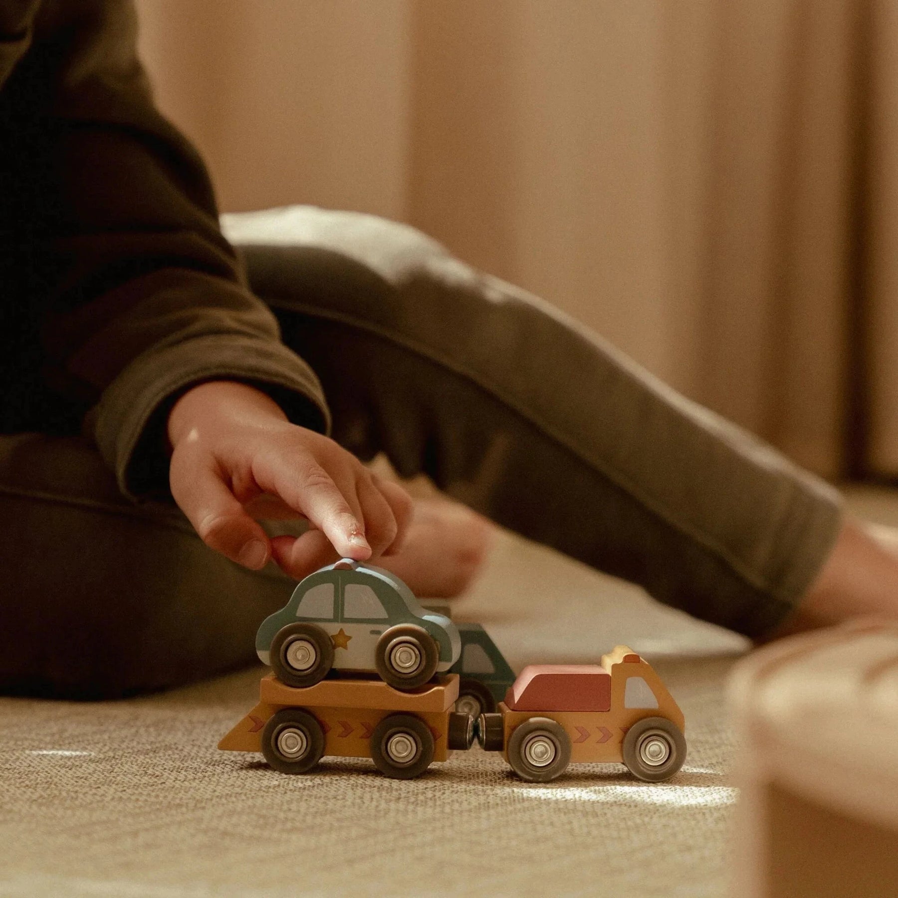 The city is always on the move! These wooden business and emergency vehicles are ready for action and smoothly ride the rails to provide help where needed. Send out the fire brigade, have the police patrol, or let the truck deliver goods. Combine and create your own adventurous city!