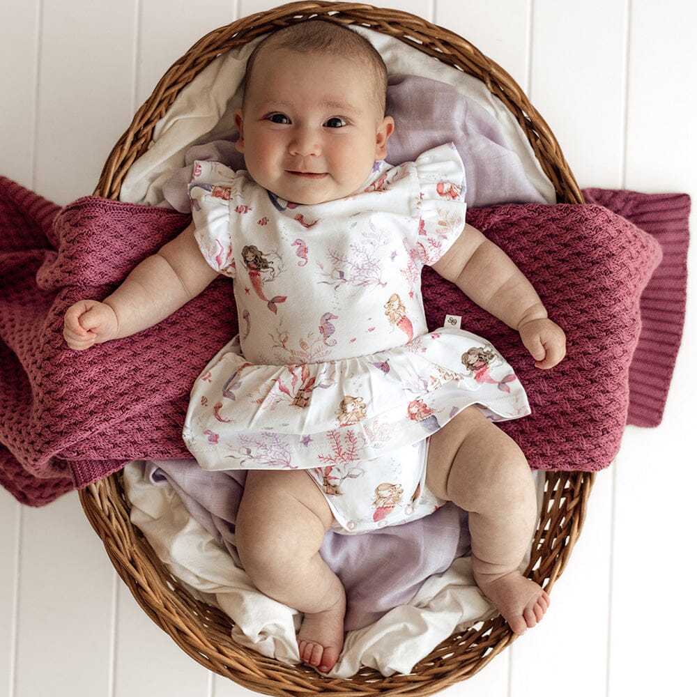 Soft and stretchy, our dresses are easy-care and very comfy for bub. The sizes up to and including size 1 come with a snap underbody to go over a nappy. Size 2 and up doesn't have the snap body feature. We have really focused on the details and ensured the dresses up to size 1 are short enough so that a baby can crawl and not trip over the skirt. Size 2 and over, when they're walking, is a bit longer.