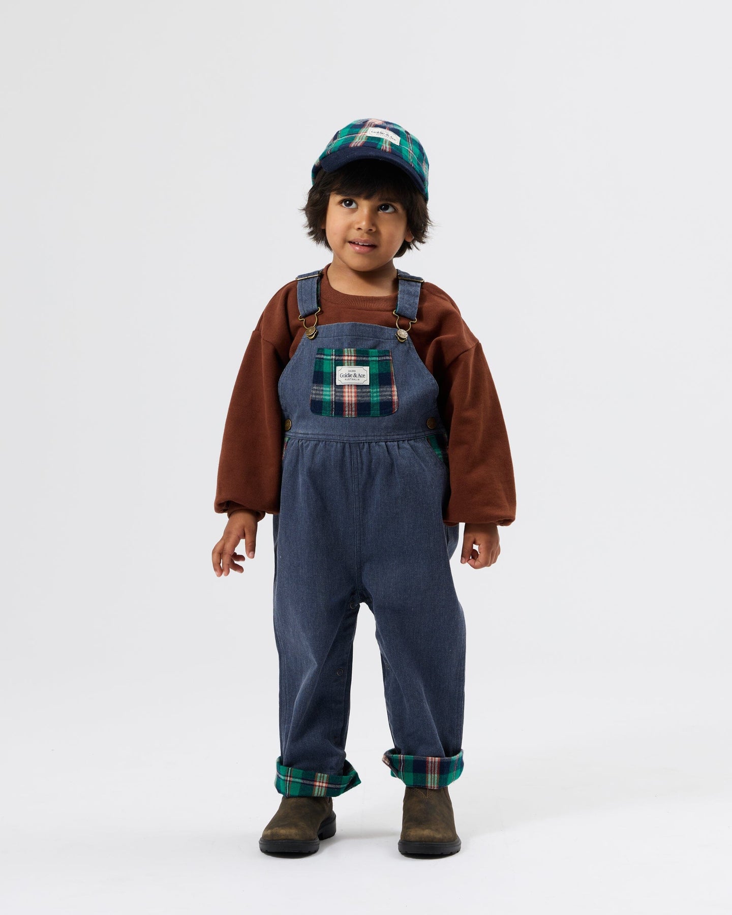 Crafted from washed mid-weight twill, these navy and green check overalls by Goldie + Ace feature woven check patches and ankle turn-ups. Adjustable shoulder straps with metal clasps ensure a comfortable fit, while functional pockets add practicality. Leg snaps up to size 2Y make changes a breeze.