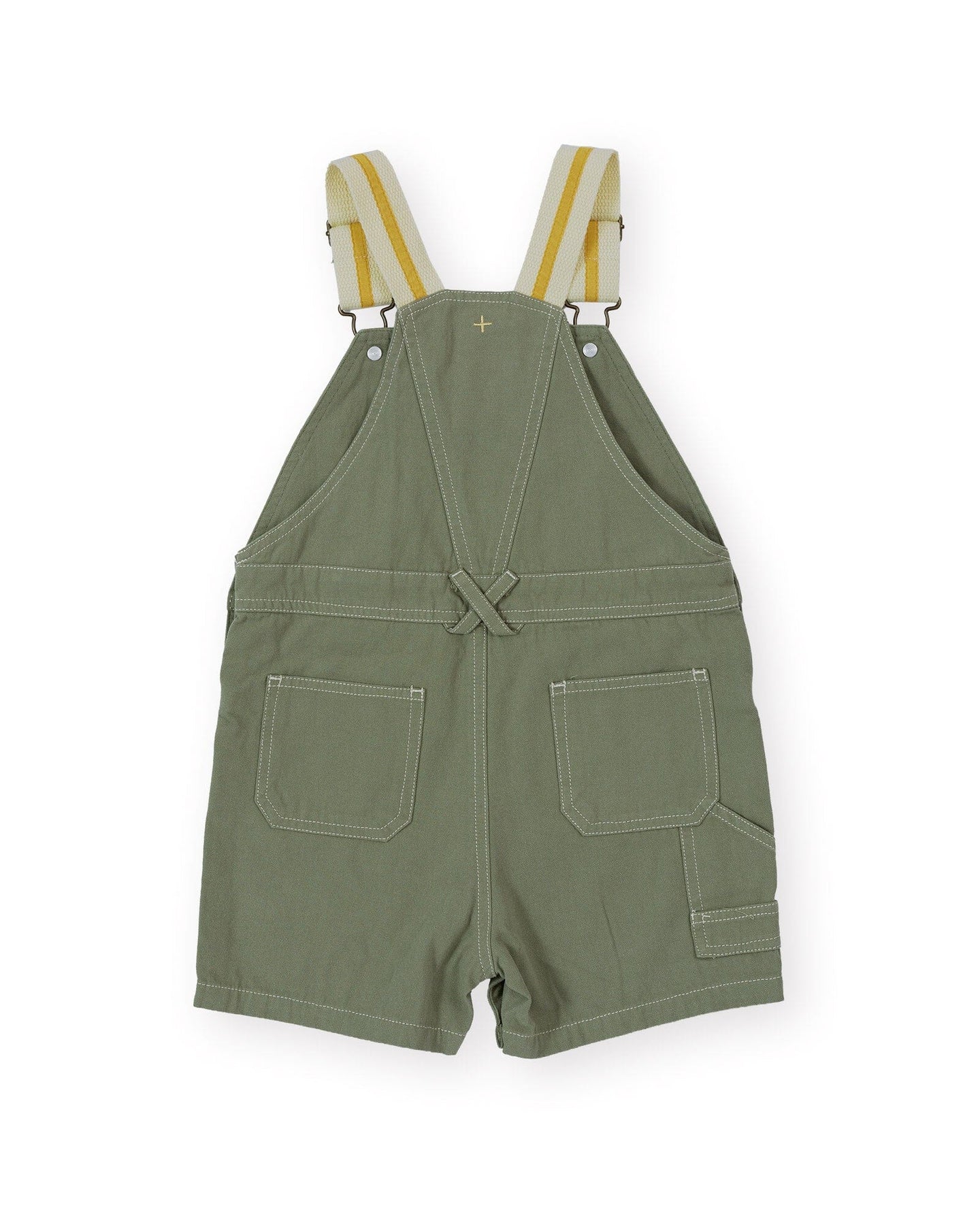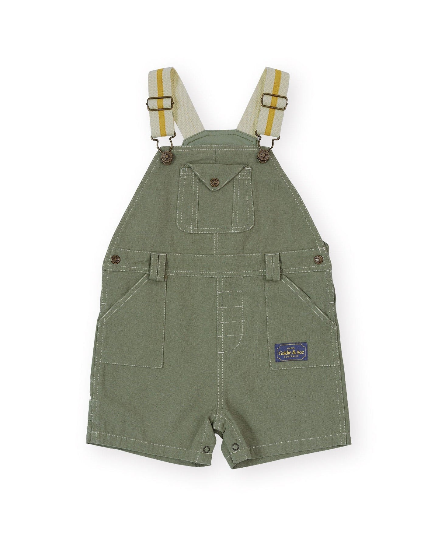 Crafted for little adventurers, these sage overalls by Goldie + Ace feature adjustable webbing shoulder straps with metal clasps and functional pockets.