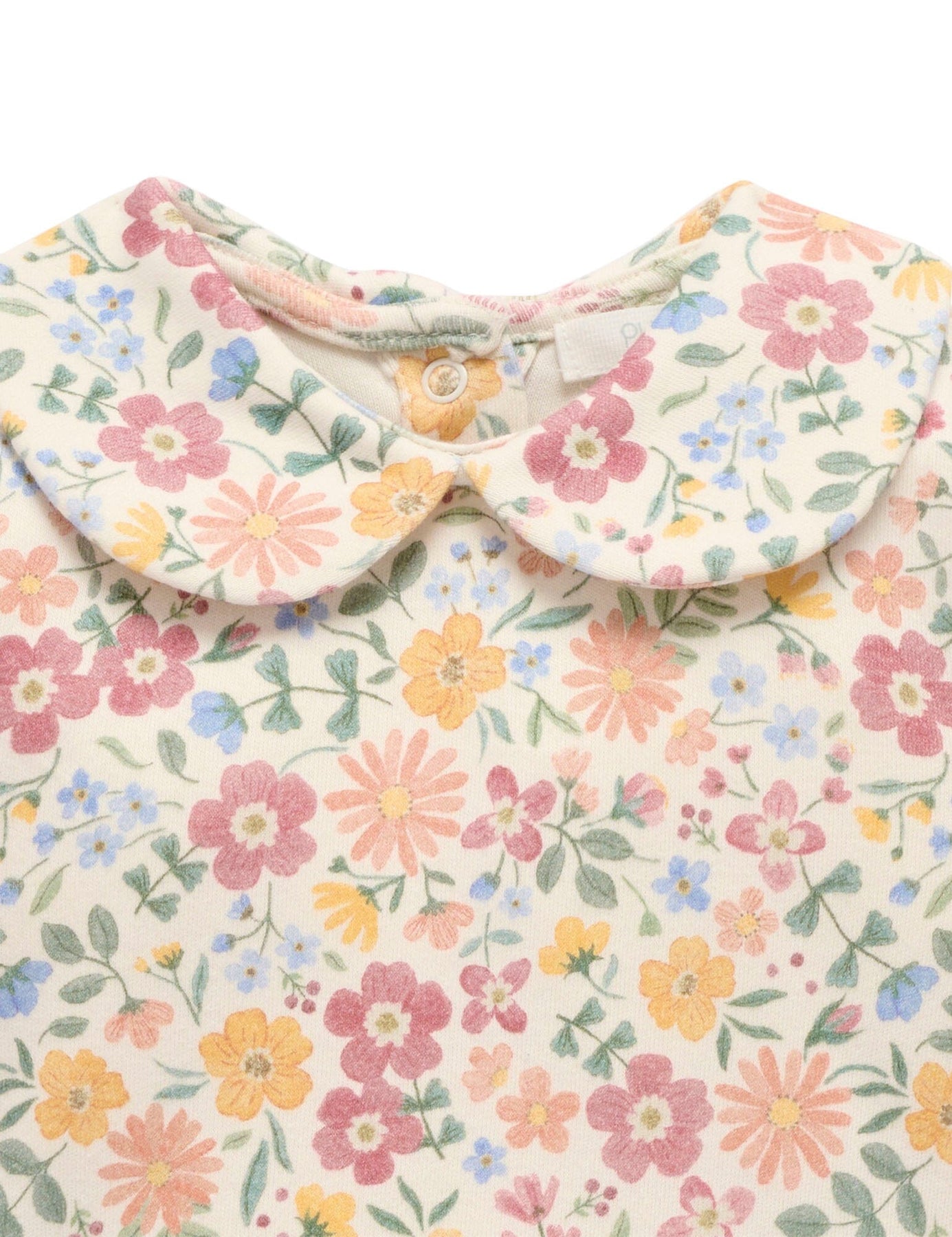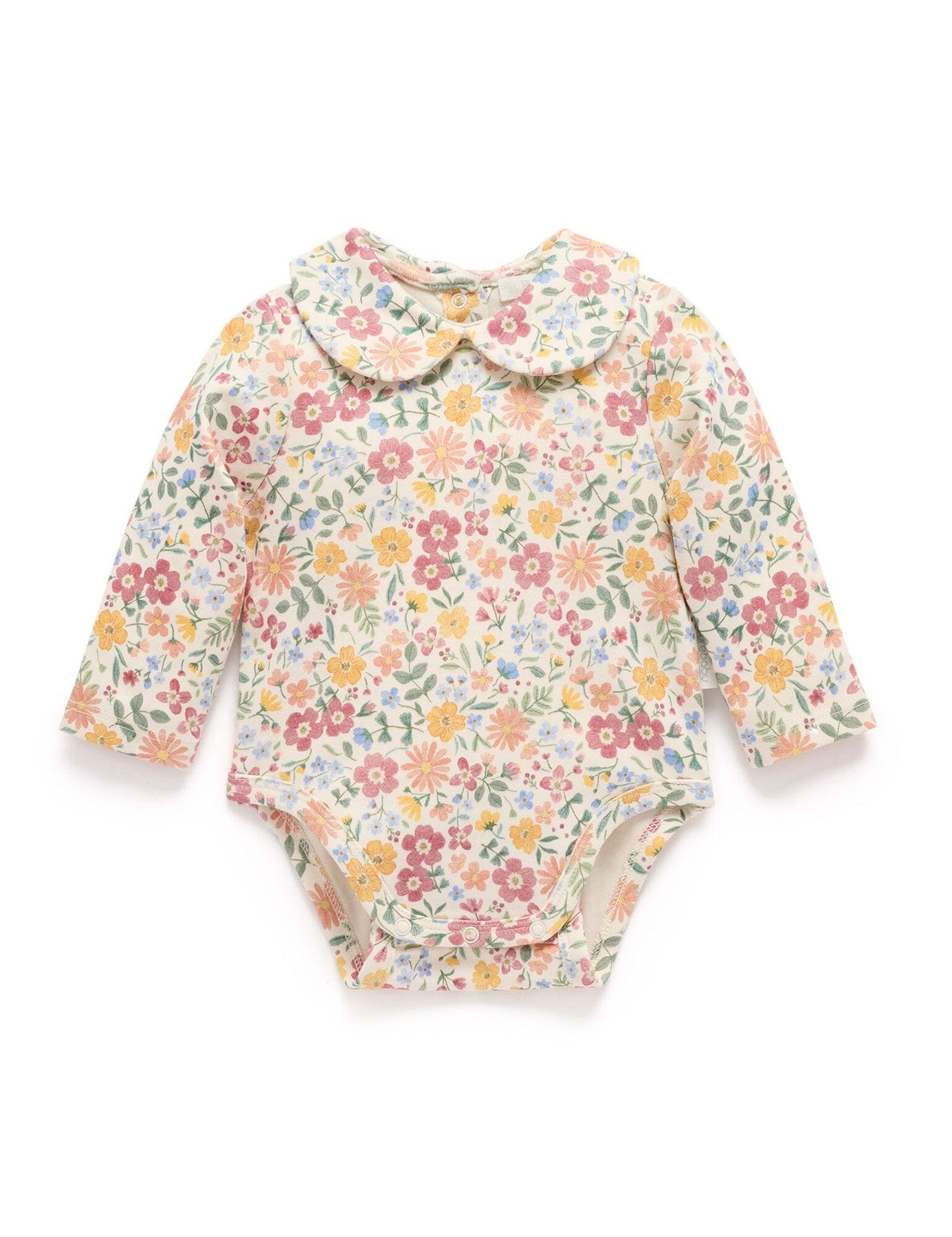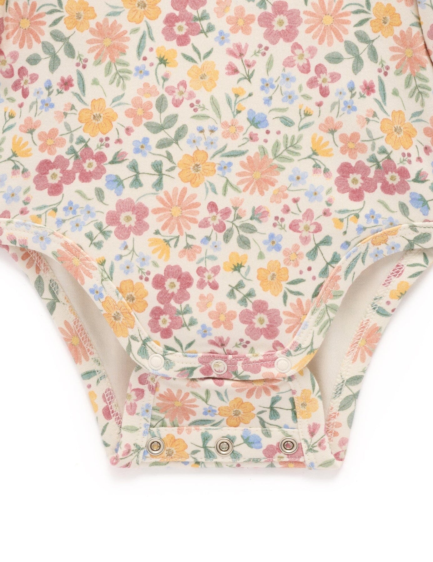 Made from our thick 100% Organic Cotton interlock for a soft, gentle touch against their skin. Layer under our Quilted Overalls for a cute outfit. All over wild flower print Rounded collar Snap clips at the leg with an adjustable fit for growth Snap at the back neck for easy dressing Elasticated leg trimmings for comfort Made from 100% Organic Cotton
