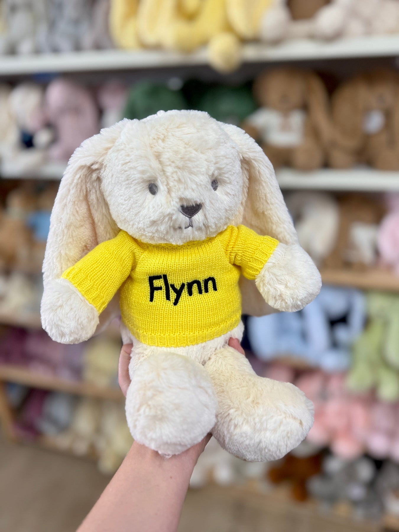 Looking for a unique and adorable way to personalise your Jellycat plush toy? Our knitted jumper with personalisation is the perfect choice - and it even complements the personalisation option for the bunny's ear!