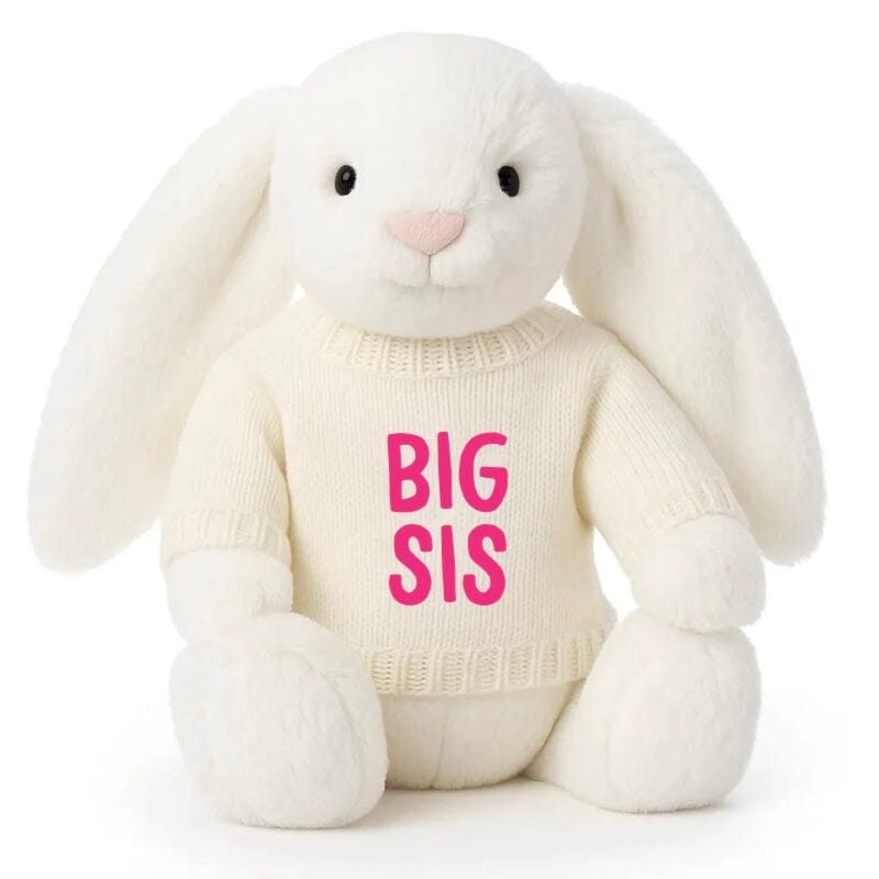 Add an extra touch of charm to your plush toy with this cosy knitted jumper in classic cream. Featuring fucshia embroidery that reads BIG SIS, it’s the perfect piece for becoming a big sister or creating a cute sibling duo. Designed to fit most standard plush toys, this miniature jumper is snug, stylish, and made for cuddles.