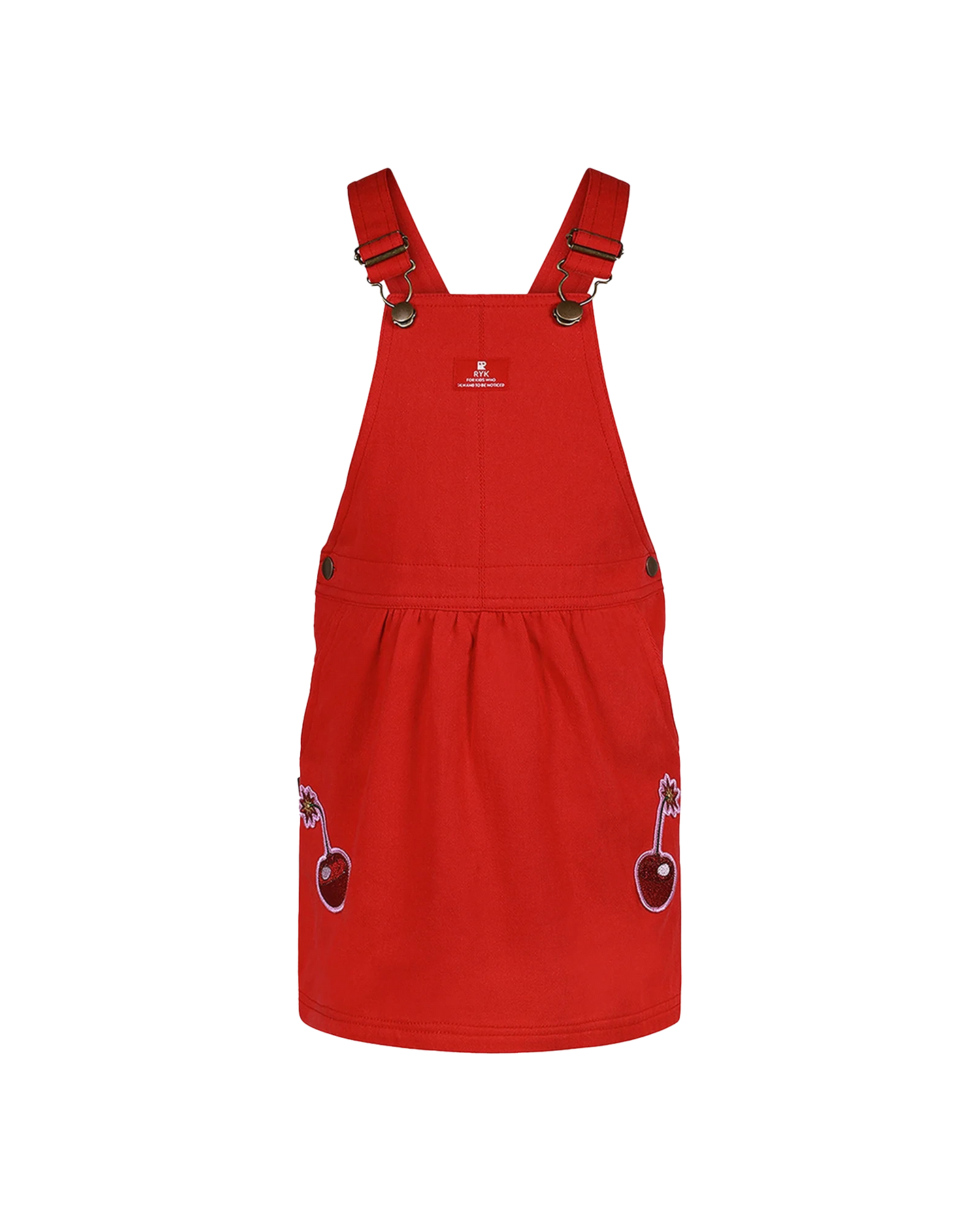 Brighten her wardrobe with the My Cherry Pie Twiggy Pinafore, a girls' pinafore dress in washed red cotton with playful cherry bomb motifs. Designed for easy layering, it features adjustable straps for a comfy fit and functional pockets for treasures. A fun pick for children's clothing, girls' clothing and everyday outfits.