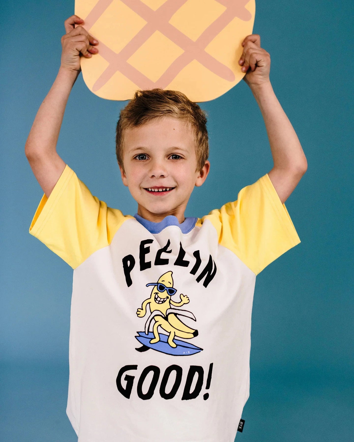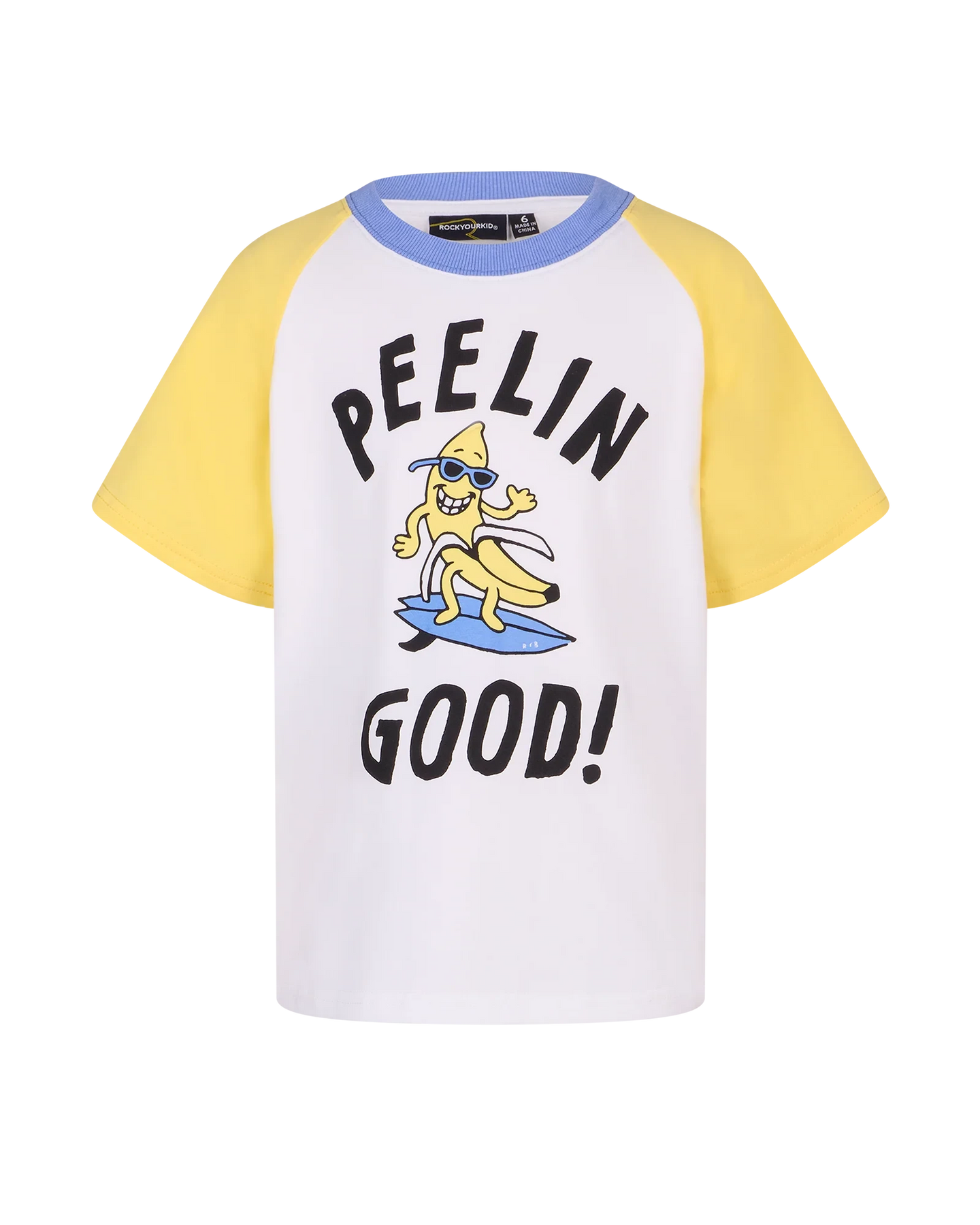 Bring playful fun to summer adventures with the Peelin Good Raglan T-Shirt in cream. Made from soft cotton jersey, it’s breathable and comfortable for all-day wear. The cheeky placement print features a skateboarding banana with the words “I’m Peelin’ Good,” adding humour and personality. Yellow contrast raglan sleeves and a blue rib neckline bring sporty charm. Perfect for park trips, holidays, or casual play, this T-shirt is fun, quirky, and full of summer energy.