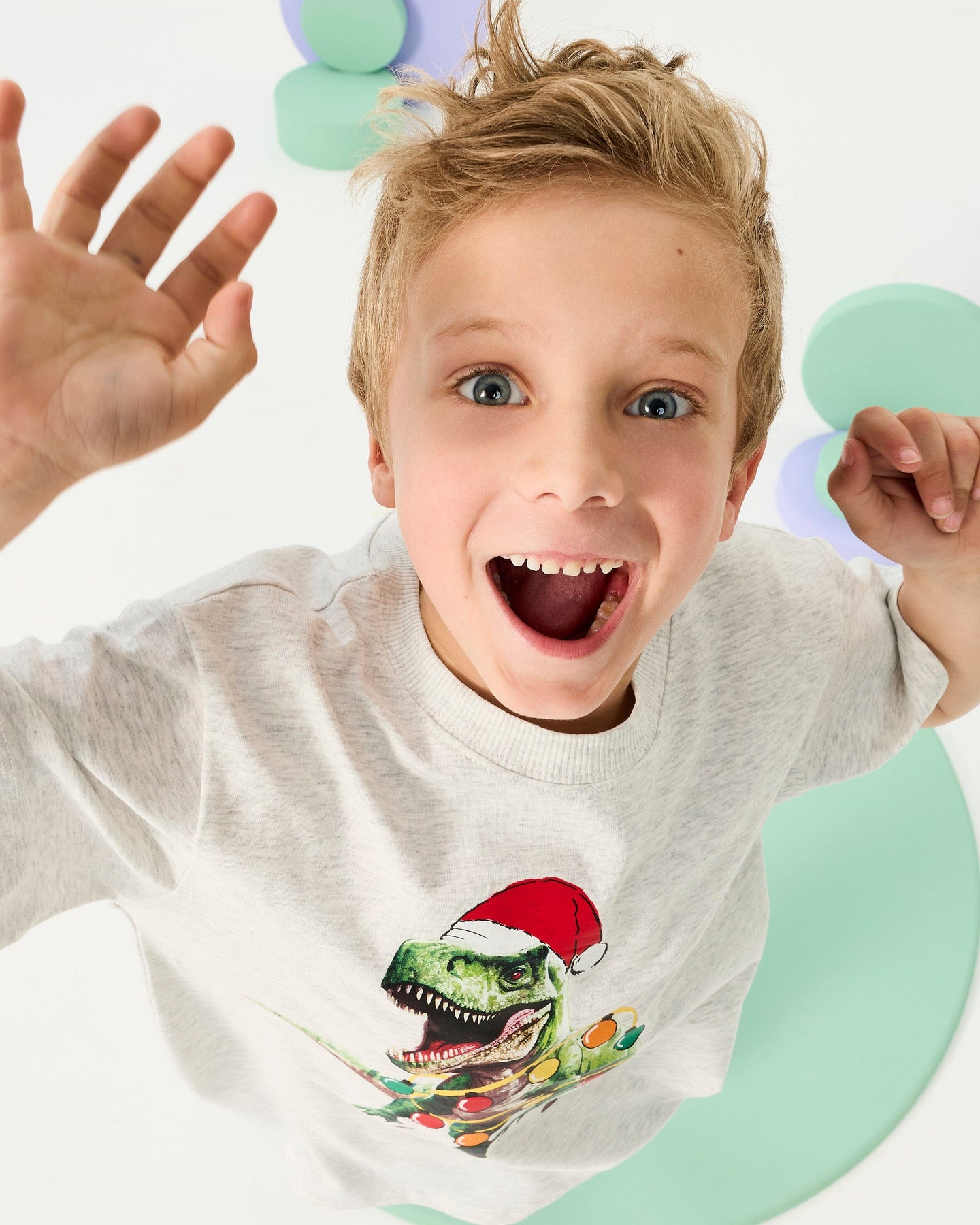 The Rock Your Kid Rock Around The Rex Short Sleeve T-Shirt in grey marle features a T-Rex in Santa hat wrapped in Christmas lights on soft cotton jersey.