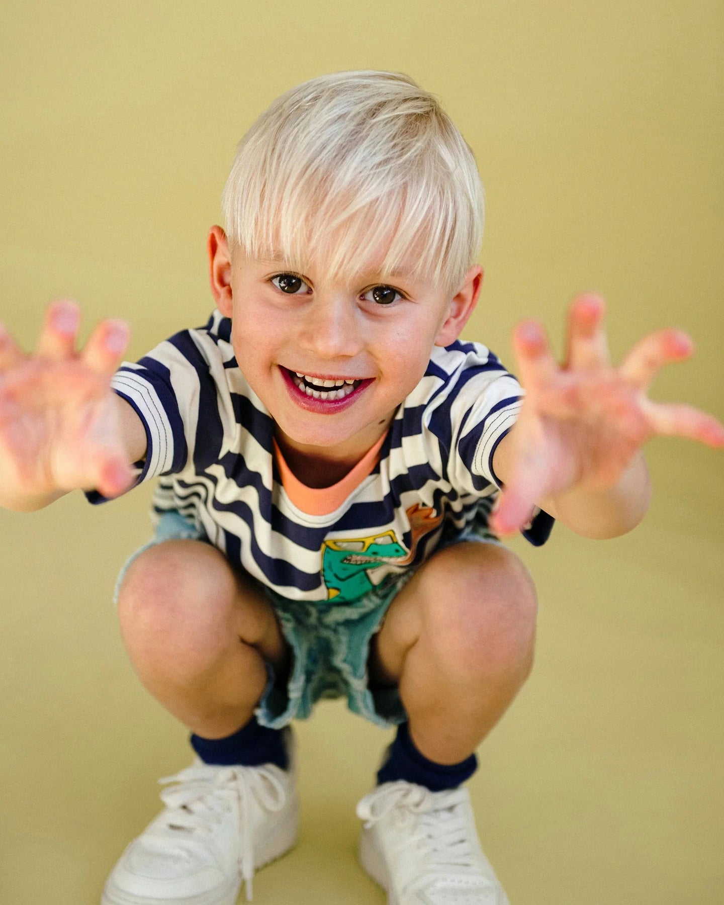 Let your little one ride into summer fun with the Scoota-saurus Short Sleeve T-Shirt. Crafted from soft, breathable jersey, it features navy and white horizontal stripes and a playful placement print of a “cool” T-Rex on a scooter wearing sunglasses. Short sleeves and a contrasting red rib neckline add sporty charm, making it perfect for park play, holidays, or casual outings. Comfortable, fun, and full of personality, it’s a T-shirt kids will love to wear.