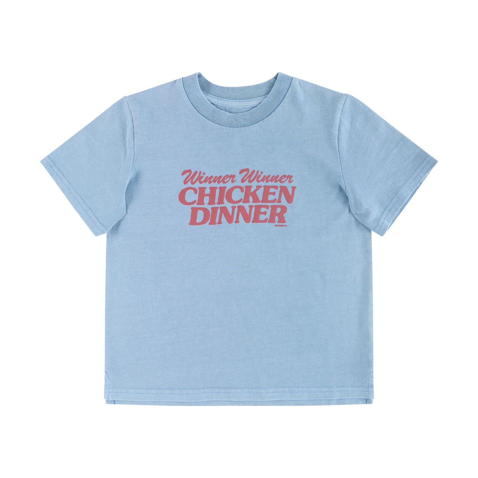 Score big in the Chicken Dinner Kids Slang Tee in Light Blue. Made from 100% cotton, this relaxed-fit tee features a cheeky chest print and ribbed trims for classic ringer style. Perfect for playground adventures, weekend fun or casual days at home, it keeps little ones comfy and cool. Pair with shorts for playful summer-ready style that’s made for endless fun in the sun.
