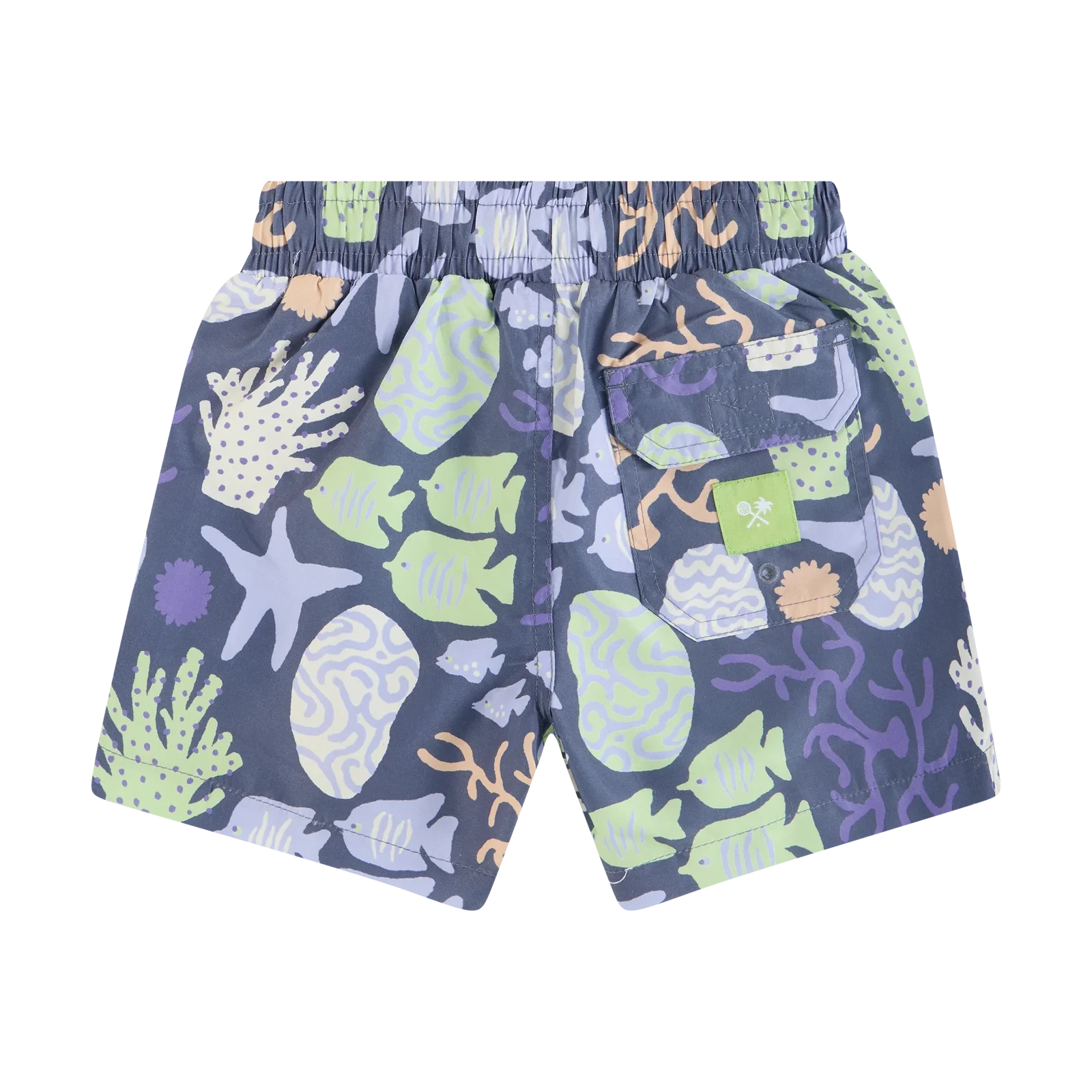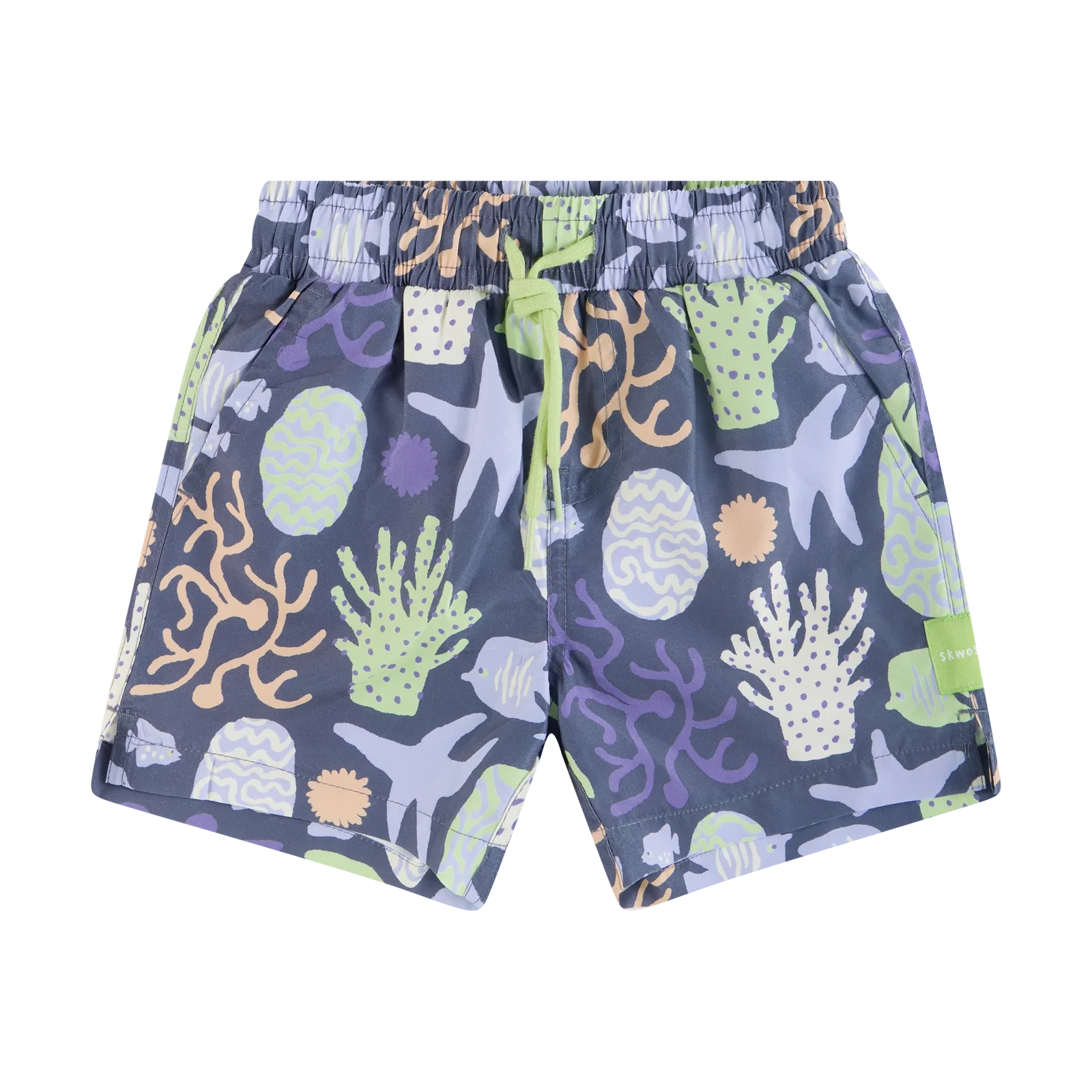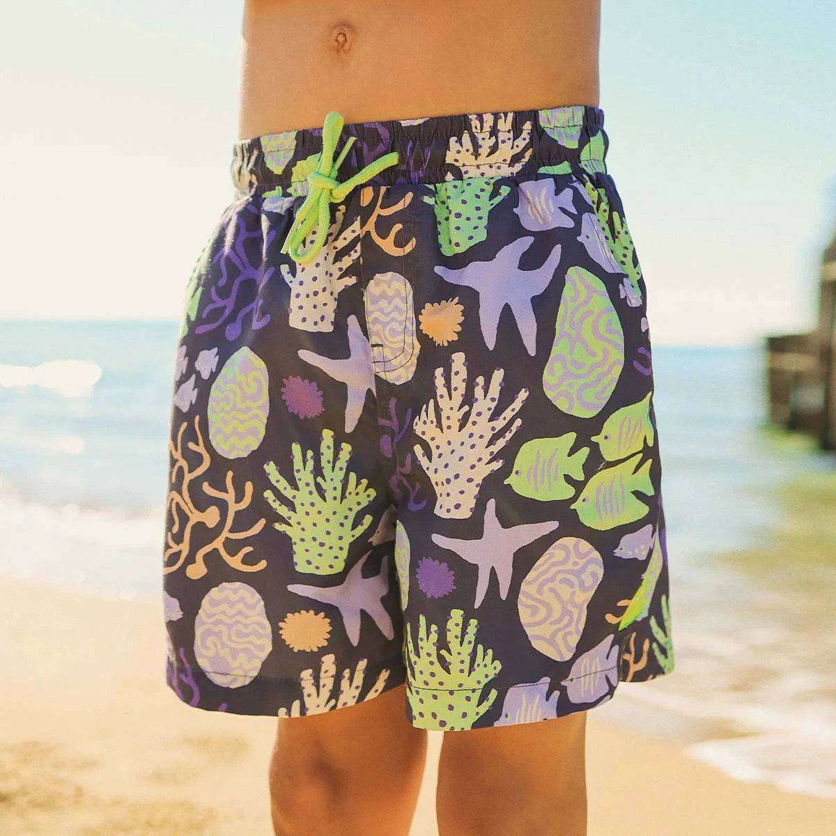 Make waves in the Coral Chaos Boys Swim Shorts in Charcoal. Crafted from quick-dry polyester with an elastic waistband, these relaxed-fit shorts feature coral-inspired print details and side pockets for practical summer style. Perfect for beach trips, poolside fun or weekend adventures, they keep little ones comfortable and ready for action. Pair with a tee for playful summer outfits that make every sunny day more fun.