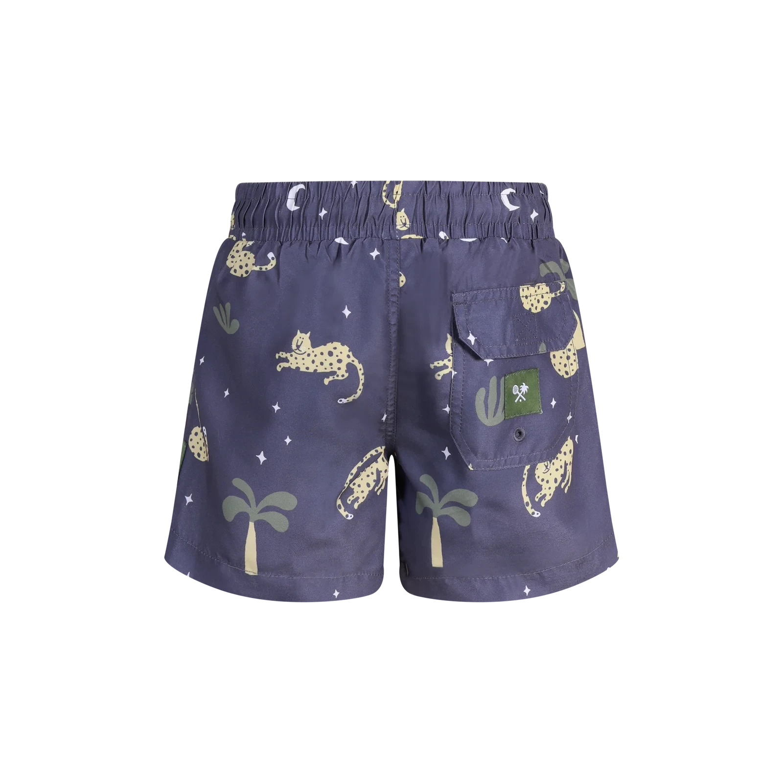 Make a splash with the Leopard Nights Boys Swim Shorts in Charcoal. Made from quick-drying recycled polyester with a supportive mesh brief, these shorts feature a fun hand-drawn leopard and palm tree print. With an elastic drawstring waist, Velcro back pocket with drain eyelet, side pockets, and a sewn-on patch logo, they're perfect for beach days, poolside fun, or sunny summer adventures.