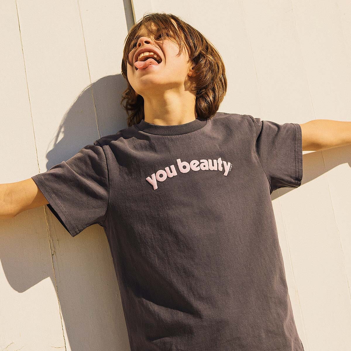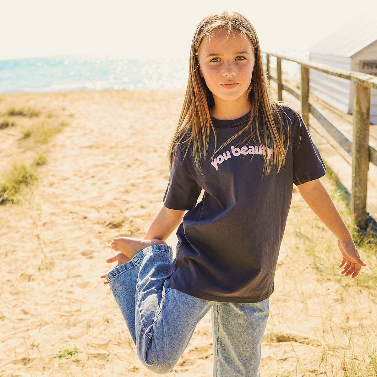 Let your little one wear a smile with the You Beauty Kids Slang Tee in Charcoal. Made from soft, breathable cotton with a comfy regular fit, this tee features a fun puff print Aussie slang slogan on the front. With a high-low hemline and ribbed neckline, it's perfect for playdates, weekend adventures, or relaxed days at home - a cheeky staple for any young wardrobe.