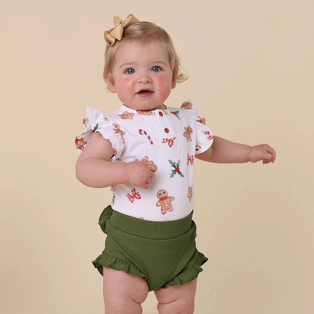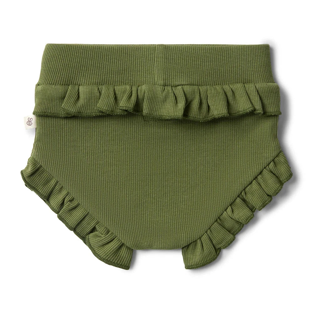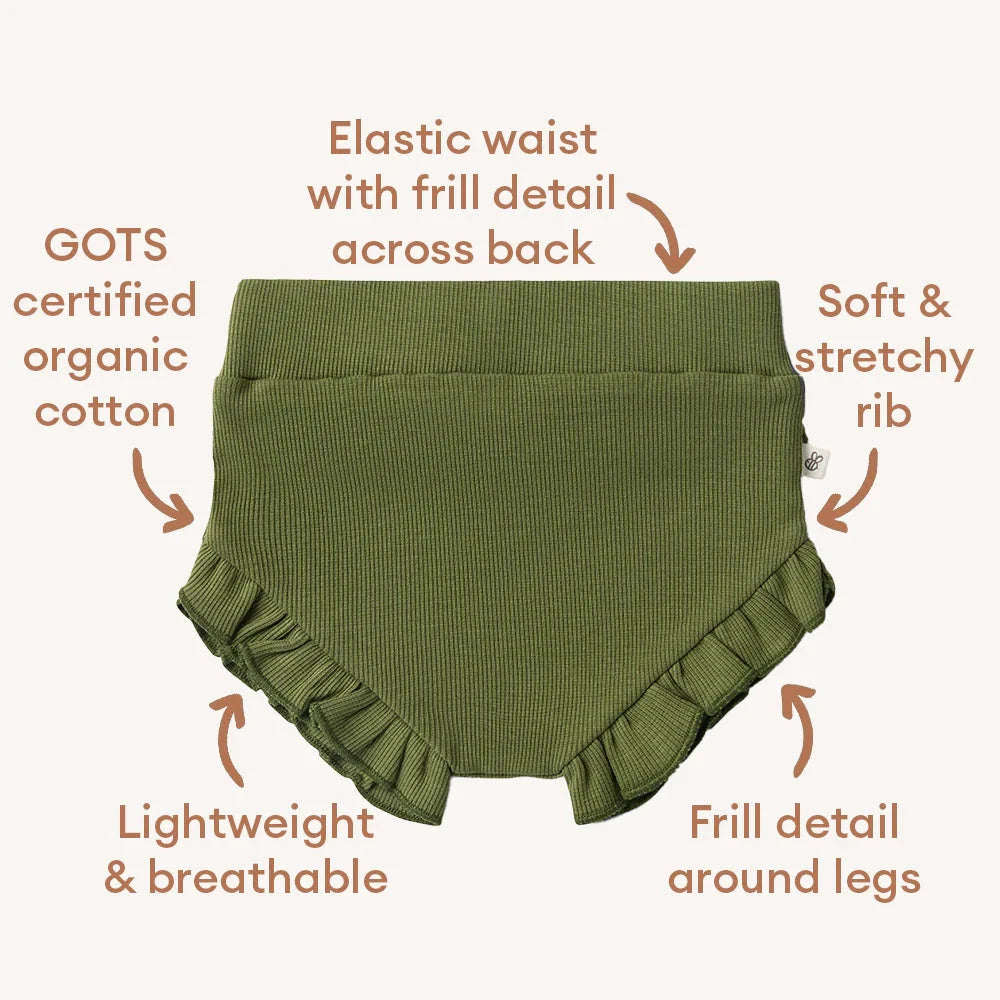 Soft and stretchy, our bloomers are an easy care, fuss-free option that’s simple to coordinate - our Olive bloomers are made with organic cotton rib. They are a perfect match with our organic baby short sleeve bodysuits and will be a go-to bloomer for bub. Our high waist baby bloomers have a gentle, elasticised waistband with a frill across the back and around the legs - for a touch of detail.