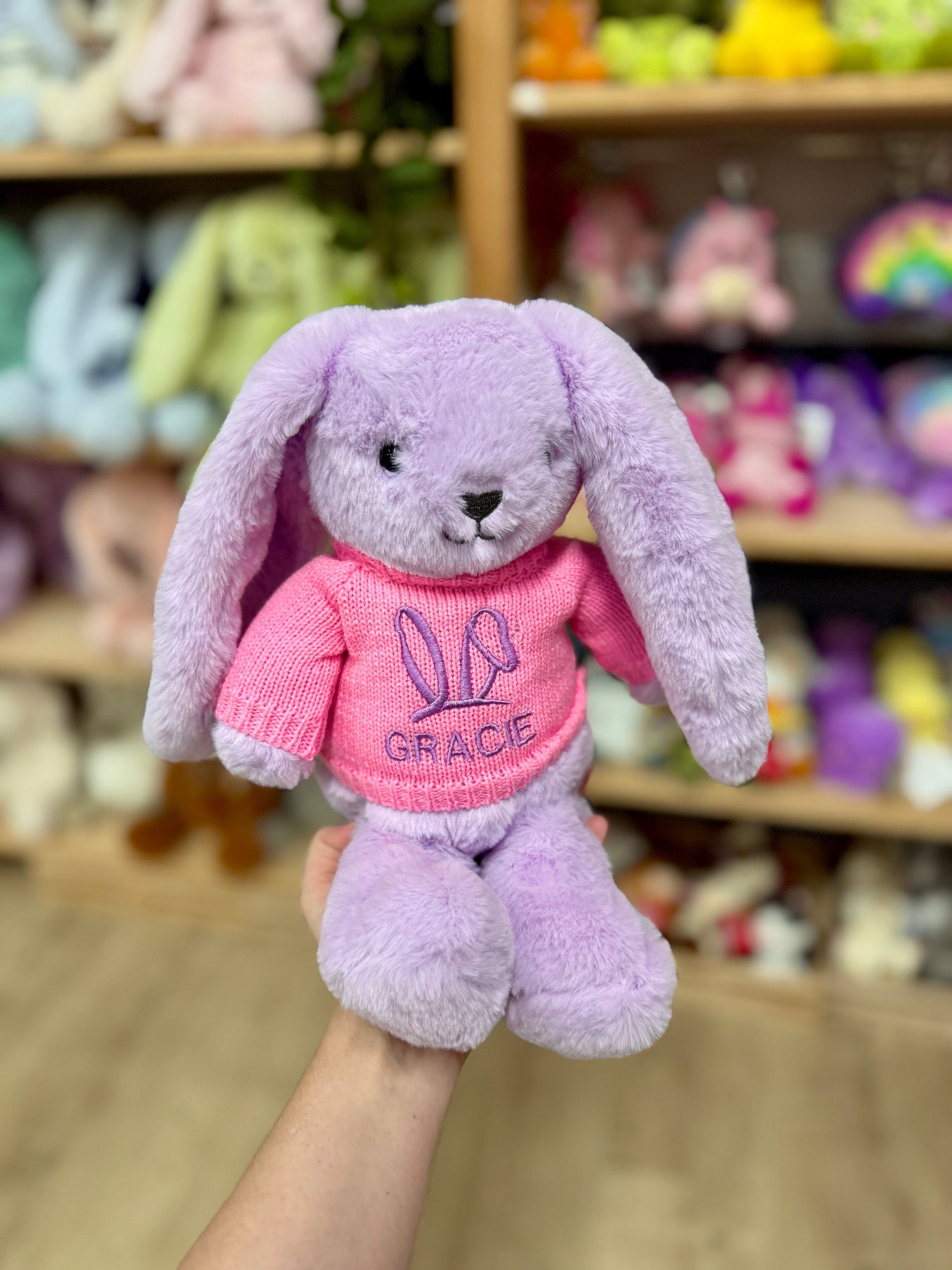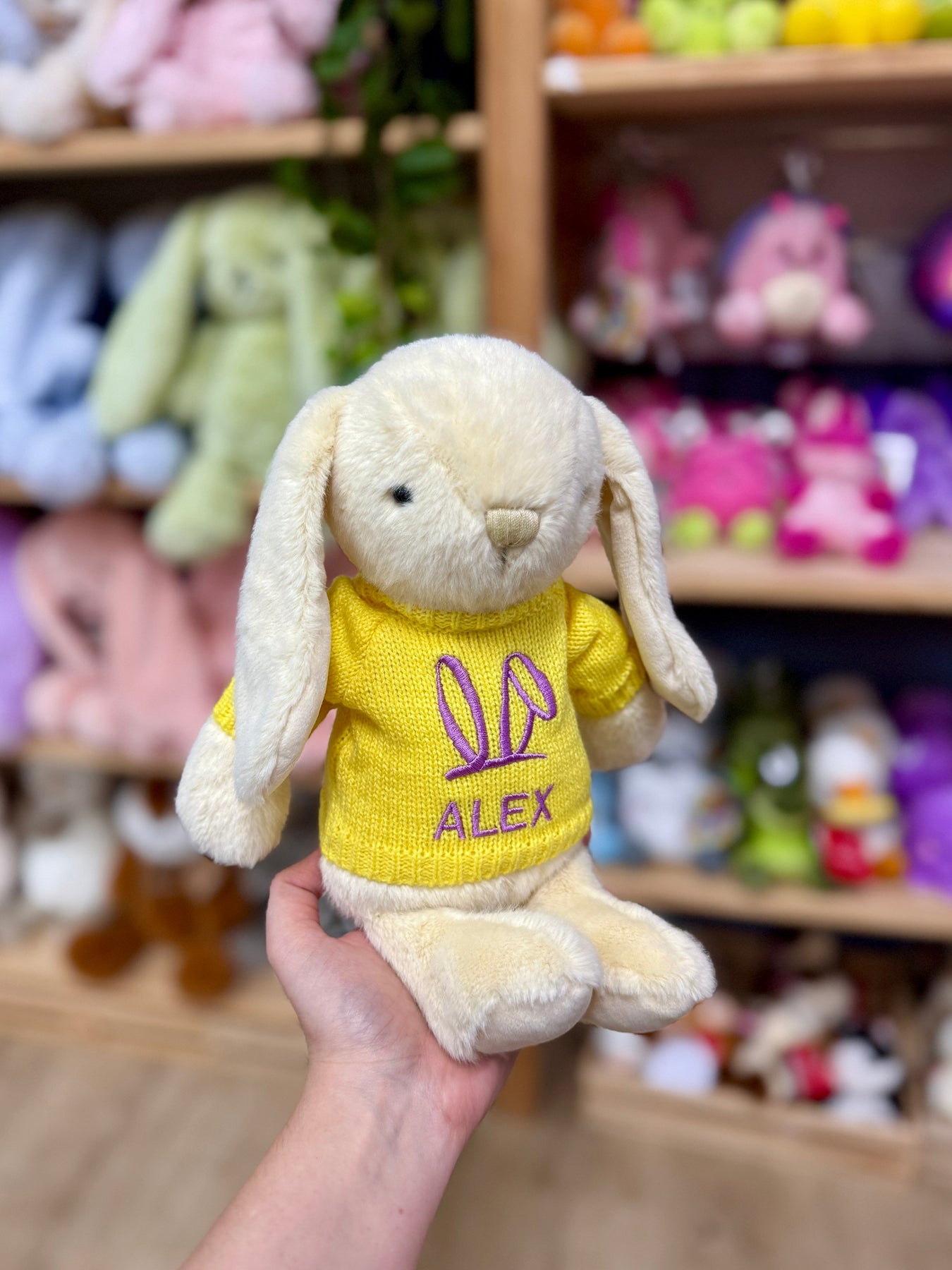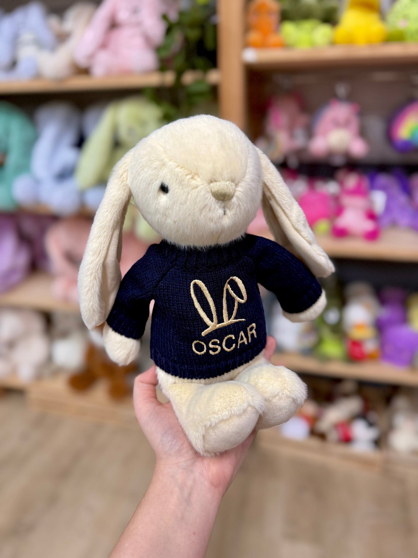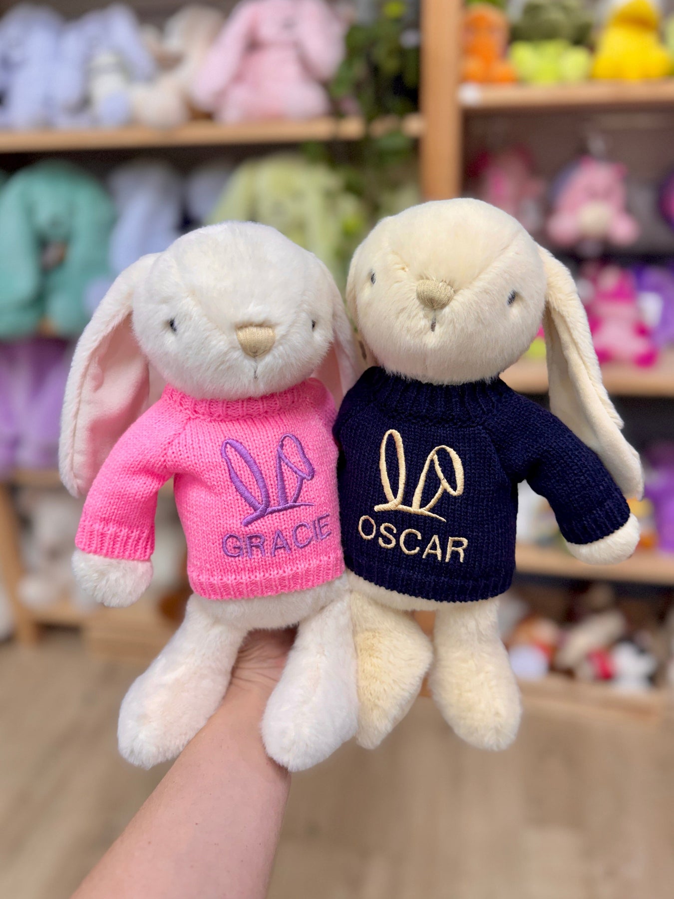 Looking for a unique and adorable way to personalise your plush toy? Our knitted jumper with personalisation is the perfect choice - and it even complements the personalisation option for the bunny's ear!