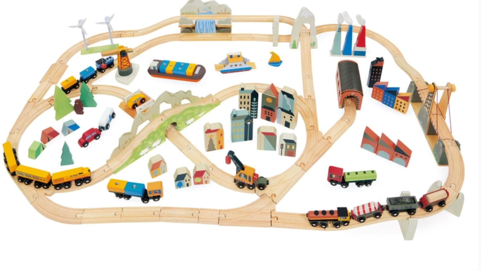 58 pieces of train tracks are included giving children the opportunity to design endless designs of track placement. The set features 3 separate areas; industrial, town and holiday. In the industrial area the following pieces are included: