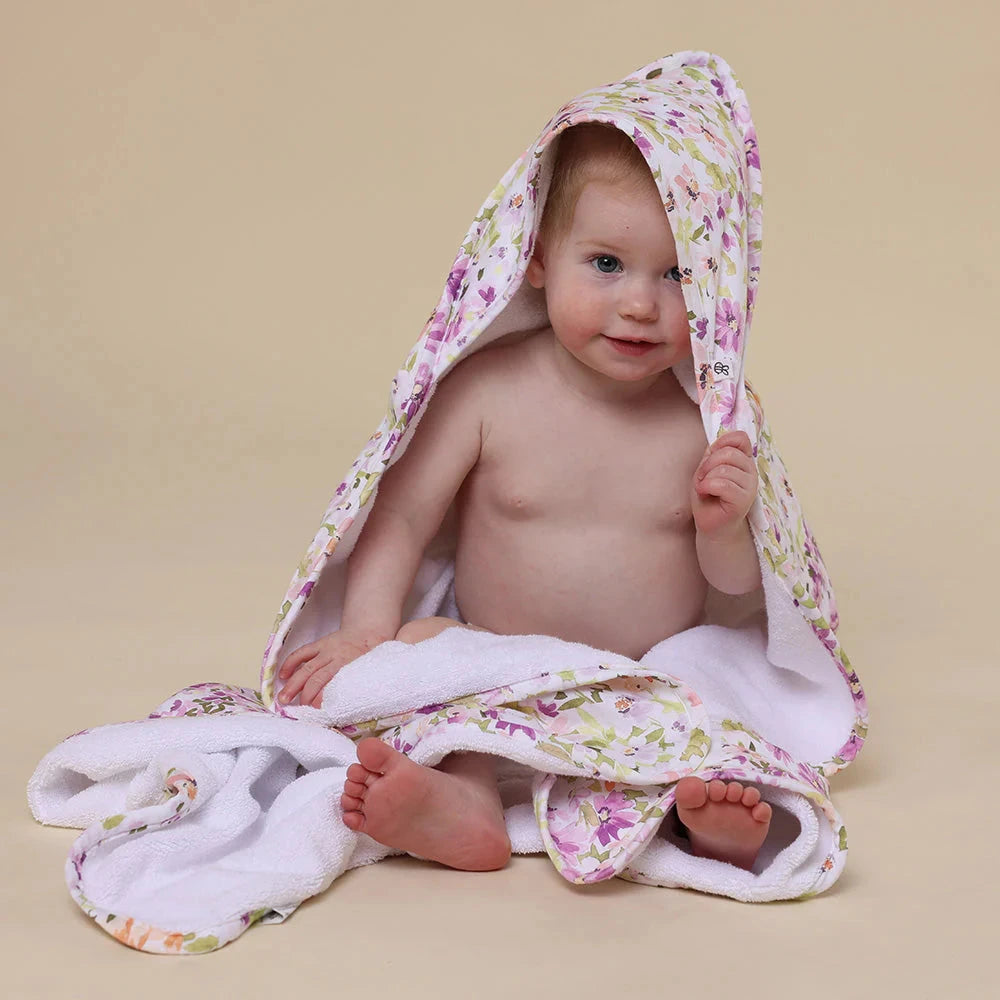 We have designed these unique towels with jersey organic cotton on one side and organic terry towelling on the other side. The jersey side features our exclusive Snuggle Hunny Isla print. The towel is an extra large 90cm x 90cm so ideal for babies through to toddlers.